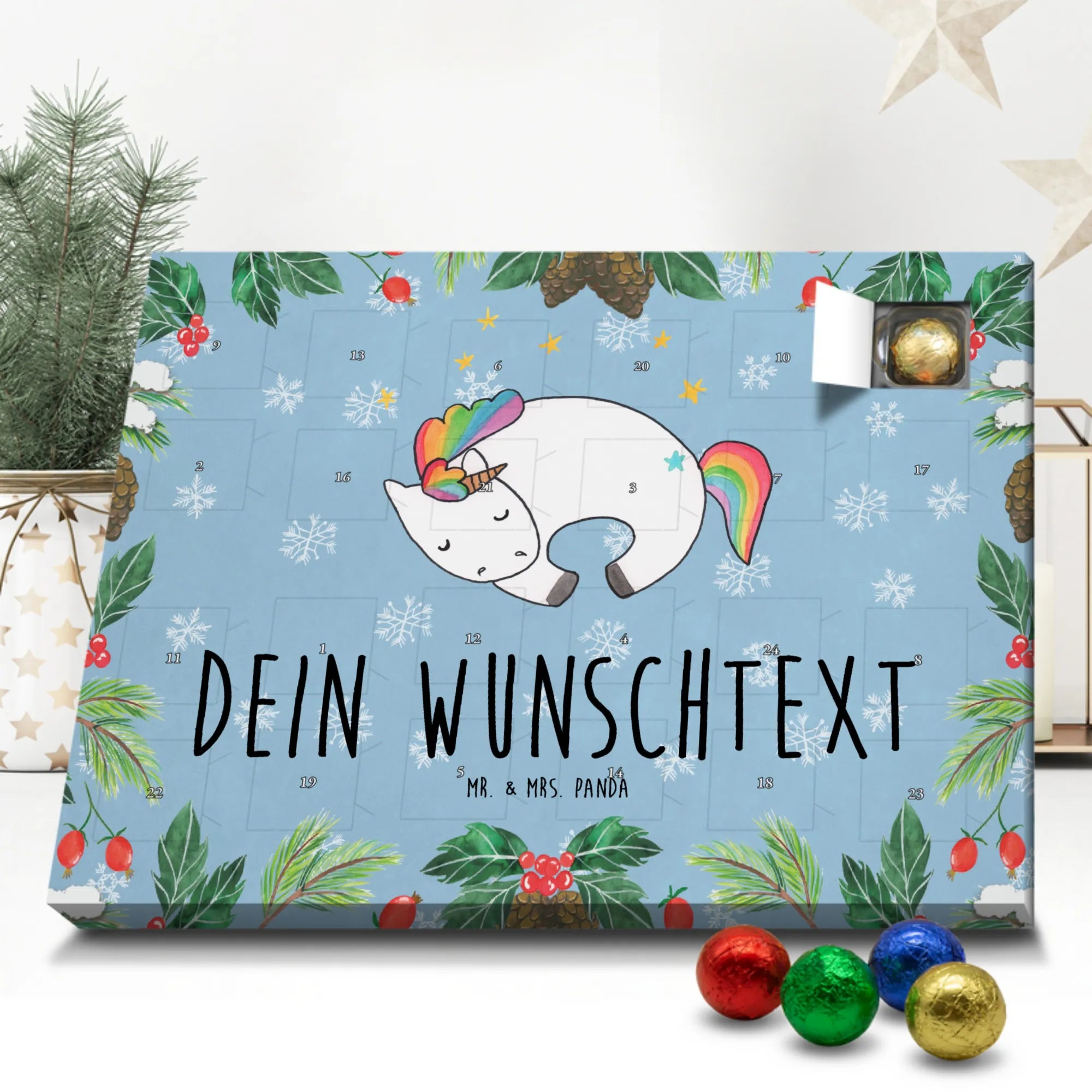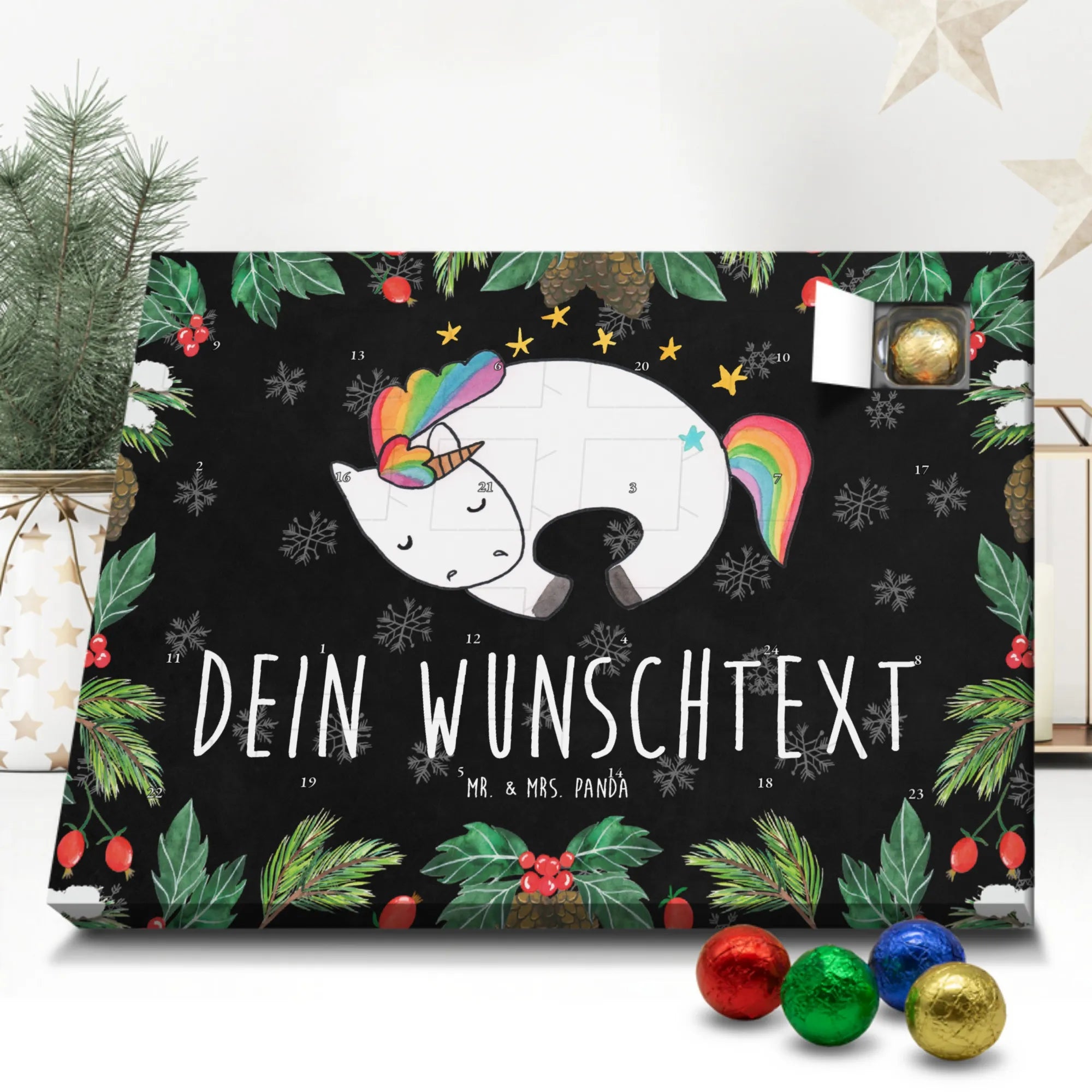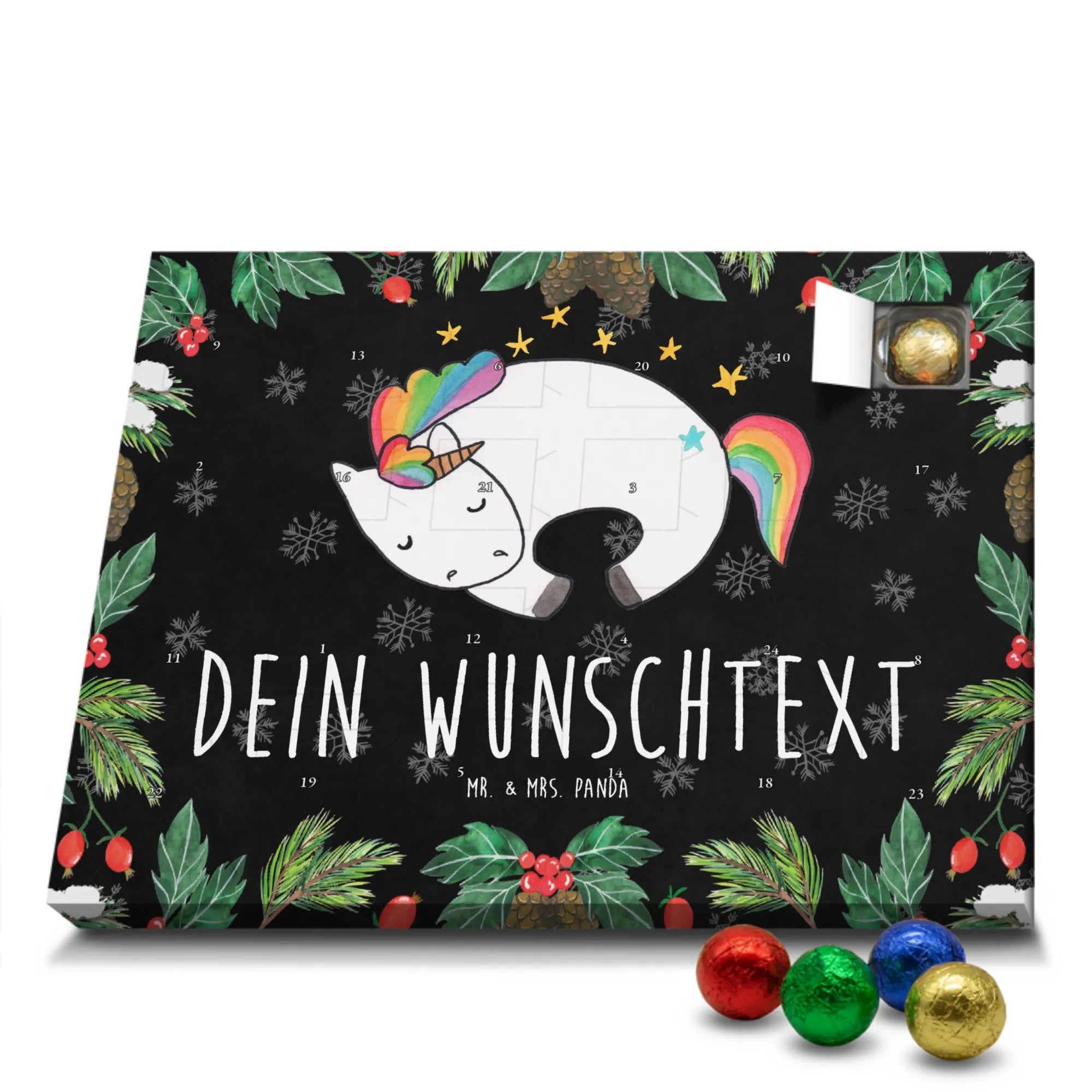 Der Kalender ist personalisierbar mit Deinem Wunschnamen und wird so zum Unikat. Gefüllt mit leckeren Schokoladenkugeln (gefüllt mit Markenschokolade) zaubert er jeden Morgen im Dezember ein kleines Lächeln auf das Gesicht der Beschenkten. Die seidenmatte Oberflächenveredelung und die bedruckten Seitenflächen sorgen für eine edle Optik, die sich wunderbar in Einhorn Deko, Kinderzimmer oder Wohnbereiche einfügt.