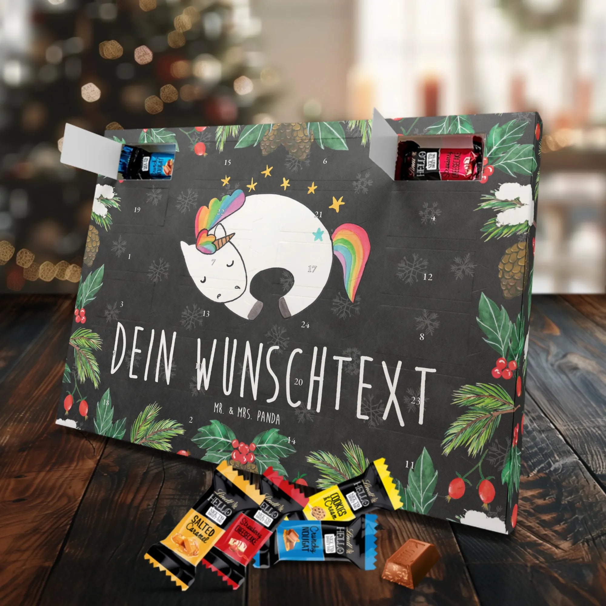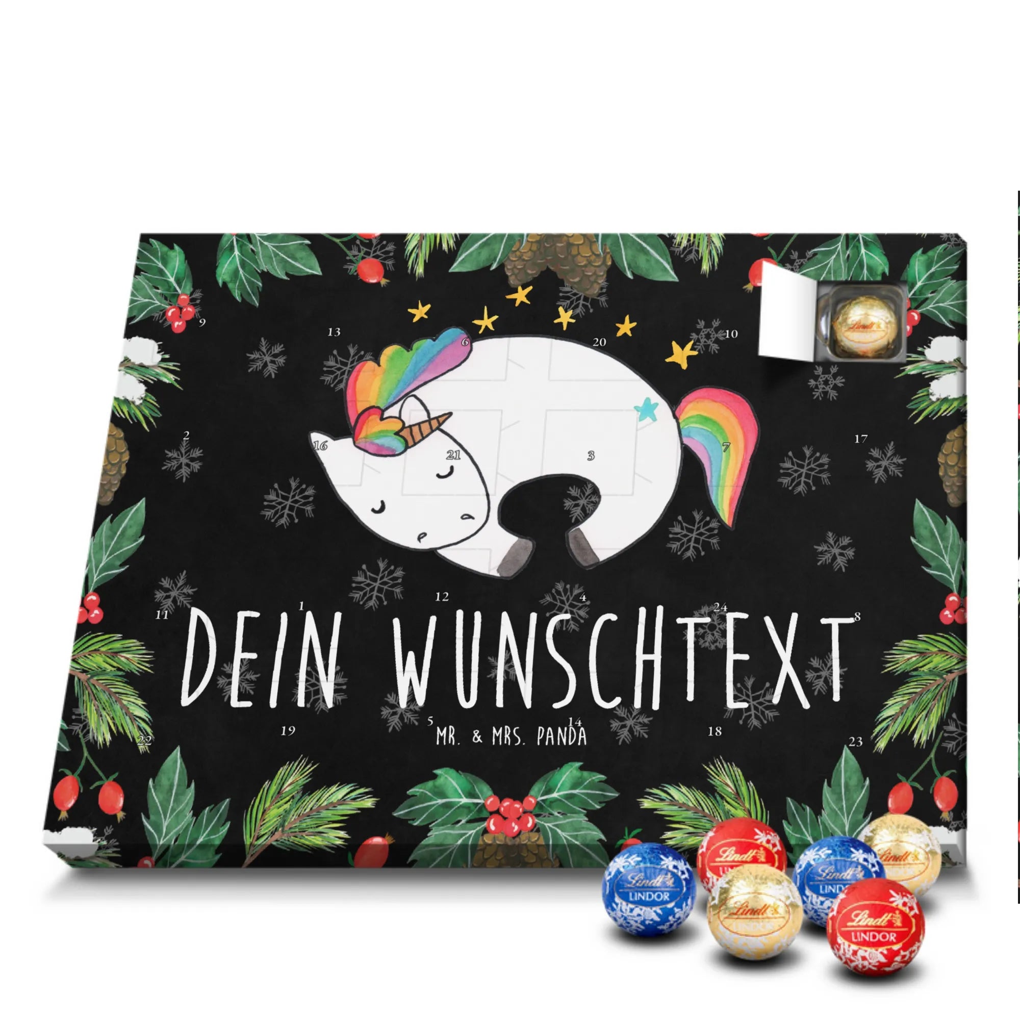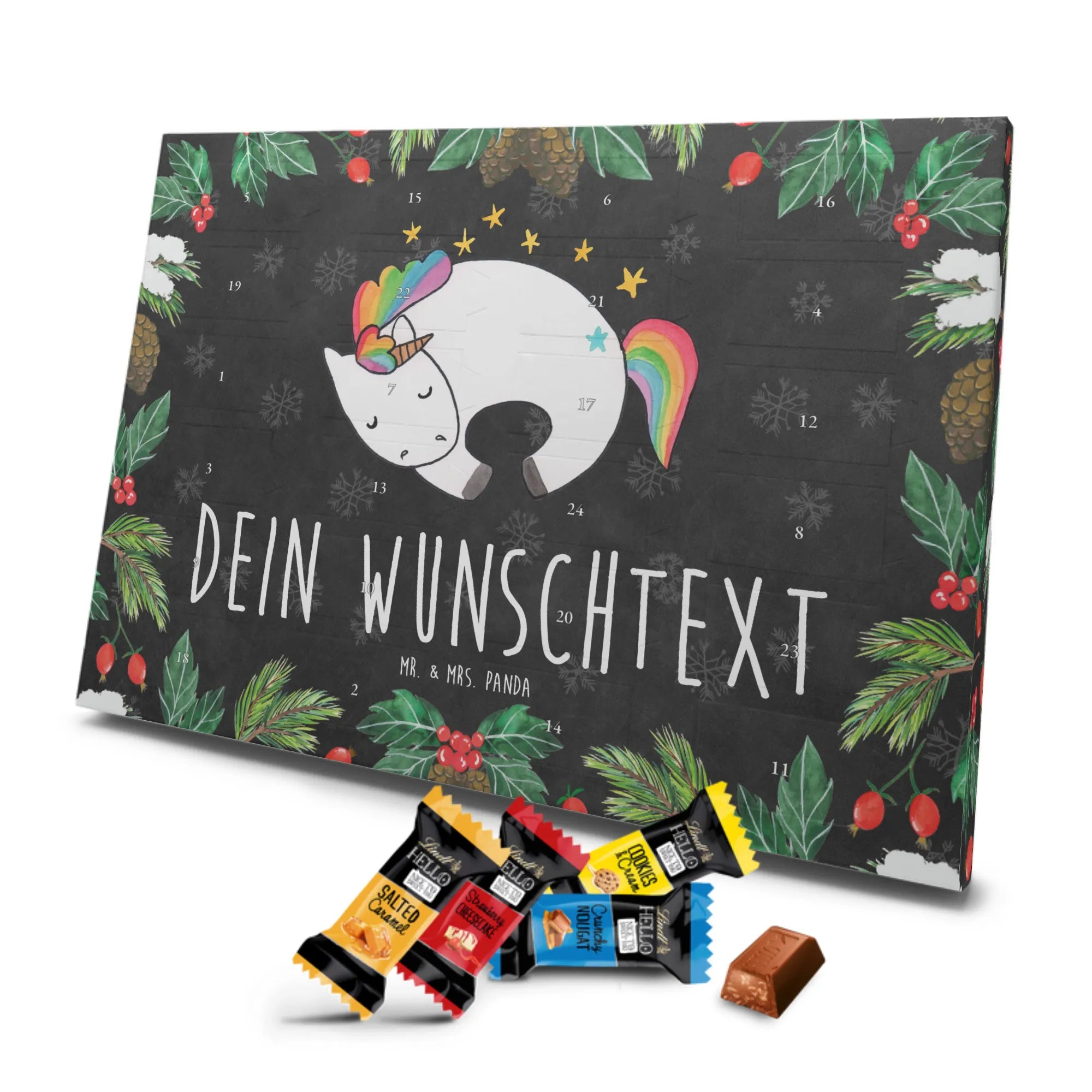 Individueller Schoko Adventskalender von Mr. & Mrs. Panda – das perfekte, persönliche Geschenk für die Adventszeit! Dieser Kalender wurde liebevoll gestaltet, mit fröhlichen Motiven und charmanten Sprüchen bedruckt und lässt sich mit deinem Wunschnamen oder einem individuellen Text versehen. Die brillante Druckqualität gepaart mit seidenmatter Oberflächenveredelung verleiht dem Kalender einen edlen Look; auch die Seitenflächen sind bedruckt, damit das Design rundum stimmig ist. Maße: 233 mm x 178 mm x 24 mm. Praktisch: Du kannst den Kalender aufstellen oder an der Wand aufhängen – ganz nach deinem Geschmack. Gefüllt mit Lindt Lindor Schokolade: 24 einzeln verpackte Markenschokoladen Kugeln in drei verführerischen Sorten. Geschmacksrichtungen: Vollmilch, Feinherb und Weiße Schokolade. Zutaten: Zucker, pflanzliches Fett (Kokosnuss, Palmkern), Kakaobutter, Vollmilchpulver, Kakaomasse, Milchzucker, Magermilchpulver, Butterreinfett, Emulgator (Sojalecithin), Gerstenmalzextrakt, Aromen. Besondere Hinweise: Kann Haselnüsse und Mandeln enthalten. Überrasche deine Liebsten mit einem persönlichen Adventskalender voller kleiner Schoko-Momente und viel Vorfreude.