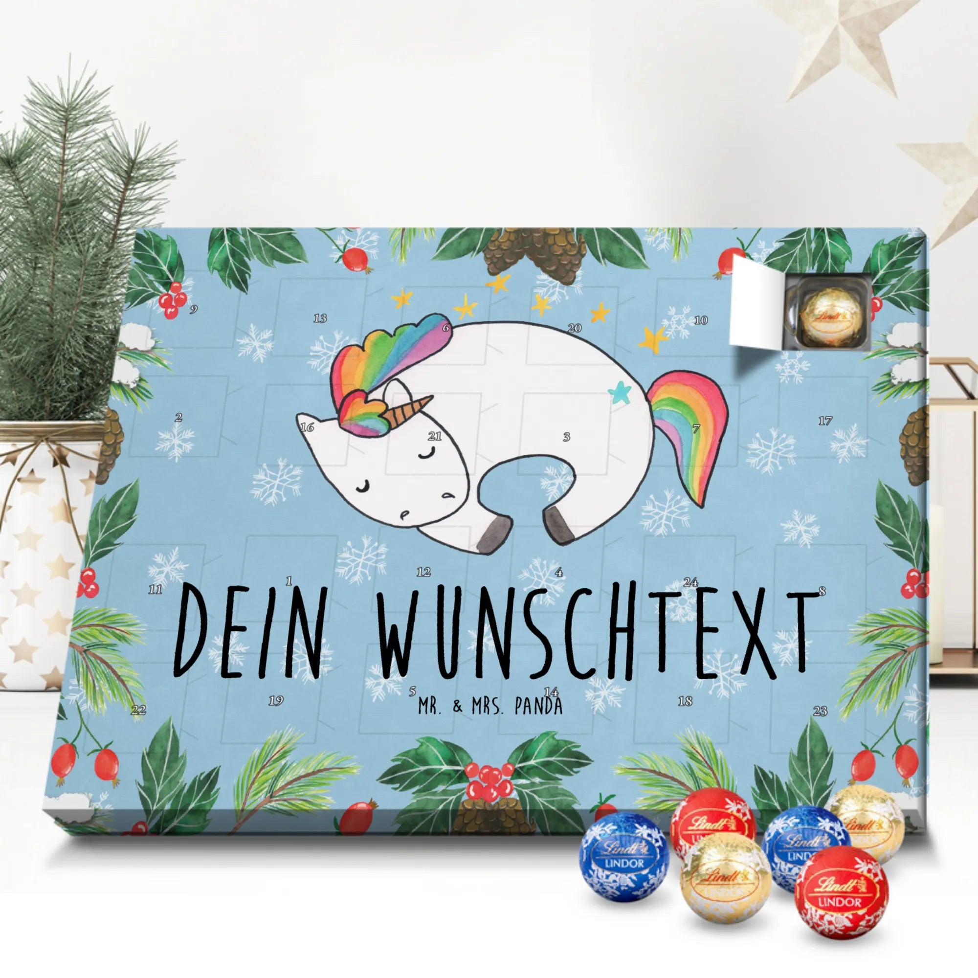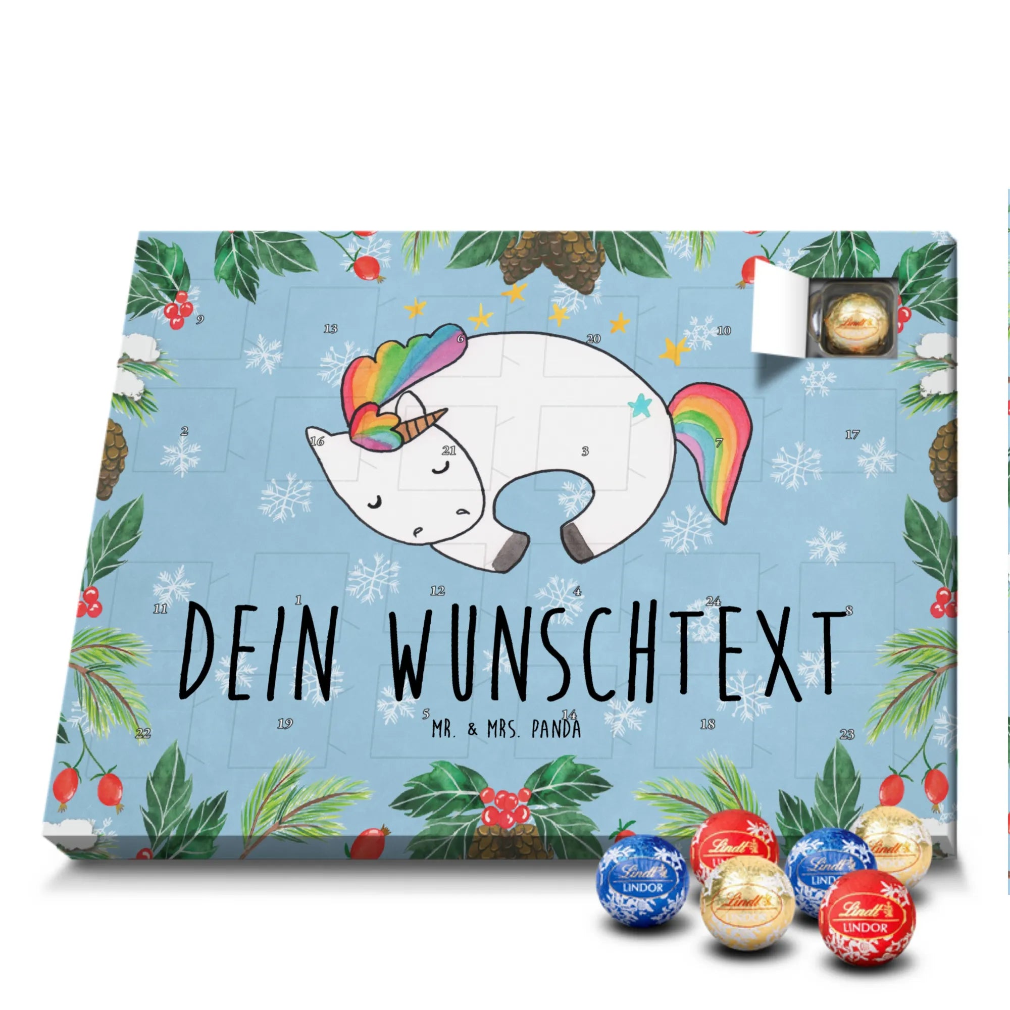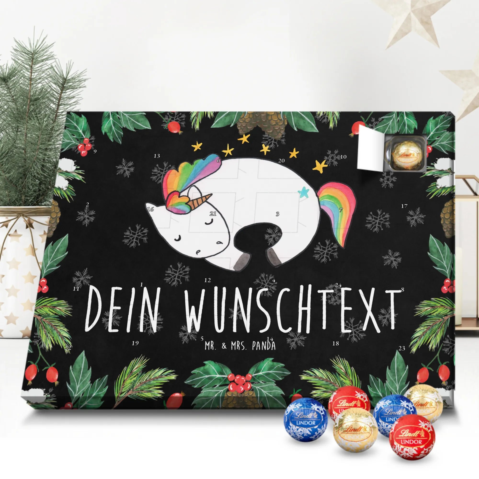 Individueller Schoko Adventskalender von Mr. & Mrs. Panda – das perfekte, persönliche Geschenk für die Adventszeit! Dieser Kalender wurde liebevoll gestaltet, mit fröhlichen Motiven und charmanten Sprüchen bedruckt und lässt sich mit deinem Wunschnamen oder einem individuellen Text versehen. Die brillante Druckqualität gepaart mit seidenmatter Oberflächenveredelung verleiht dem Kalender einen edlen Look; auch die Seitenflächen sind bedruckt, damit das Design rundum stimmig ist. Maße: 233 mm x 178 mm x 24 mm. Praktisch: Du kannst den Kalender aufstellen oder an der Wand aufhängen – ganz nach deinem Geschmack. Gefüllt mit Lindt Lindor Schokolade: 24 einzeln verpackte Markenschokoladen Kugeln in drei verführerischen Sorten. Geschmacksrichtungen: Vollmilch, Feinherb und Weiße Schokolade. Zutaten: Zucker, pflanzliches Fett (Kokosnuss, Palmkern), Kakaobutter, Vollmilchpulver, Kakaomasse, Milchzucker, Magermilchpulver, Butterreinfett, Emulgator (Sojalecithin), Gerstenmalzextrakt, Aromen. Besondere Hinweise: Kann Haselnüsse und Mandeln enthalten. Überrasche deine Liebsten mit einem persönlichen Adventskalender voller kleiner Schoko-Momente und viel Vorfreude.