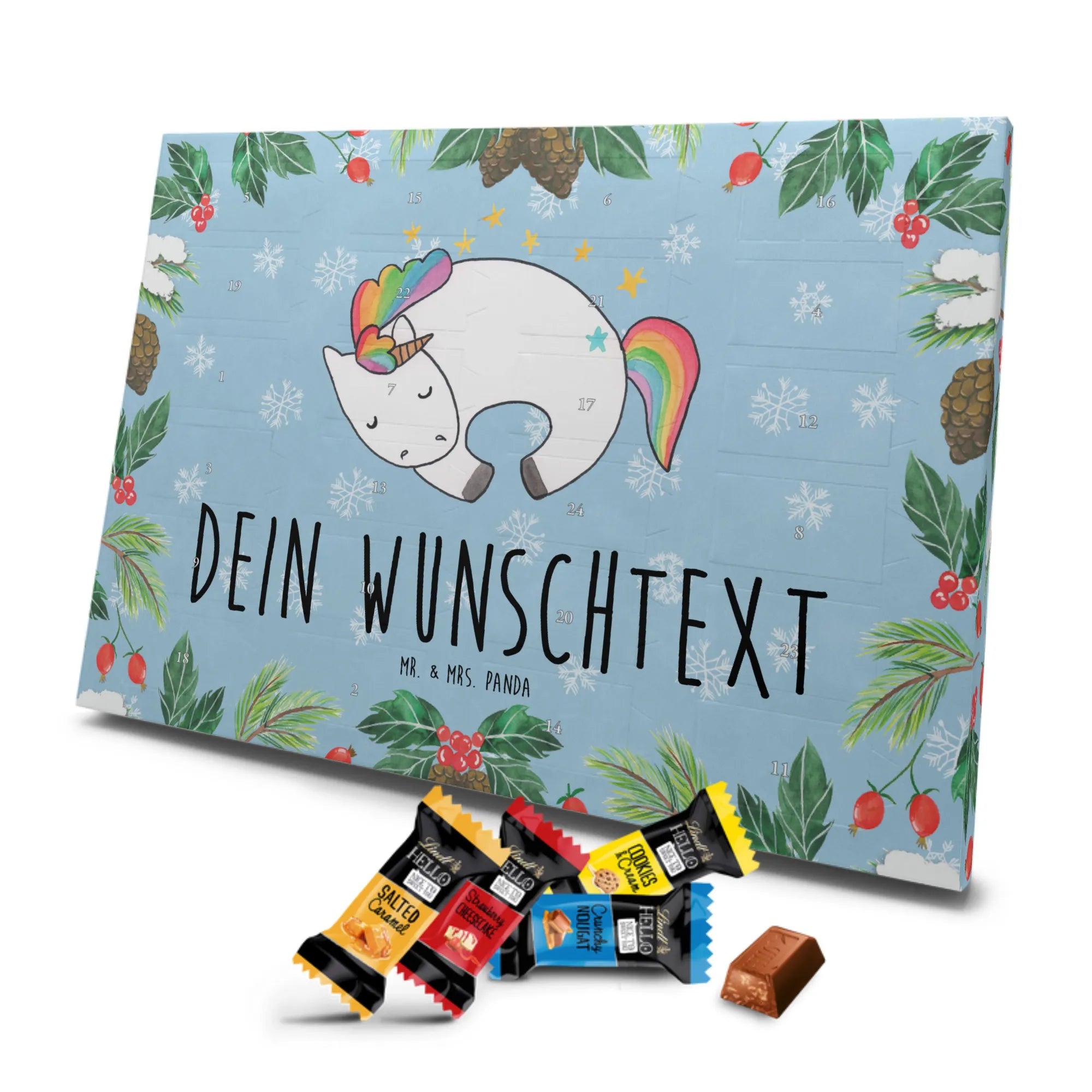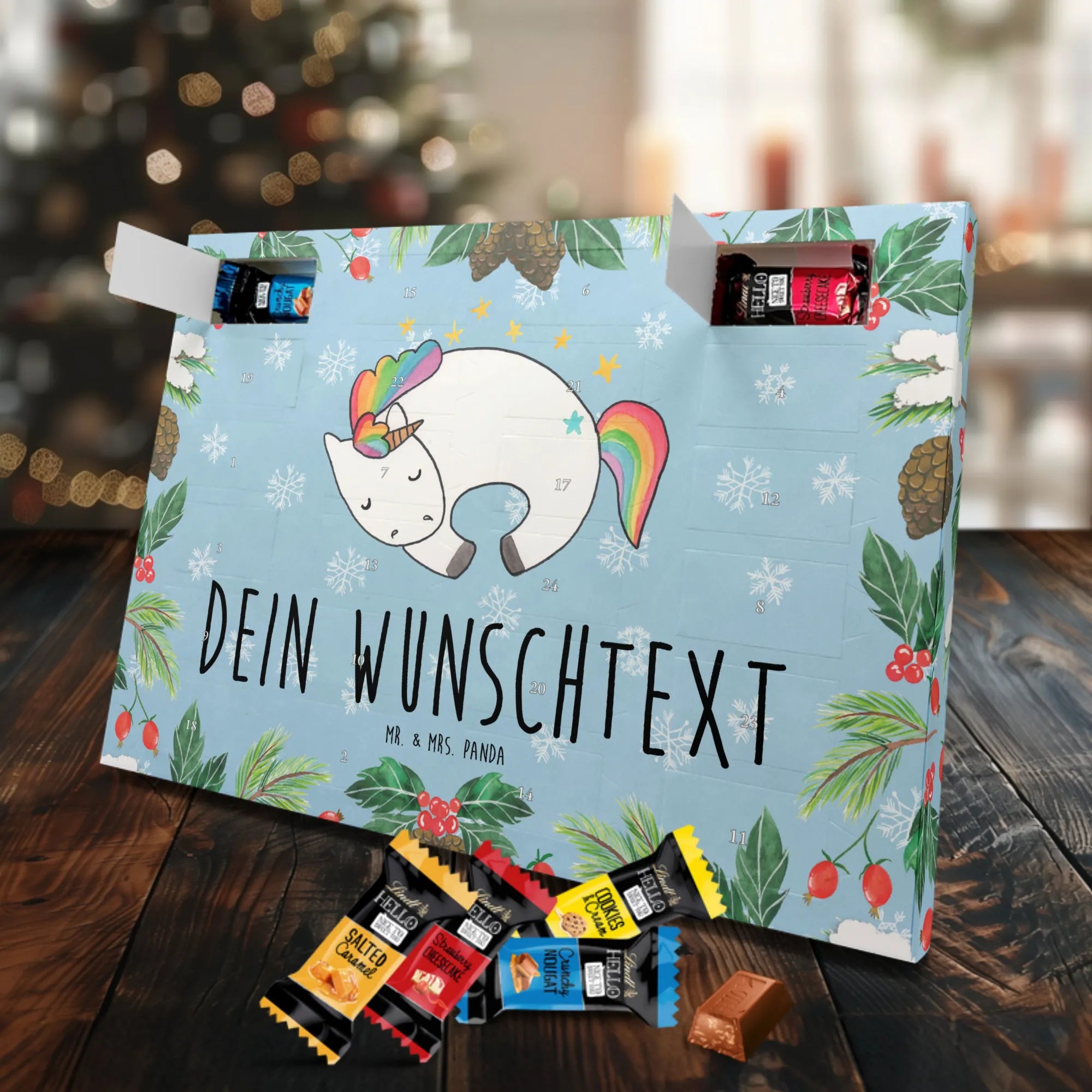 Unser Personalisierter Schoko-Adventskalender von Mr. & Mrs. Panda bringt Freude ins Adventsfenster und zaubert jedem ein Lächeln aufs Gesicht. Du gestaltest ihn ganz individuell: wähle deinen Wunschtext oder Namen und wir drucken ihn auf den Kalender – inklusive bedruckter Seitenflächen für ein rundum schönes Ergebnis. Die seidenmatte Oberflächenveredelung sorgt für eine elegante Haptik, während die brillante Druckqualität die Motive zum Strahlen bringt. Der Kalender ist flexibel einsetzbar, denn er kann aufgehängt oder einfach aufgestellt werden. Gefüllt mit Lindt Hello: 24 einzelne Schokoladen Mini Sticks in vier leckeren Geschmacksrichtungen (Karamell-Schokoladenkuchen, Kekse, Knuspriger Nougat, Erdbeer-Cheesecake). Zutaten und Allergene (Milcheiweiß, Milchzucker, Soja, Weizen, Haselnüsse; kann Mandeln und andere Schalenfrüchte enthalten) sind ausgewiesen. Ideal als persönliches Geschenk für Familienmitglieder, Freundinnen oder für dich selbst – mit viel Liebe gestaltet von Mr. & Mrs. Panda. Maße: 325 mm x 225 mm x 27 mm, praktische Größe für Regal oder Wand.
