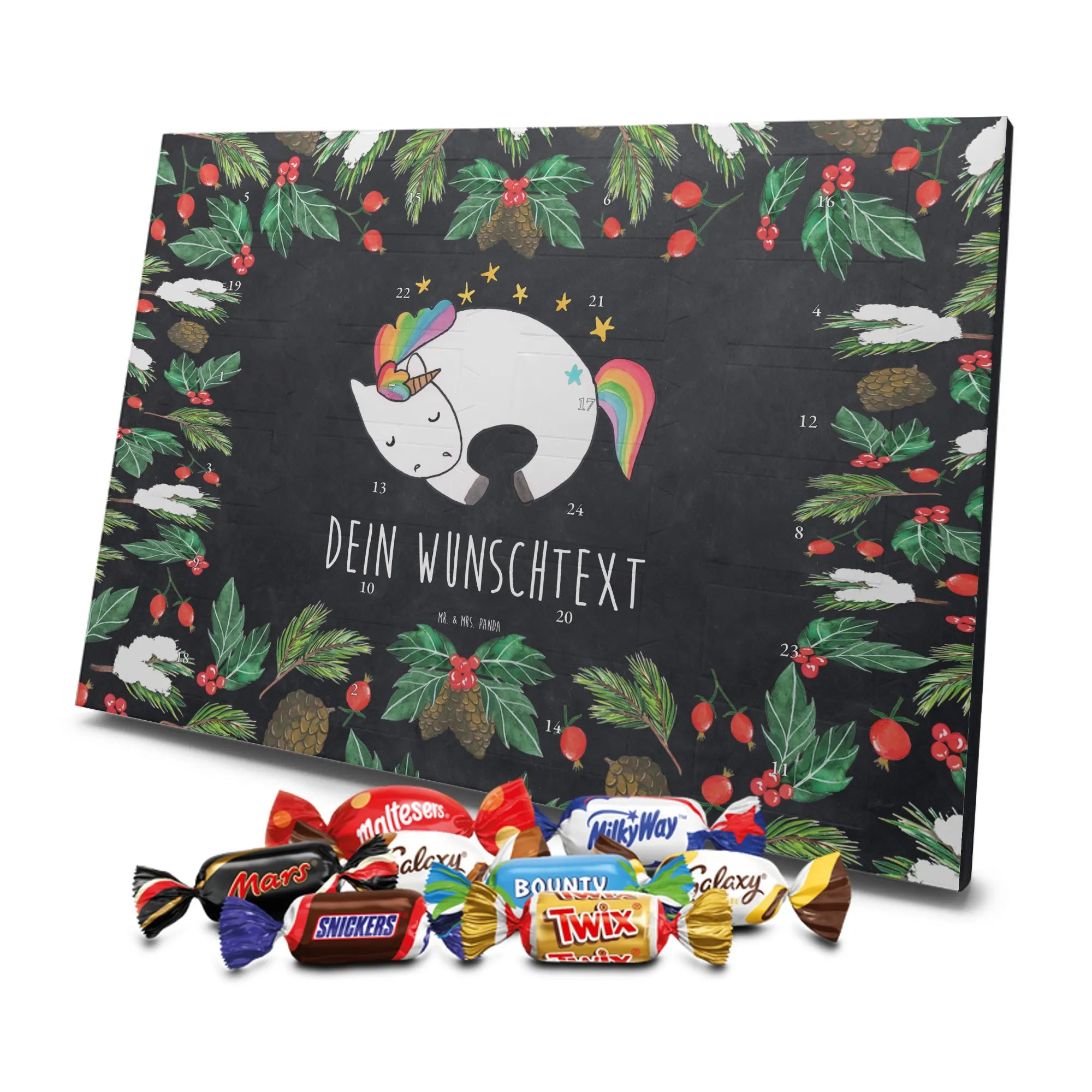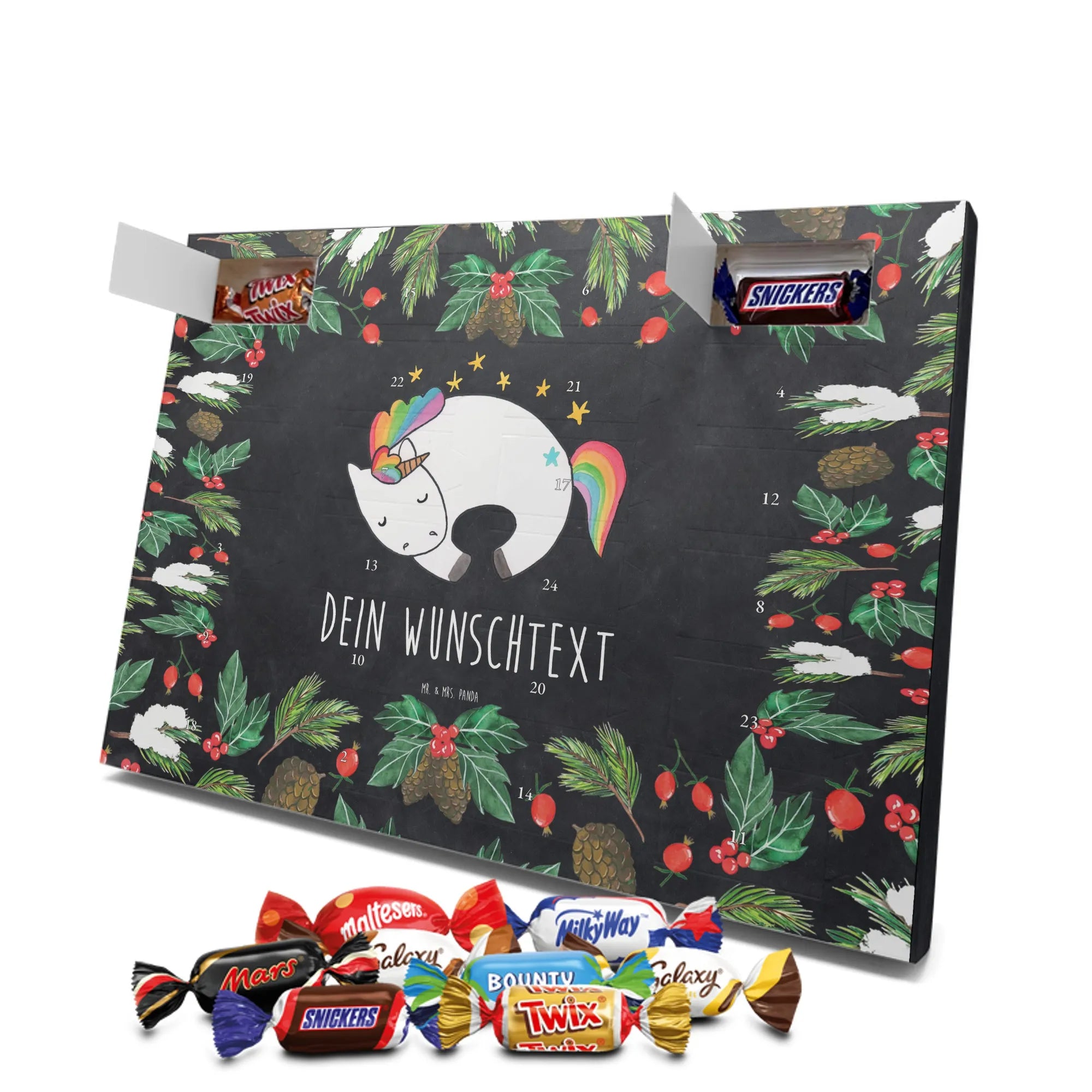 Adventskalender mit deinem Namen – individuell, süß und mit ganz viel Mr. & Mrs. Panda Charme! Dieser personalisierbare Schoko Adventskalender wird mit liebevollen Motiven & frechen Sprüchen bedruckt und lässt sich mit deinem Wunschnamen oder Wunschtext individualisieren. Durch die brillante Druckqualität und die seidenmatte Oberflächenveredelung wirken die Farben besonders intensiv und hochwertig. Auch die Seitenflächen sind bedruckt, sodass das Gesamtbild stimmig ist. Du hast die Wahl: Häng den Kalender auf oder stell ihn auf – beides funktioniert super. Der Kalender ist gefüllt mit Celebrations und enthält 24 hochwertige Füllungen in 8 verschiedenen Sorten, darunter Maltesers, Mars, Snickers, Twix, Milky Way, Bounty, Galaxy und Galaxy Caramel, die dir jeden Tag im Dezember ein Lächeln schenken. Maße: 325 mm x 225 mm x 27 mm – ideal dimensioniert für schöne Türchen-Überraschungen. Verschenke persönliche Vorfreude an Freunde, Familie oder gönn dir selbst diese zuckersüße Adventsüberraschung von Mr. & Mrs. Panda.