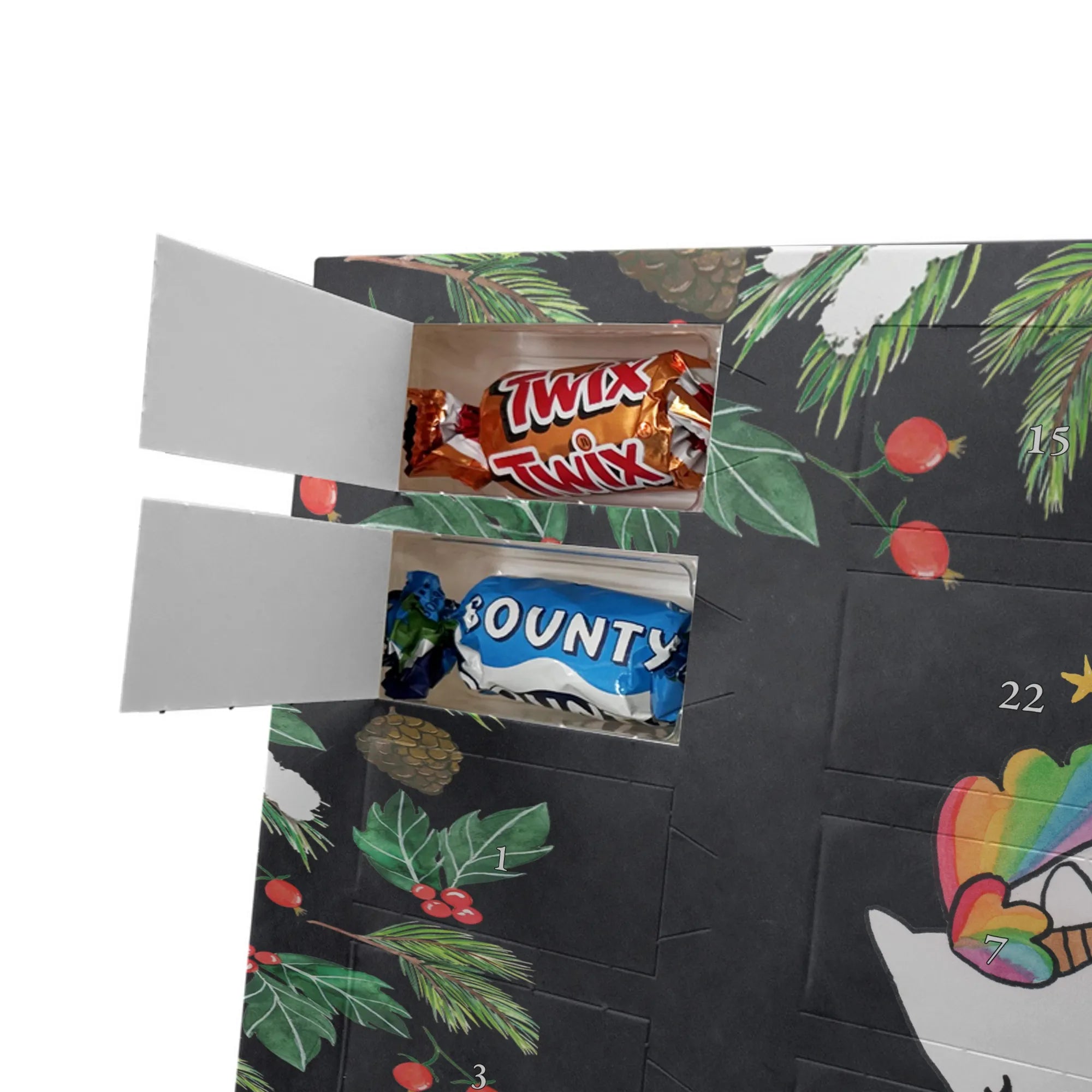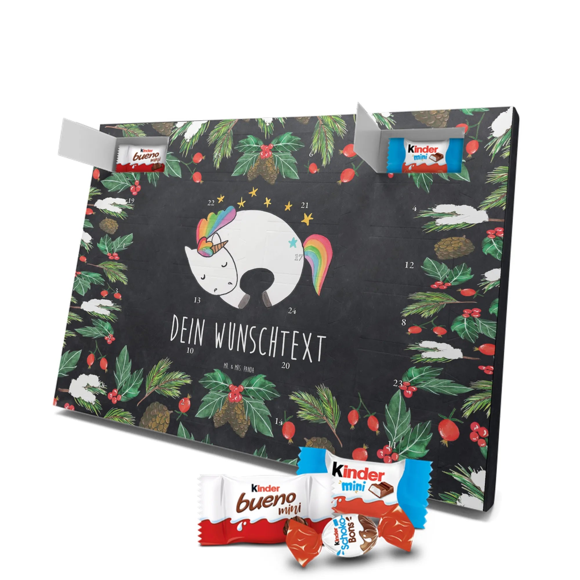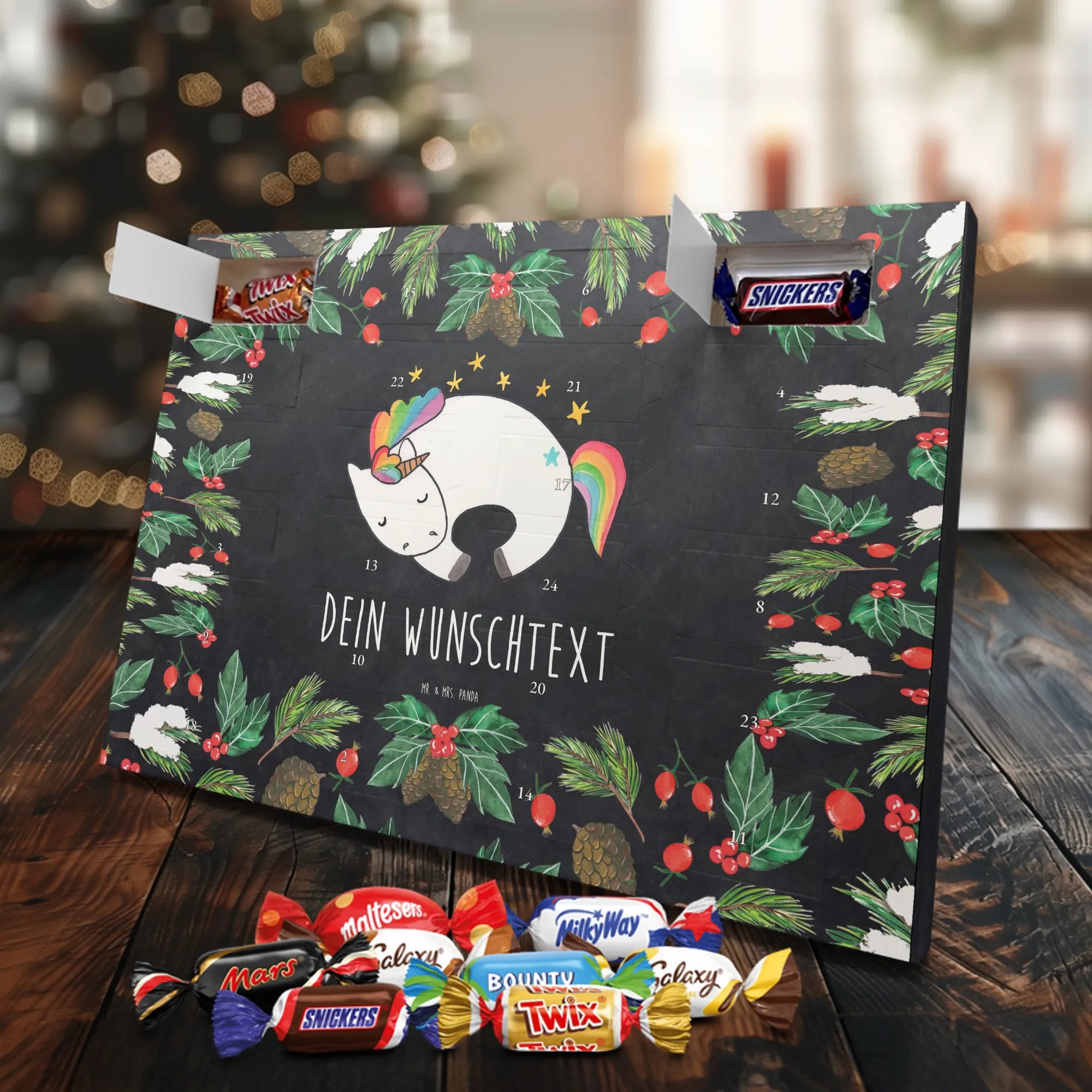 Adventskalender mit Namen von Mr. & Mrs. Panda – die süße und persönliche Art, die Adventszeit zu feiern! Dieser liebevoll gestaltete Adventskalender ist bedruckt mit zauberhaften Motiven & Sprüchen von Mr. & Mrs. Panda und lässt sich ganz nach deinem Geschmack personalisieren: Dein Name oder ein kurzer Wunschtext wird hochwertig aufgedruckt. Die brillante Druckqualität kombiniert mit einer seidenmatten Oberflächenveredelung sorgt für ein edles Finish, und auch die Seitenflächen sind hübsch bedruckt, sodass das Design aus jedem Blickwinkel wirkt. Besonders praktisch: Du kannst den Kalender aufhängen oder einfach aufstellen – perfekt für den Weihnachtsbaum, die Wand oder das Regal. Der Kalender ist gefüllt mit Celebrations und beinhaltet 24 leckere Füllungen in 8 verschiedenen Sorten wie Maltesers, Mars, Snickers, Twix, Milky Way, Bounty, Galaxy und Galaxy Caramel – für jeden Tag bis Heiligabend eine kleine Freude. Maße: 325 mm x 225 mm x 27 mm – handlich und trotzdem großzügig genug für die Schoko-Überraschungen. Verschenke Vorfreude und Persönlichkeit in einem – ideal für Freunde, Familie oder als liebevolle Aufmerksamkeit für dich selbst.