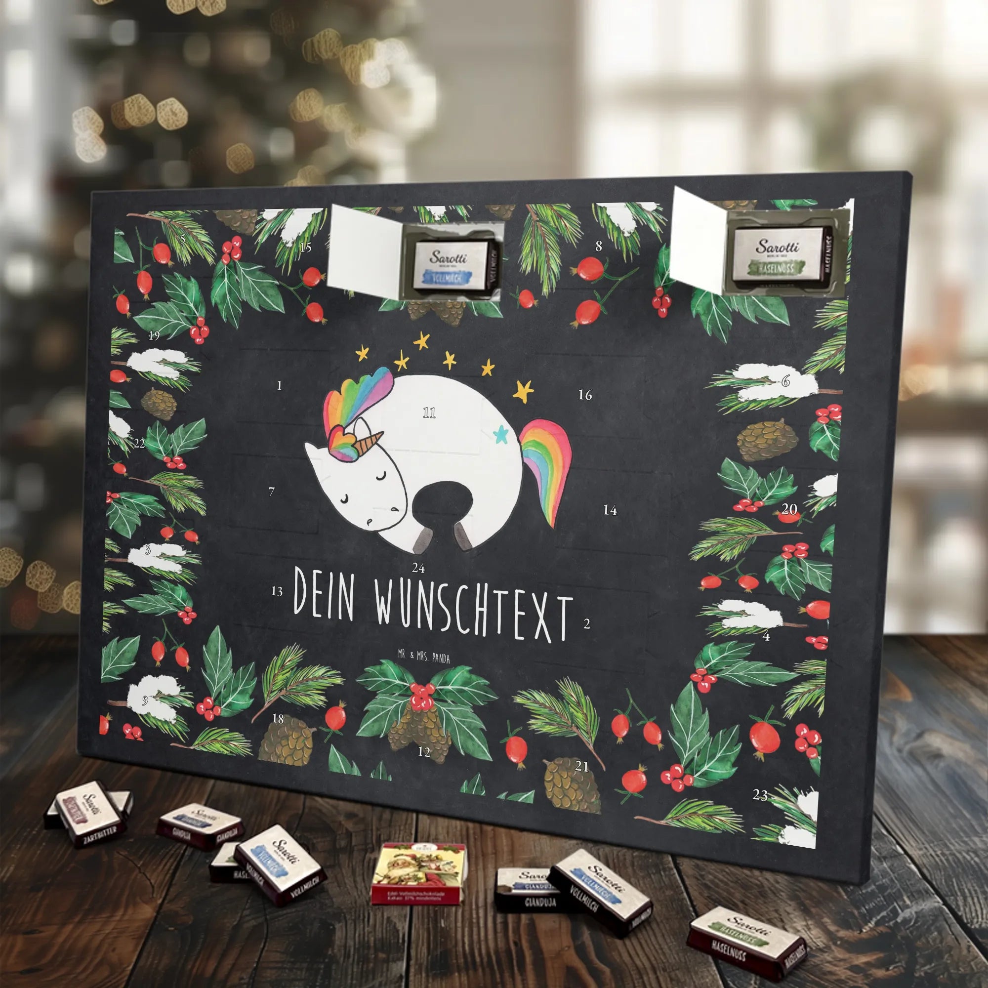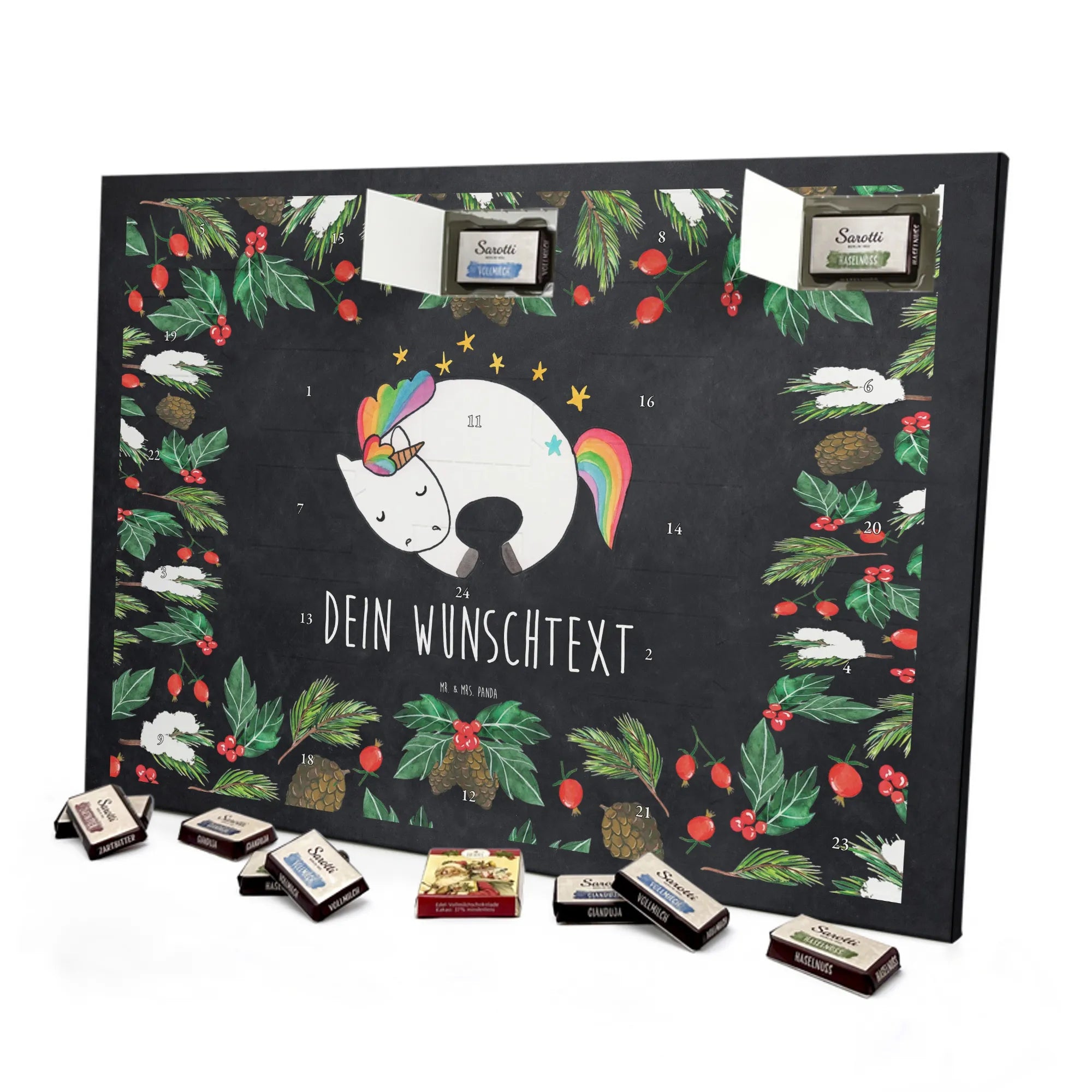 Der perfekte Adventskalender für individuelle Geschenkideen: Adventskalender mit Namen von Mr. & Mrs. Panda. Dieser Kalender ist mit liebevollen Motiven und frechen Sprüchen bedruckt und kann mit deinem Wunschtext oder Namen personalisiert werden – so wird jedes Türchen zur persönlichen Überraschung. Die brillante Druckqualität und die seidenmatte Oberflächenveredelung geben dem Kalender ein hochwertiges Aussehen, und die bedruckten Seitenflächen runden das Design ab. Maße: 355 mm x 245 mm x 11 mm. Du kannst den Kalender an die Wand hängen oder einfach aufstellen – praktisch und schön zugleich. Gefüllt ist er mit 24 einzeln verpackten Schokoladentäfelchen in vier köstlichen Geschmacksrichtungen. Insgesamt enthält er 107 g Markenschokolade von Sarotti® und Confiserie Heidel® in den Sorten Vollmilch, Nougat, Zartbitter und Haselnuss. Hinweis: Es handelt sich um einen Kalender gefüllt mit Sarotti® und Confiserie Heidel® Markenschokolade. Ob als liebevolles Geschenk für Kinder, Partner oder Freundinnen und Freunde – dieser Adventskalender sorgt für tägliche Vorfreude und süße Genussmomente.