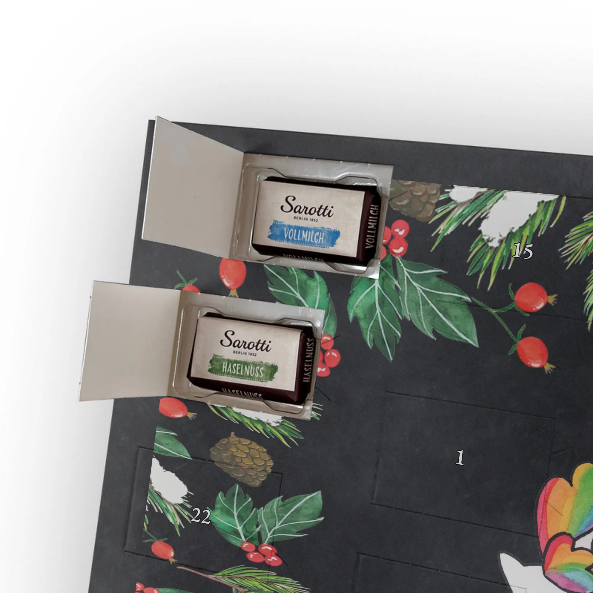 Leckere Füllung: Gefüllt mit 24 einzeln verpackten Schokoladentäfelchen, insgesamt 107 g Markenschokolade von Sarotti® und Confiserie Heidel® in vier köstlichen Sorten: Vollmilch, Nougat, Zartbitter und Haselnuss. So verbindet der Kalender bezaubernde Optik mit hochwertigem Geschmack.