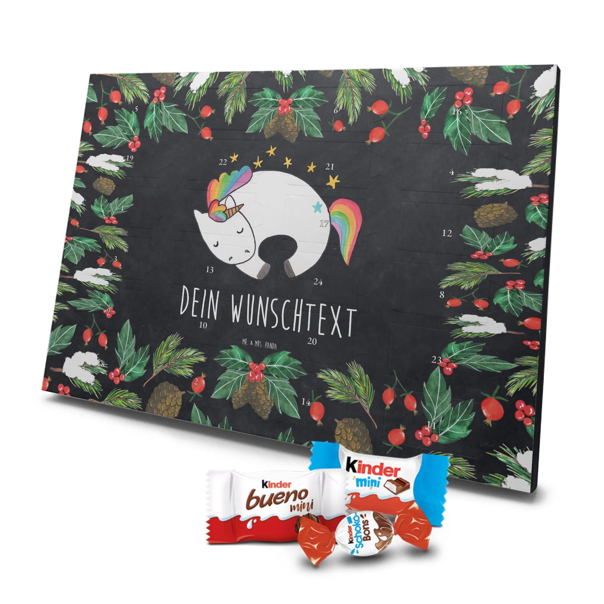 Träumst du von Glitzer, Sternen und schlafenden Einhörnern? Unser Personalisierter Schoko Adventskalender „Einhorn Nacht“ von Mr. & Mrs. Panda ist genau dafür gemacht: eine zauberhafte Mischung aus liebevoller Illustration, persönlichem Namen und süßen Schokowürfeln hinter 24 Türchen. Das niedliche schlafende Einhorn auf dem Kreidetafel-Hintergrund und der freche Spruch „Die Realität ist was für Menschen, die Angst vor Einhörnern haben.“ machen diesen Adventskalender zu einem besonderen Highlight in deiner Weihnachtszeit.