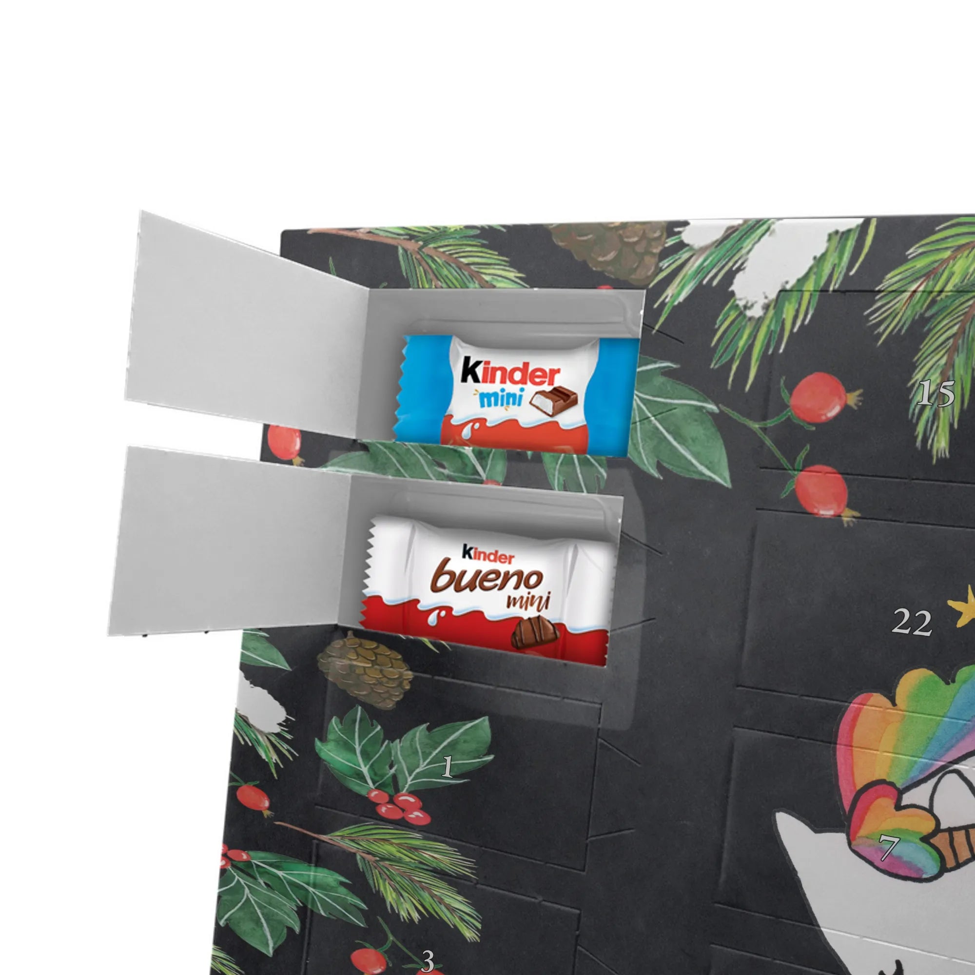Süße Füllung: Gefüllt mit kinder® Schokolade – darunter kinder® Schoko-Bons, kinder® Bueno mini und kinder® Schokolade mini – sorgt dieser Personalisierte Schoko Adventskalender für tägliche Genussmomente bis Weihnachten. Die vertraute Schokolade macht die Vorfreude besonders groß und ist bei Kindern und Erwachsenen gleichermaßen beliebt.