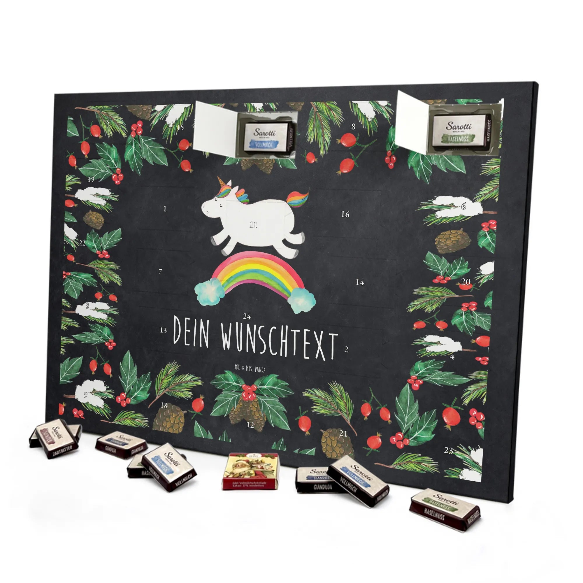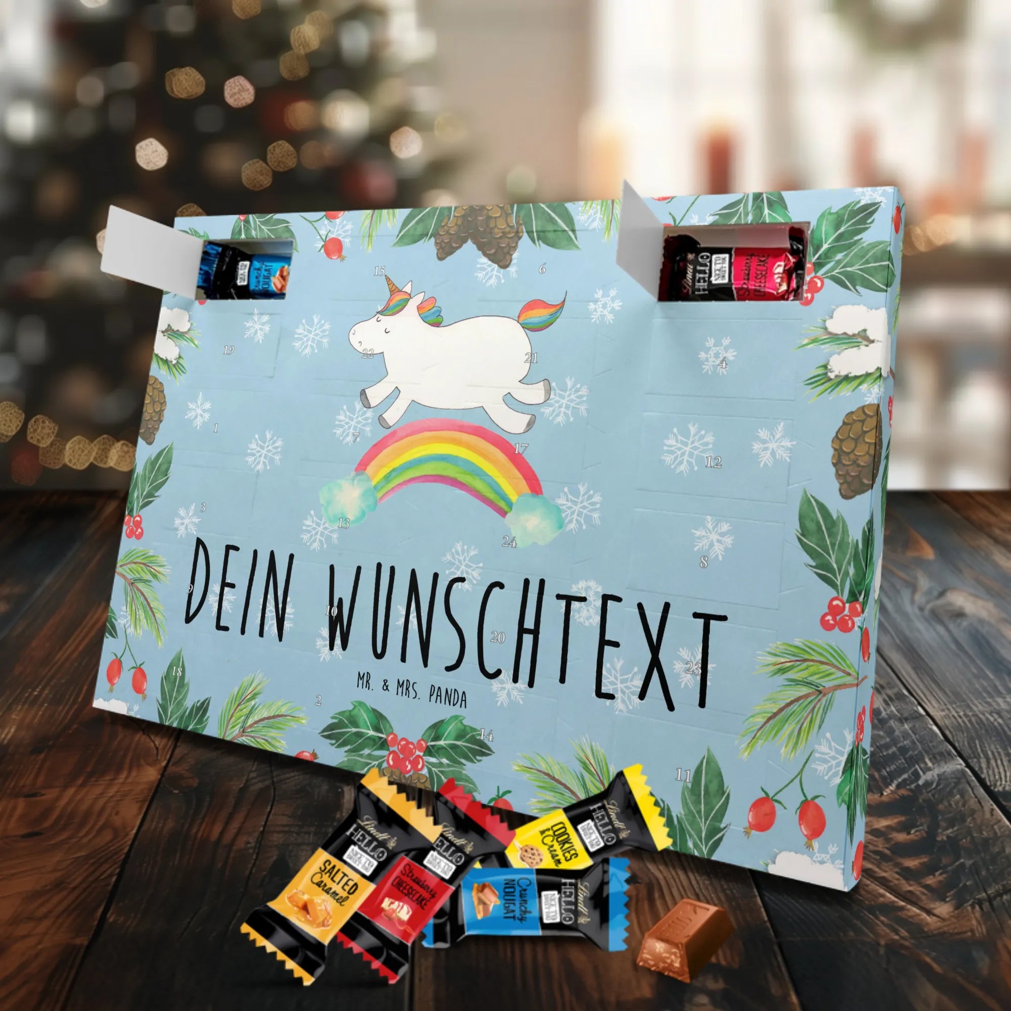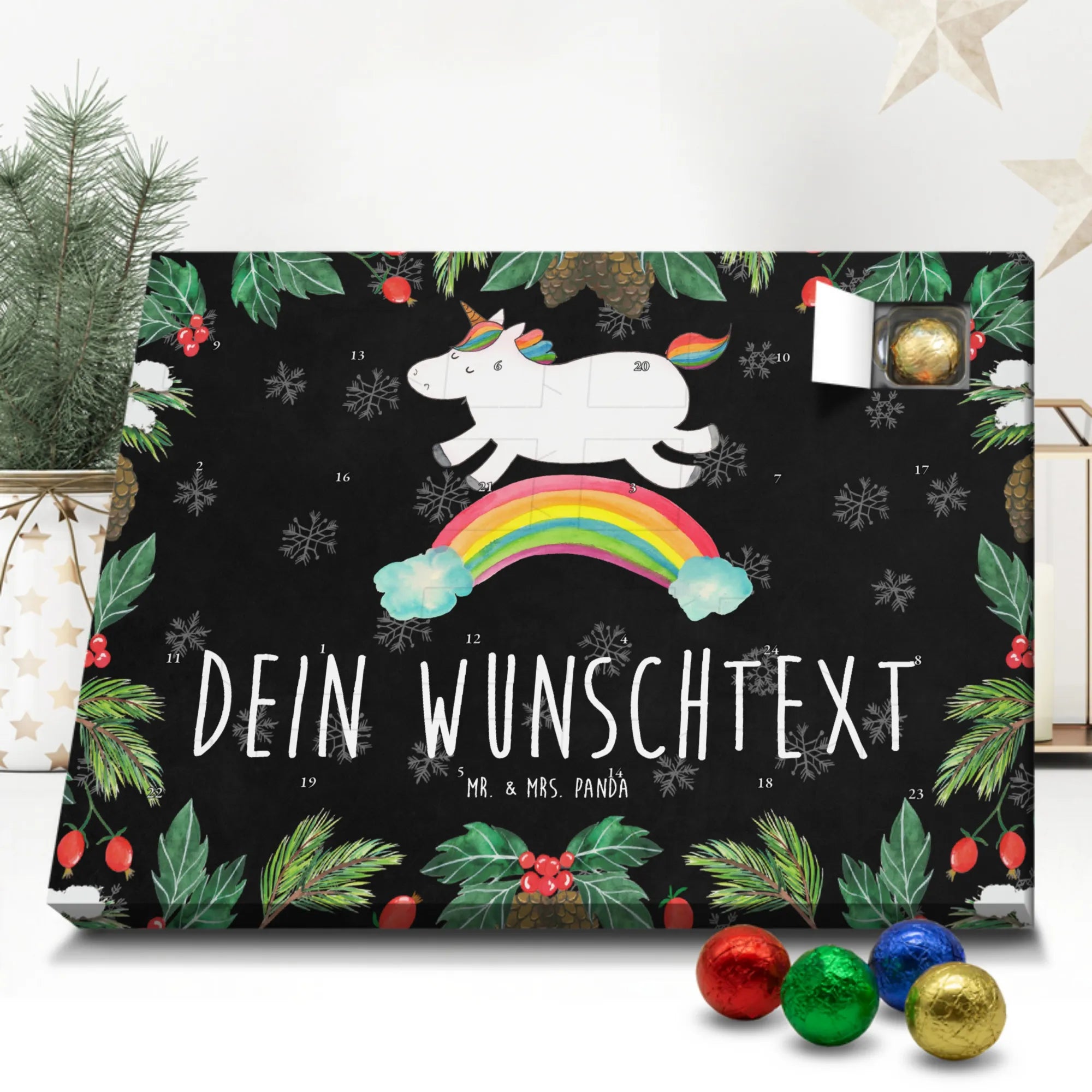 Personalisierter Schoko Adventskalender „Einhorn Regenbogen“ aus der Einhorn - Kollektion von Mr. & Mrs. Panda: ein zauberhaftes Geschenk für alle, die Einhörner, Regenbögen und süße Überraschungen lieben.