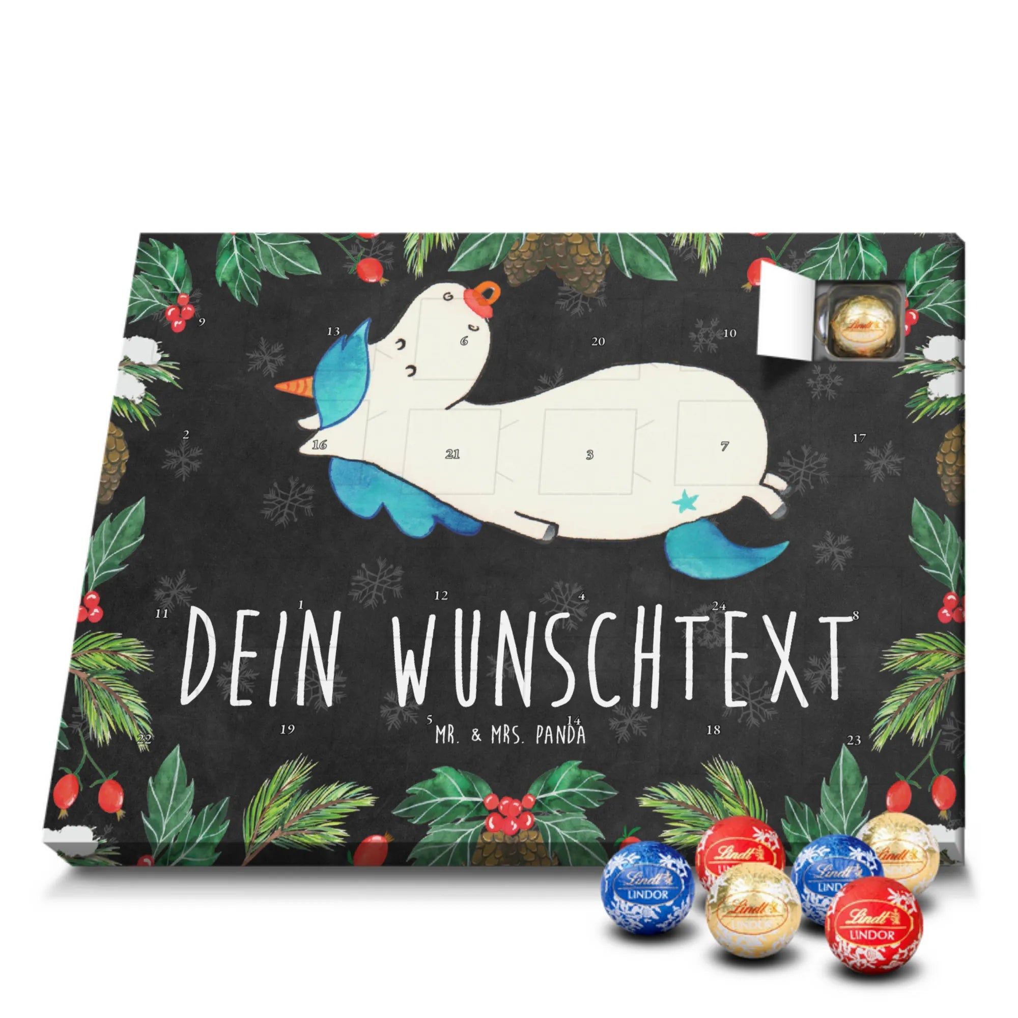 Personalisierter Schokoladen Adventskalender von Mr. & Mrs. Panda – perfekt für alle, die es süß und persönlich mögen. Unser Adventskalender ist mit liebevollen Illustrationen und charmanten Sprüchen von Mr. & Mrs. Panda bedruckt und kann mit deinem Namen oder Wunschtext individualisiert werden. Die brillante Druckqualität und die seidenmatte Oberflächenveredelung sorgen für ein edles Erscheinungsbild, zudem sind die Seitenflächen bedruckt. Maße: 233 mm x 178 mm x 24 mm. Du kannst den Kalender aufstellen oder aufhängen – je nachdem, wie du ihn am schönsten präsentierst. Gefüllt mit Lindt Lindor Schokolade: 24 einzeln verpackte Markenschokoladen Kugeln in drei köstlichen Sorten. Geschmacksrichtungen: Vollmilch, Feinherb und Weiße Schokolade. Zutaten: Zucker, pflanzliches Fett (Kokosnuss, Palmkern), Kakaobutter, Vollmilchpulver, Kakaomasse, Milchzucker, Magermilchpulver, Butterreinfett, Emulgator (Sojalecithin), Gerstenmalzextrakt, Aromen. Besondere Hinweise: Kann Haselnüsse und Mandeln enthalten. Ob als Advents-Überraschung für deine Liebsten oder als kleines Geschenk für Kollegen – dieser Kalender bringt personalisierten Genuss in die Vorweihnachtszeit.