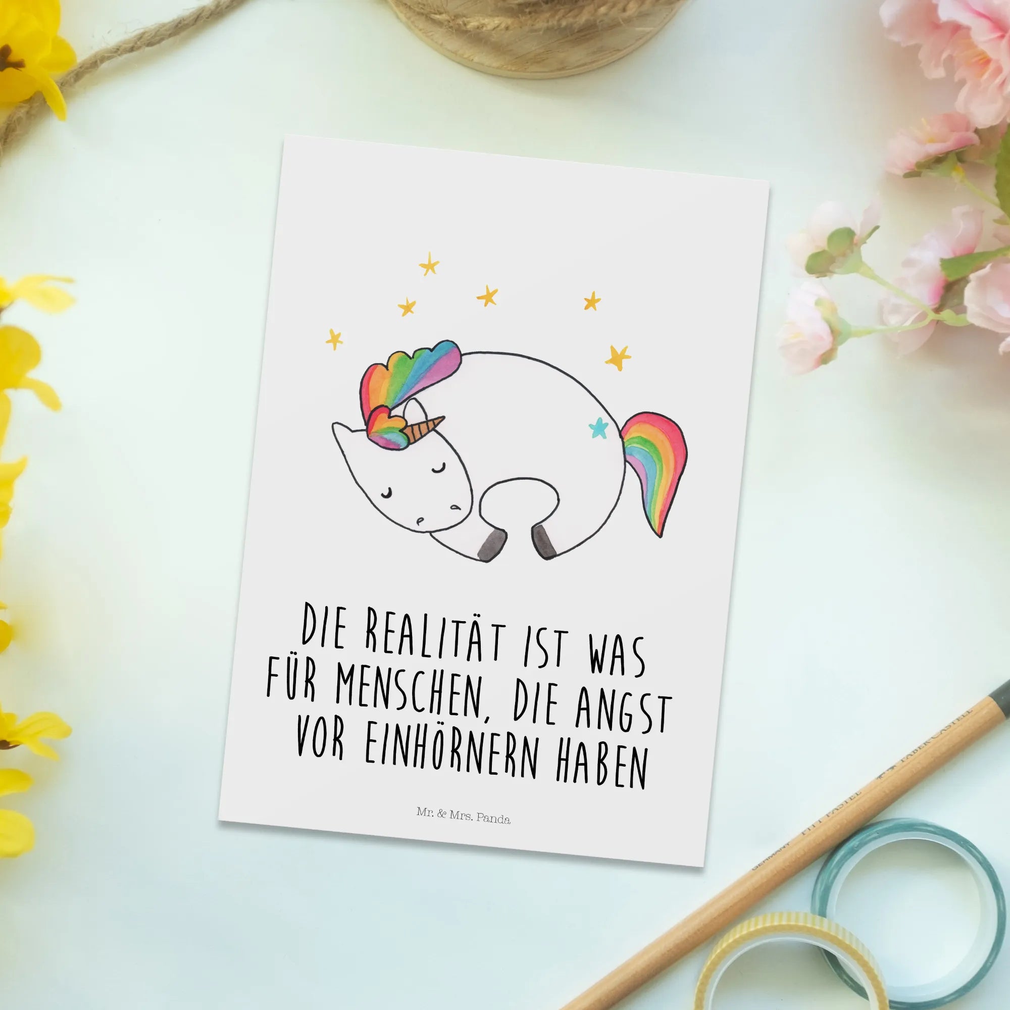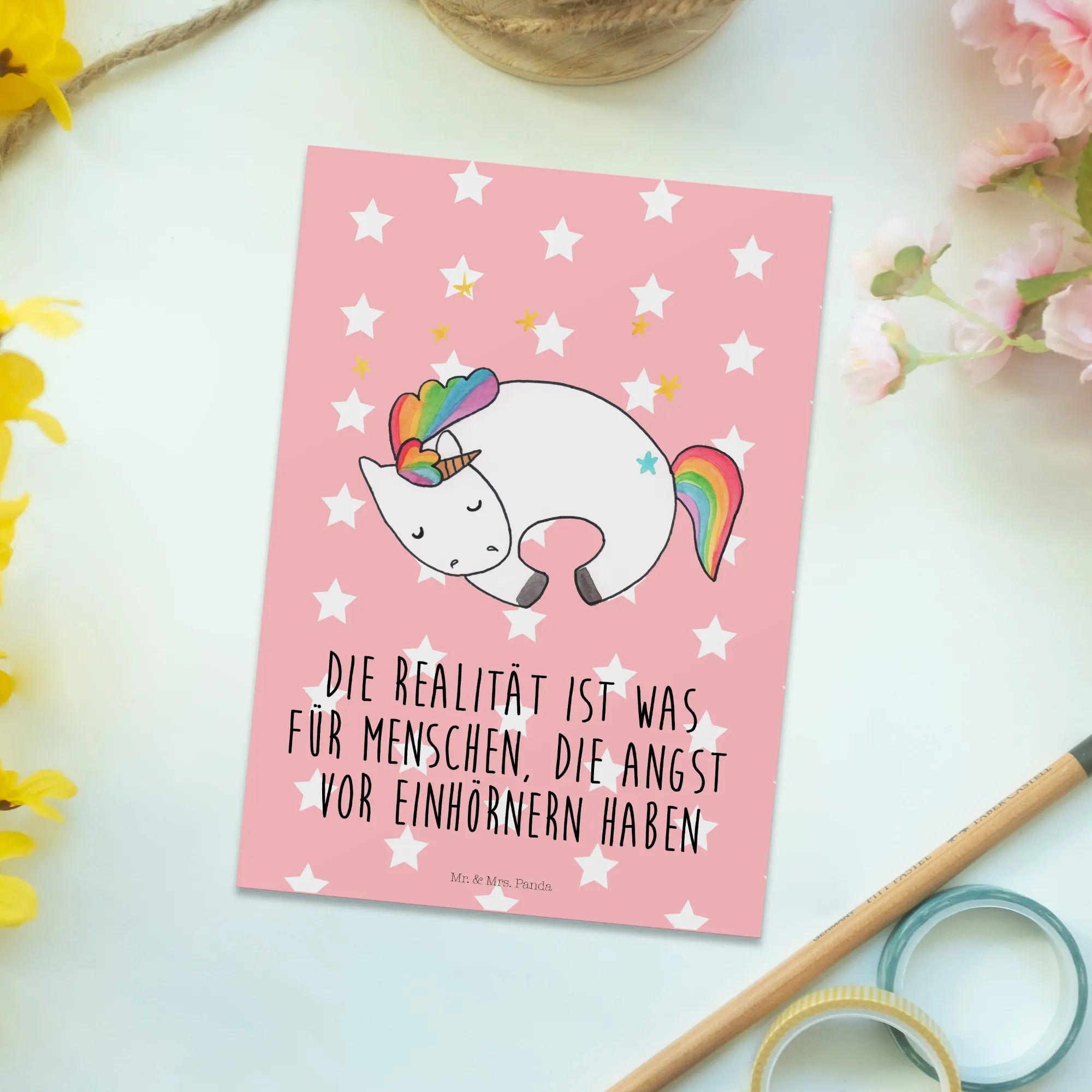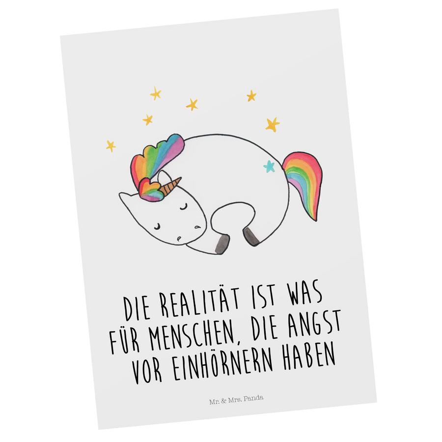 Die einzigartige Postkarte mit dem beeindruckenden Motiv "Einhorn Nacht" aus der Einhorn-Kollektion von Mr. & Mrs. Panda ist das perfekte Geschenk für all jene besonderen Menschen in deinem Leben, die in ihrer eigenen zauberhaften Welt leben möchten. Diese Postkarte, einzigartig bedruckt mit einem wunderschönen, schlafenden Einhorn und dem lustigen Spruch "Die Realität ist was für Menschen, die Angst vor Einhörnern haben", spricht die Träumer und Fantasie-Liebhaber unter uns an. Egal ob für deinen Geburtstag, eine Einladung zu einer Feier oder einfach nur als liebevolle Geste der Freundschaft, diese Karte lässt Herzen höher schlagen!
