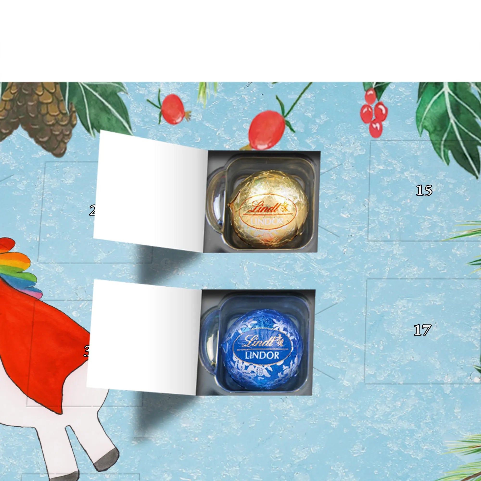 Der Adventskalender mit Schokolade von Mr. & Mrs. Panda ist ein echter Blickfang und eine köstliche Überraschung für die Vorweihnachtszeit. Er ist bedruckt mit wunderschönen Motiven & Sprüchen von Mr. & Mrs. Panda und nicht personalisierbar – deshalb perfekt als unkompliziertes Geschenk. Die brillante Druckqualität und die seidenmatte Oberflächenveredelung sorgen für eine hochwertige Optik, ergänzt durch bedruckte Seitenflächen. Maße: 233 mm x 178 mm x 24 mm. Besonderheit: kann aufgehängt oder aufgestellt werden, ganz wie es dir gefällt. Gefüllt mit Lindt Lindor: 24 einzeln verpackte Markenschokoladen Kugeln in den Sorten Vollmilch, Feinherb und Weiße Schokolade bieten täglich neue Geschmackserlebnisse. Zutaten: Zucker, pflanzliches Fett (Kokosnuss, Palmkern), Kakaobutter, Vollmilchpulver, Kakaomasse, Milchzucker, Magermilchpulver, Butterreinfett, Emulgator (Sojalecithin), Gerstenmalzextrakt, Aromen. Besondere Hinweise: Kann Haselnüsse und Mandeln enthalten. Ob als Mitbringsel, Geschenk oder zum Selbstverwöhnen – dieser Adventskalender vereint schönes Design mit zarter Markenschokolade.
