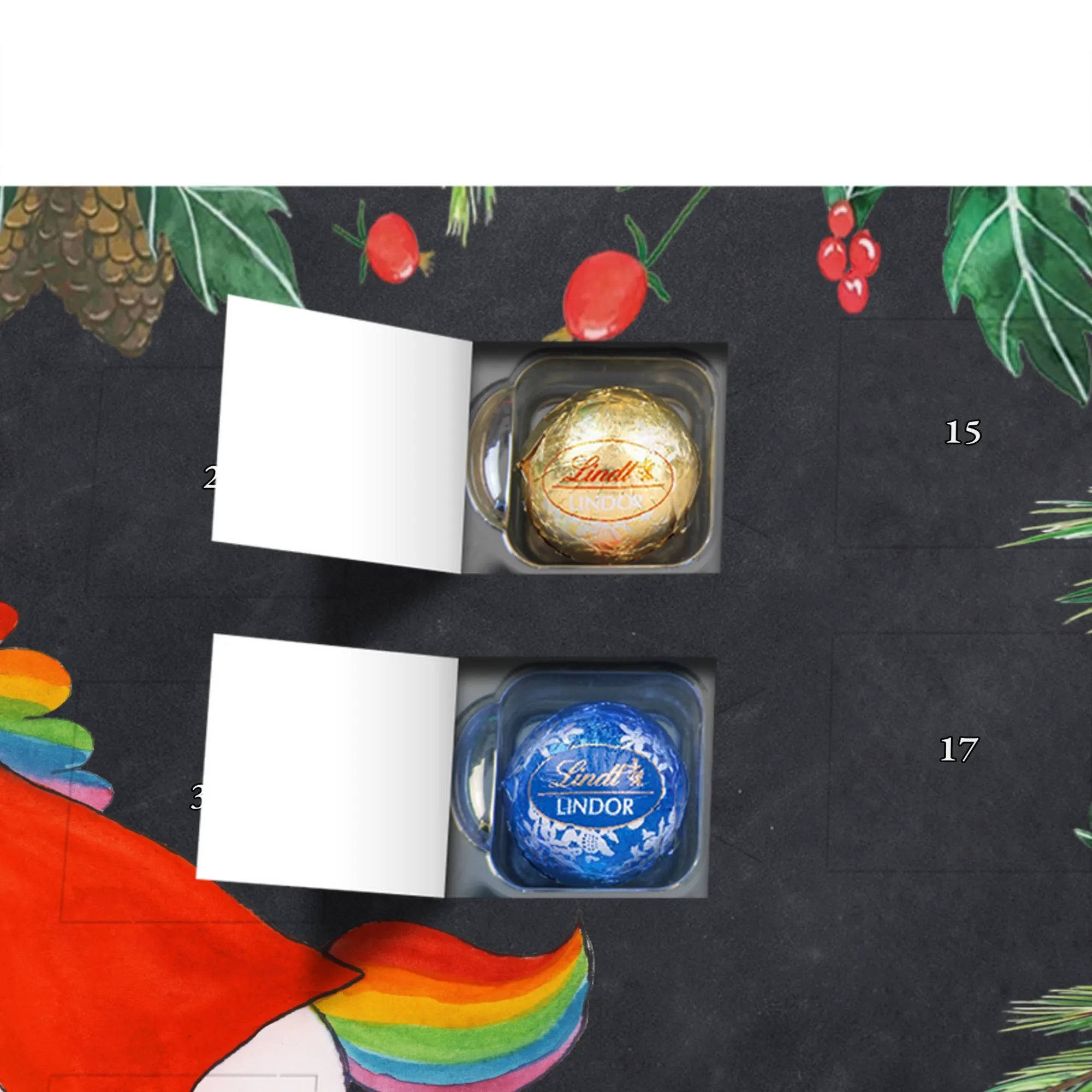 Unser liebevoller Schokoladen Adventskalender von Mr. & Mrs. Panda ist perfekt für alle, die sich eine fröhliche und süße Adventszeit wünschen. Aufwendig bedruckt mit unseren typischen Motiven & Sprüchen, nicht personalisierbar – dafür aber unglaublich hübsch anzusehen. Die brillante Druckqualität mit seidenmatter Oberflächenveredelung verleiht dem Kalender ein edles Aussehen, und die bedruckten Seitenflächen runden das Design ab. Maße: 233 mm x 178 mm x 24 mm. Besonderheit: kann aufgehängt oder aufgestellt werden, so bleibt er flexibel für deinen Deko-Stil. Gefüllt mit Lindt Lindor: 24 einzeln verpackte Markenschokoladen Kugeln in drei leckeren Sorten – Vollmilch, Feinherb und Weiße Schokolade – sorgen für tägliche Genussmomente. Zutaten: Zucker, pflanzliches Fett (Kokosnuss, Palmkern), Kakaobutter, Vollmilchpulver, Kakaomasse, Milchzucker, Magermilchpulver, Butterreinfett, Emulgator (Sojalecithin), Gerstenmalzextrakt, Aromen. Besondere Hinweise: Kann Haselnüsse und Mandeln enthalten. Ein tolles Geschenk oder eine hübsche Dekoration – unser Schokoladen Adventskalender macht die Wartezeit bis Weihnachten noch schöner!