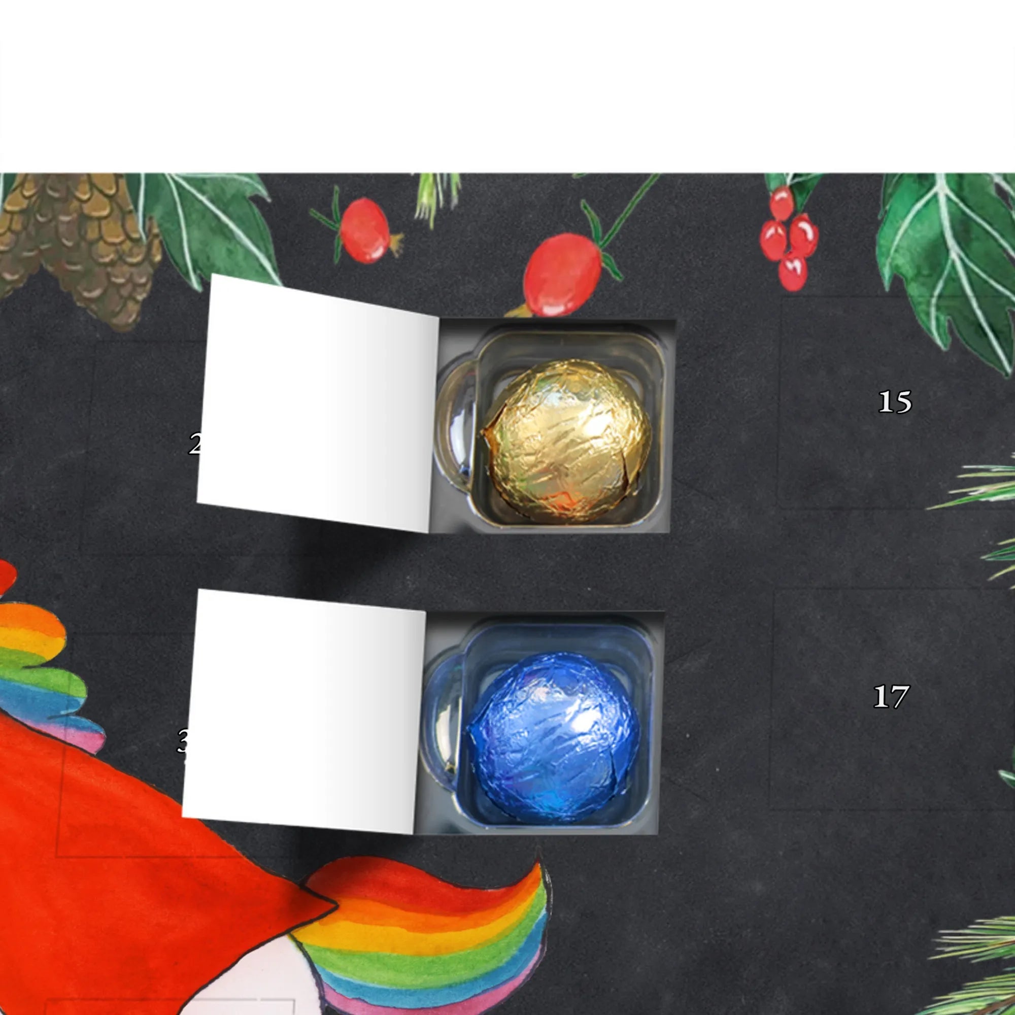 Wunderschöner Schokoladen-Adventskalender von Mr. & Mrs. Panda – süßes Design trifft hochwertige Verarbeitung. Unser Schokoladen-Adventskalender ist bedruckt mit wunderschönen Motiven & Sprüchen von Mr. & Mrs. Panda und nicht personalisierbar, dafür aber mit liebevollen Details gestaltet. Die brillante Druckqualität mit seidenmatter Oberflächenveredelung verleiht dem Kalender ein edles Finish, und auch die Seitenflächen sind bedruckt für einen rundum stimmigen Look. Maße: 233 mm x 178 mm x 24 mm. Die Konstruktion erlaubt sowohl das Aufstellen als auch das Aufhängen – Besonderheit: kann aufgehängt oder aufgestellt werden. Gefüllt mit MARKENNAMEN Schokolade und mit leckeren Schokoladenkugeln bestückt, ist jeder Dezembertag eine kleine Belohnung. Bitte lies die besonderen Hinweise: (Kann Spuren von Haselnüssen, Mandeln, Gluten und Soja enthalten!), kühl und trocken lagern. Ideal als Geschenk, Adventsdekoration oder süße Überraschung für Freunde und Familie. Mr. & Mrs. Panda wünscht dir eine gemütliche und genussvolle Adventszeit!