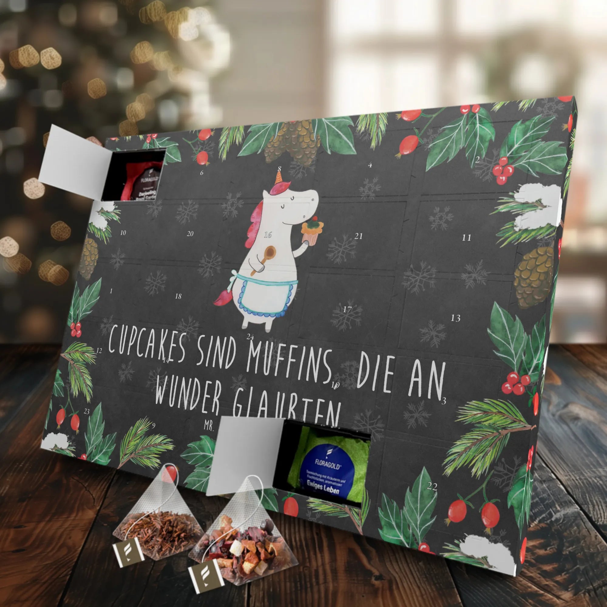 Entdecke den zauberhaften Tee Adventskalender "Einhorn Küchenfee" von Mr. & Mrs. Panda! Dieser wunderschöne Kalender ist nicht nur ein Blickfang, sondern auch perfekt für alle Teeliebhaber und Einhorn-Fans. Mit 24 einzeln verpackten, hochwertigen Teesorten im Pyramidenbeutel bringt er die festliche Vorfreude in dein Zuhause.