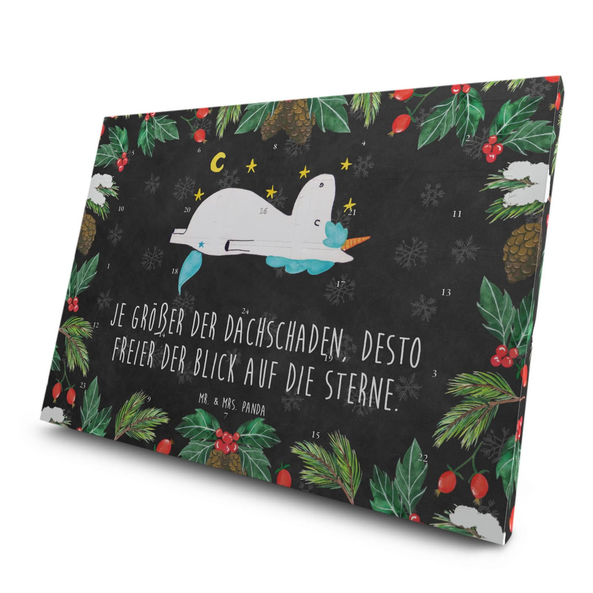 Mit einem liebevoll gestalteten Motiv, das ein süßes Einhorn zeigt, das den funkelnden Sternenhimmel beobachtet, bringt dieser Adventskalender ein Stück Magie und Freude in die Vorweihnachtszeit! Der Spruch „Je größer der Dachschaden, desto freier der Blick auf die Sterne“ sorgt dafür, dass sich jeder beschenkte Freund oder Verwandte geschätzt und besonders fühlt.