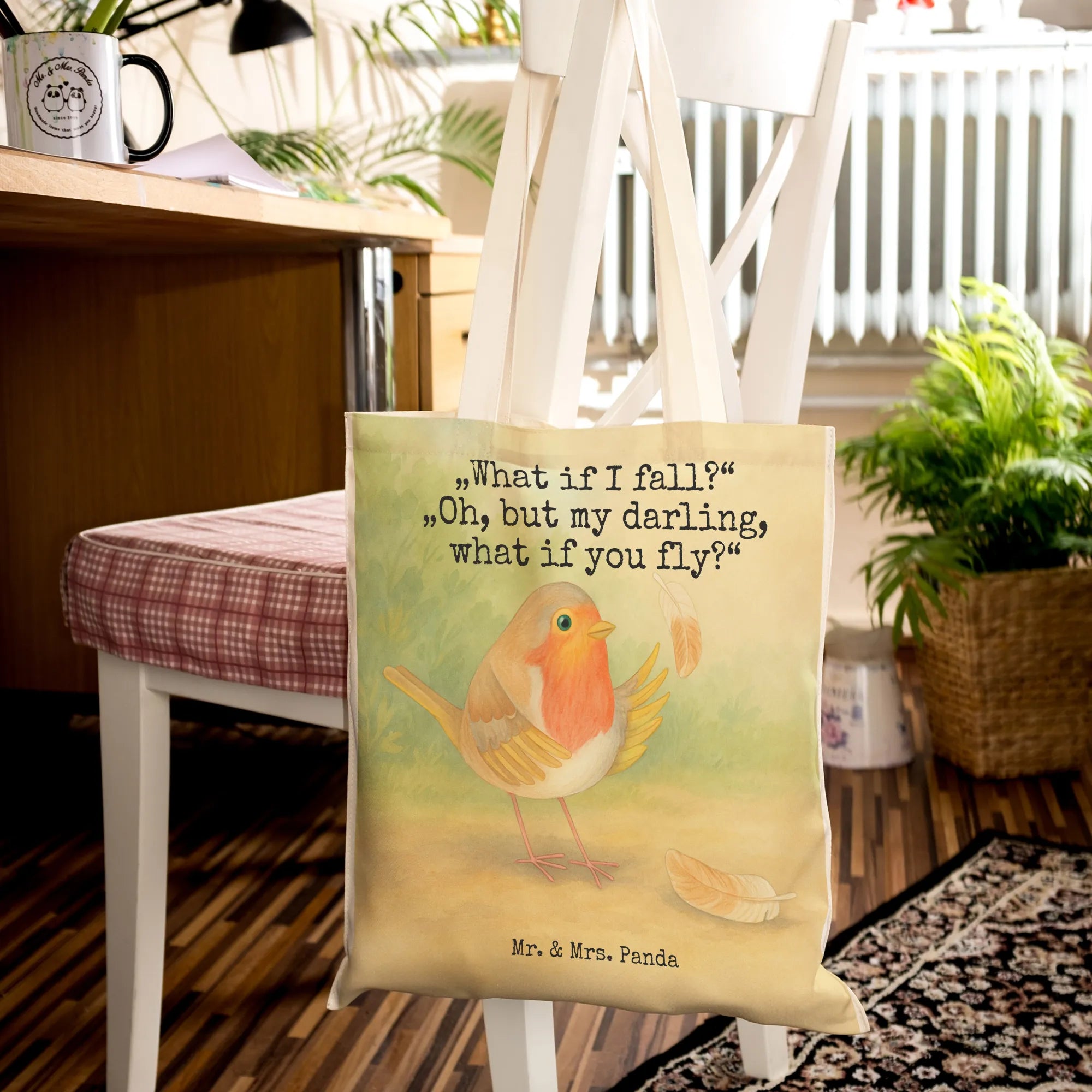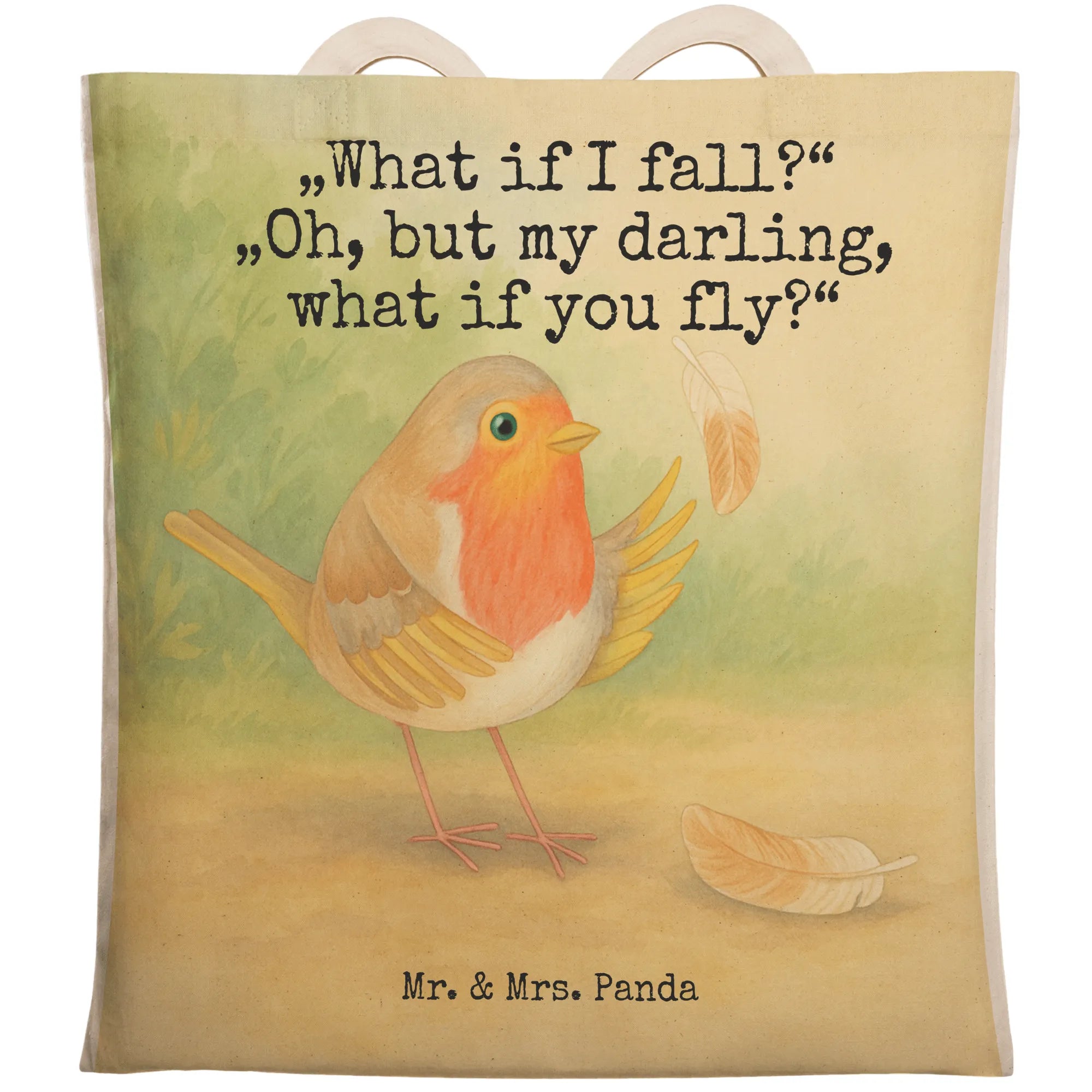Mutiges Rotkehlchen mit inspirierendem Spruch 'What if I fall? Oh, but my darling, what if you fly?'