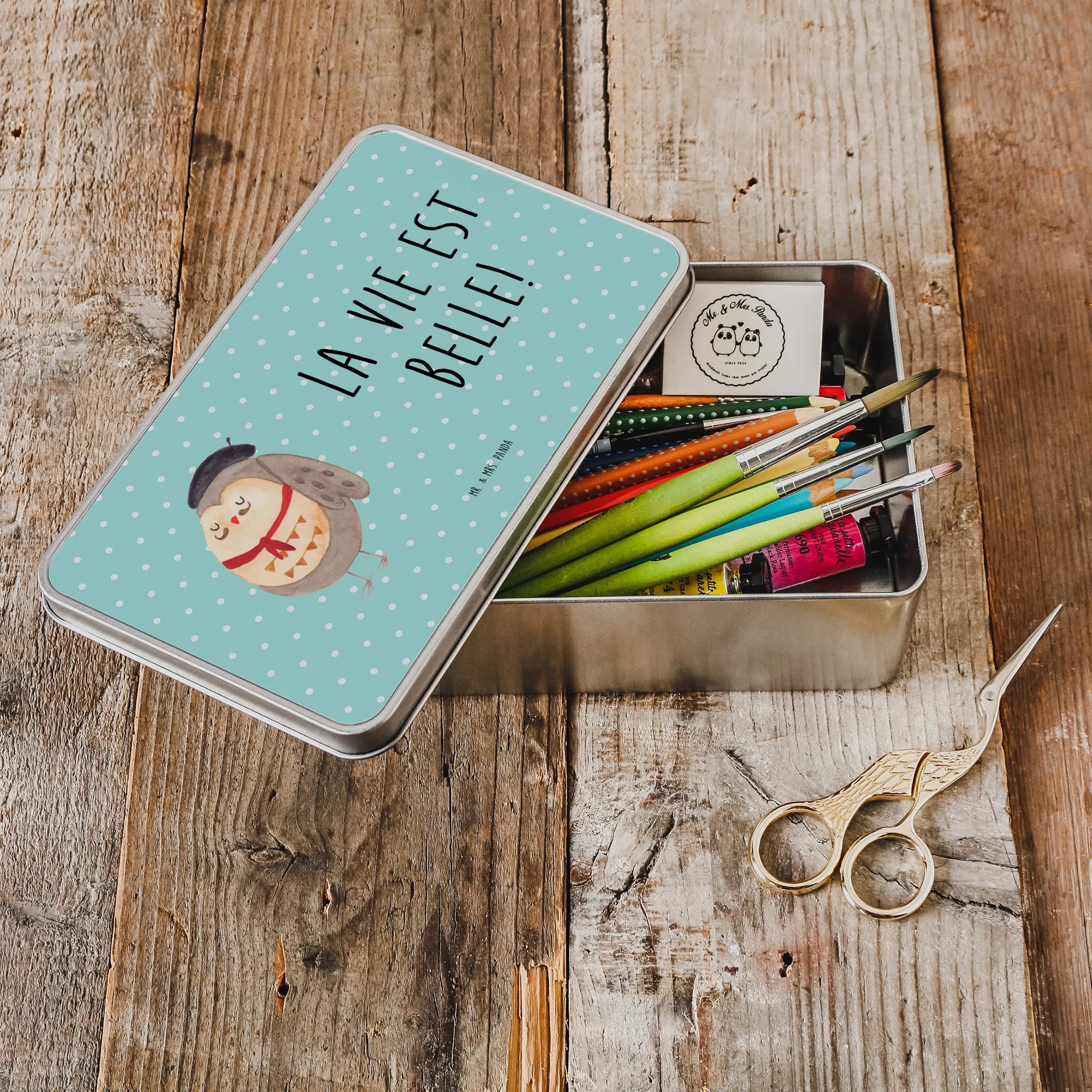 Entdecke die wunderschöne rechteckige Metalldose mit dem zauberhaften Eulen-Motiv von Mr. & Mrs. Panda! Diese liebevoll gestaltete Dose ist nicht nur ein praktischer Aufbewahrungsort für Kekse, Süßigkeiten oder kleine Erinnerungen, sondern auch ein Blickfang in deiner Küche oder deinem Büro.