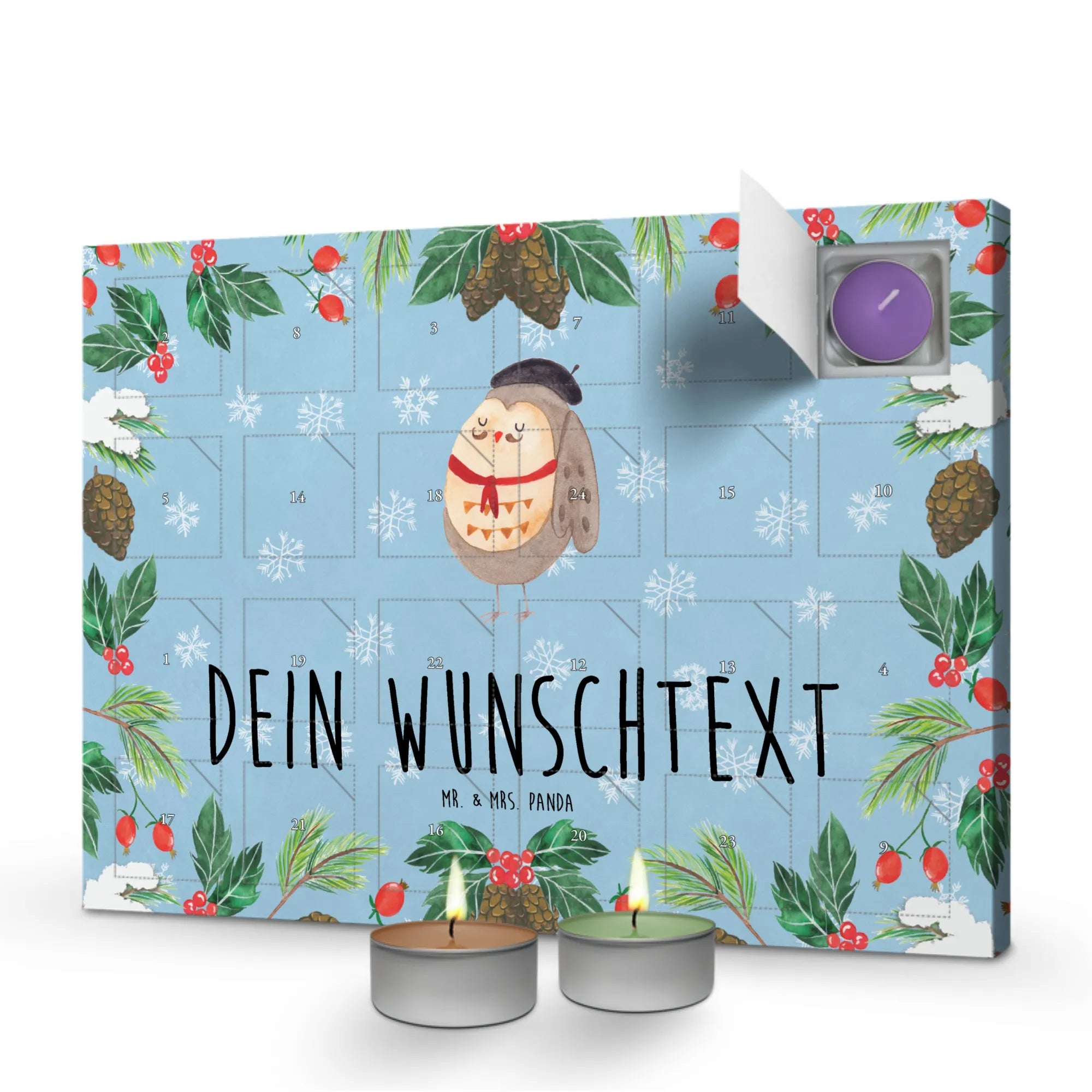 Der personalisierte Duftkerzen Adventskalender von Mr. & Mrs. Panda ist das perfekte Geschenk für alle, die Eulen lieben und sich in die charmante Welt der französischen Lebensart entführen lassen möchten. Egal, ob du ihn für dich selbst oder für deine Liebsten kaufst, dieser Kalender bringt Freude in die Vorweihnachtszeit! Mit seinem liebevollen Design, das eine niedliche Eule im französischen Stil zeigt, wird dieser Adventskalender jeder Wohnung ein Stückchen Wärme und Fröhlichkeit verleihen.