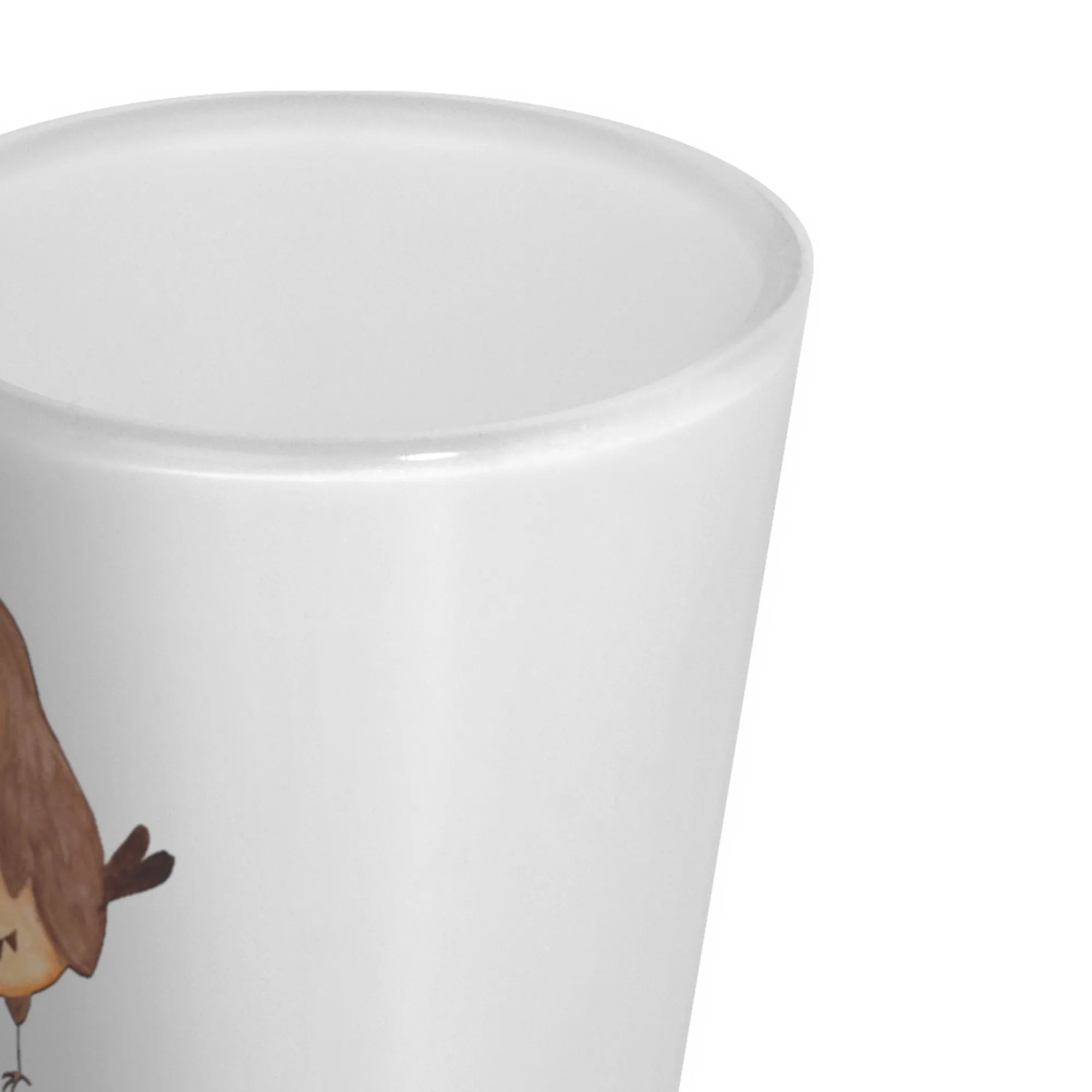 Jede Eule wird von Mrs. Panda liebevoll handgezeichnet und auf das satiniertes Glas mit brillant glänzendem Vollfarb-Glasdruck gebracht, wodurch das Motiv extrem kratz- und hitzebeständig ist. Mit einem Füllvolumen von 40 ml ist es ideal für einen leckeren Schnaps oder einen anderen Lieblingsdrink. Das Glas hat eine Höhe von 60 mm und einen Durchmesser von 50 mm und wiegt 70 g.