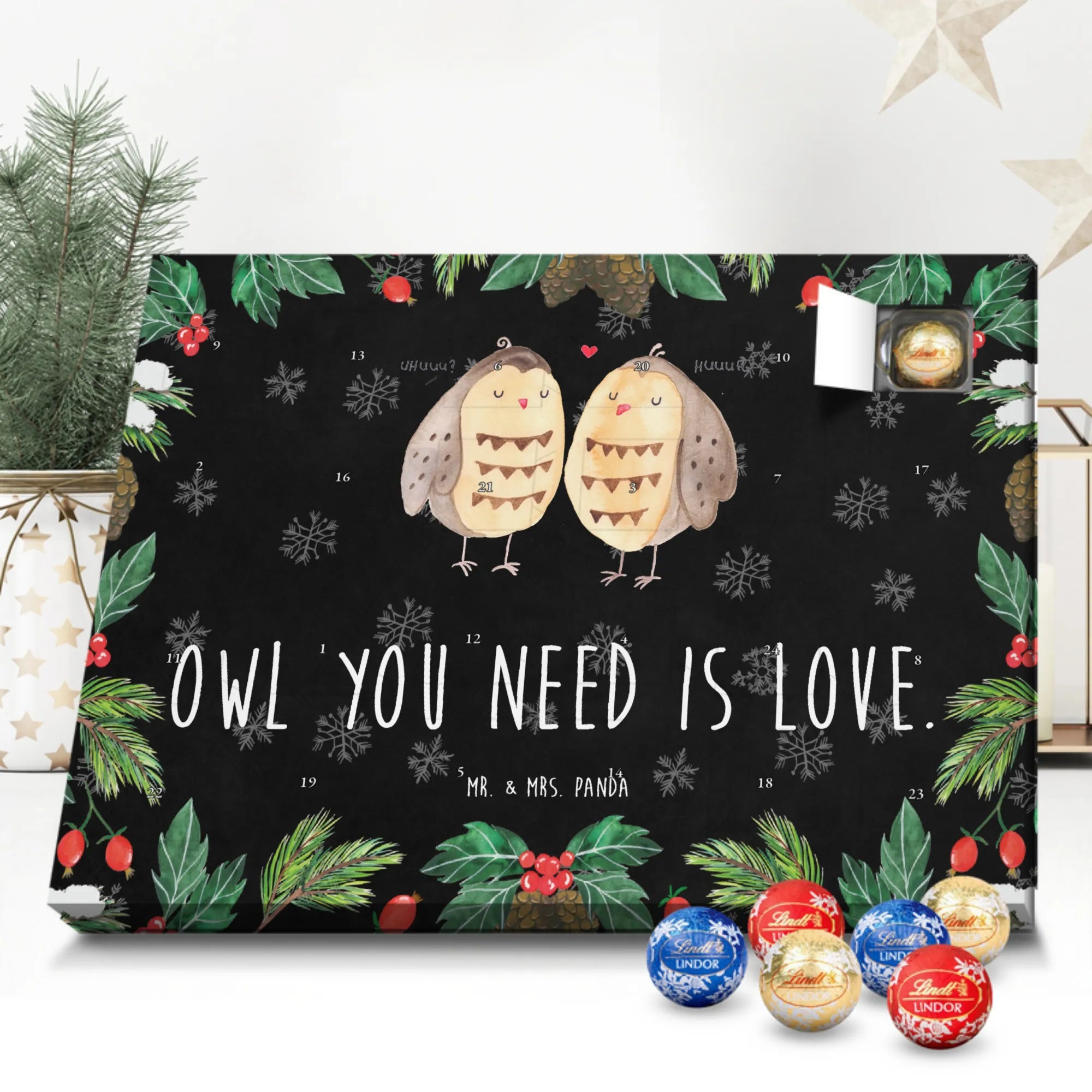 Unser zauberhafter Schoko Adventskalender von Mr. & Mrs. Panda bringt dir die süßeste Vorfreude auf Weihnachten! Dieser liebevoll gestaltete Adventskalender ist bedruckt mit wunderschönen Motiven & Sprüchen von Mr. & Mrs. Panda und ist nicht personalisierbar – dafür aber ein perfektes Geschenk für Freunde und Familie. Brillante Druckqualität mit seidenmatter Oberflächenveredelung sorgt für ein edles Finish, und die bedruckten Seitenflächen machen den Kalender von allen Seiten zu einem Hingucker. Maße: 233 mm x 178 mm x 24 mm. Besonderheit: kann aufgehängt oder aufgestellt werden, je nachdem, wie du ihn präsentieren möchtest. Gefüllt mit Lindt Lindor: 24 einzeln verpackte Markenschokoladen Kugeln in drei verschiedenen Sorten – Vollmilch, Feinherb und Weiße Schokolade – sorgen für abwechslungsreichen Genuss in der Adventszeit. Zutaten: Zucker, pflanzliches Fett (Kokosnuss, Palmkern), Kakaobutter, Vollmilchpulver, Kakaomasse, Milchzucker, Magermilchpulver, Butterreinfett, Emulgator (Sojalecithin), Gerstenmalzextrakt, Aromen. Besondere Hinweise: Kann Haselnüsse und Mandeln enthalten. Unser Schoko Adventskalender verbindet niedliches Design mit hochwertiger Füllung – ideal zum Verschenken oder selbst Naschen. Mr. & Mrs. Panda wünschen dir eine fröhliche und leckere Adventszeit!