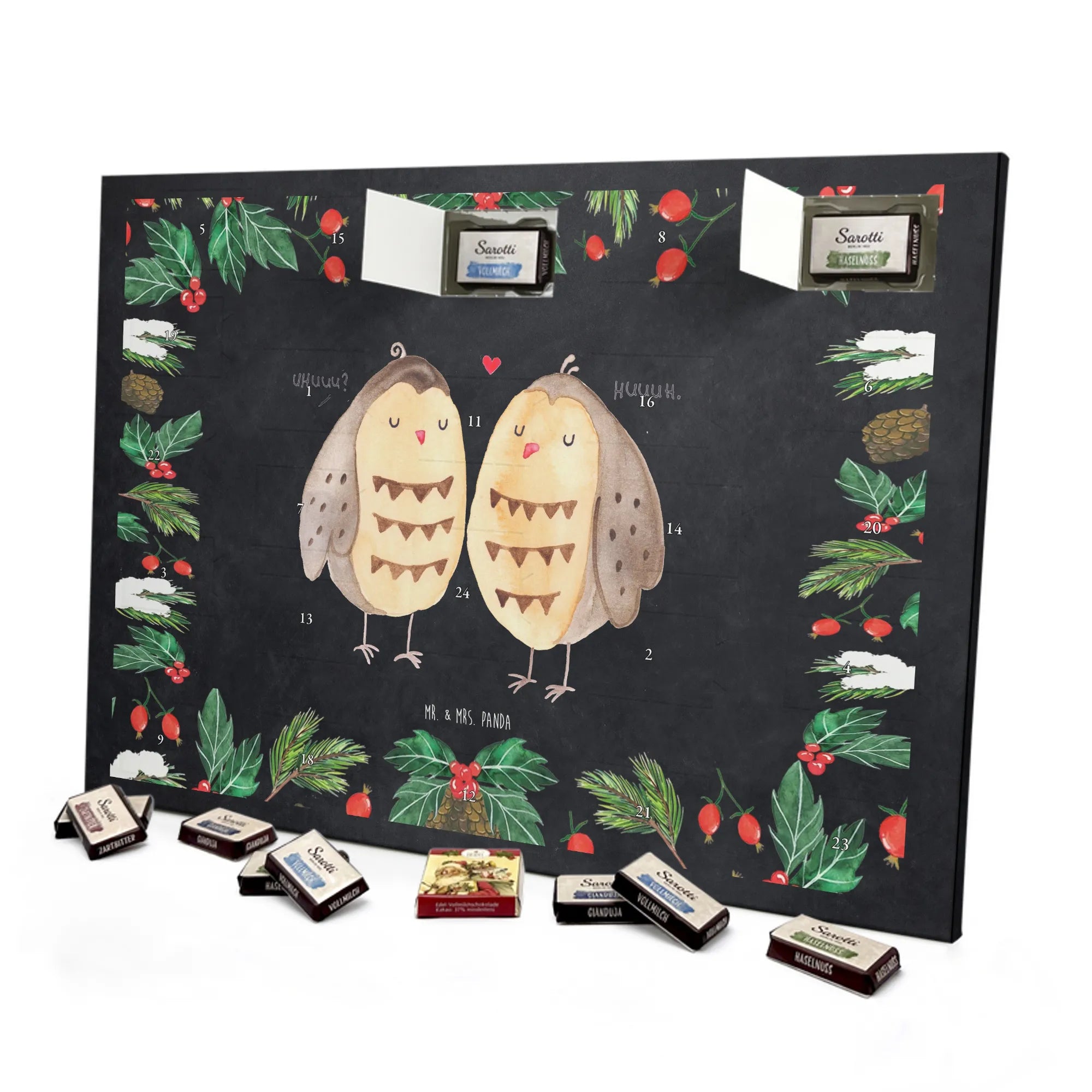 Adventskalender mit Schokolade – so schmeckt Vorfreude! Unser Mr. & Mrs. Panda Adventskalender ist liebevoll gestaltet und bedruckt mit wunderschönen Motiven & Sprüchen, die jeden Tag versüßen. Die brillante Druckqualität mit seidenmatter Oberflächenveredelung sorgt für ein edles Finish, und auch die Seitenflächen sind hübsch bedruckt. Der Kalender ist nicht personalisierbar, dafür aber vielseitig einsetzbar: Maße: 325 mm x 225 mm x 27 mm und die besondere Eigenschaft, dass du ihn aufgehängt oder aufgestellt verwenden kannst, geben dir Flexibilität bei der Dekoration. Gefüllt ist der Kalender mit Ritter Sport Schokowürfeln in beliebten Geschmacksrichtungen wie Mousse au Chocolat, Schoko Crisp, Voll-Nuss in Nougatcreme, Karamell Duo, Joghurt und Erdbeer-Joghurt. Wichtig: Es handelt sich um einen Kalender gefüllt mit Ritter Sport Schokolade, nicht um einen Kalender der Marke Ritter Sport. Ideal als Geschenk oder als Adventsdeko für dein Zuhause – kleine Schokofreuden warten hinter jedem Türchen.