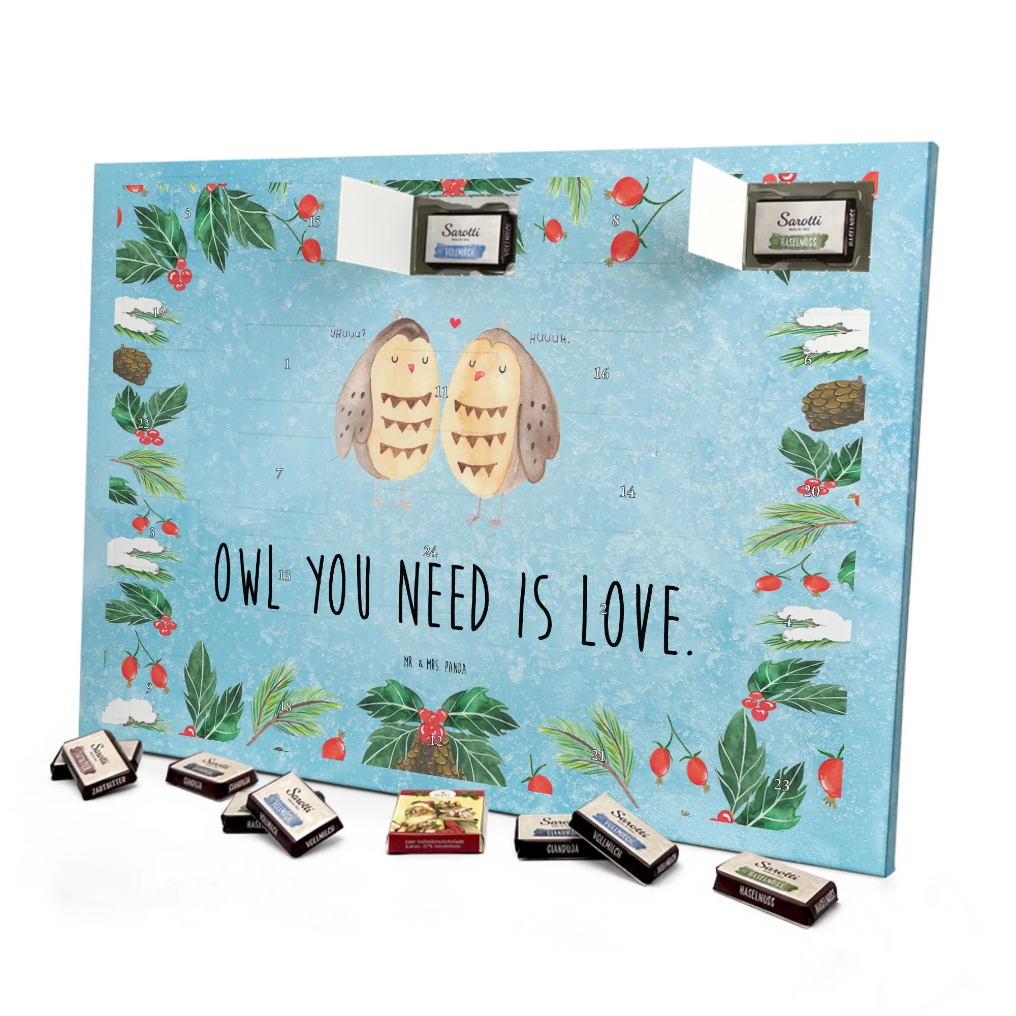 Mach die Vorweihnachtszeit besonders süß mit unserem Schoko-Adventskalender von Mr. & Mrs. Panda. Fröhliche Illustrationen und liebe Sprüche schmücken Vorder- und Seitenflächen, gedruckt in brillanter Qualität und veredelt mit einer seidenmatten Oberfläche für ein warmes, elegantes Finish. Der Kalender ist nicht personalisierbar, überzeugt dafür durch praktische Nutzung: zum Aufhängen oder Aufstellen geeignet. Hinter den 24 Türchen verbergen sich einzeln verpackte Schokoladentäfelchen in vier köstlichen Geschmacksrichtungen – Vollmilch, Nougat, Zartbitter und Haselnuss – von Sarotti® und Confiserie Heidel®. Insgesamt liefert der Kalender 107 g Markenschokolade. Maße: 355 mm x 245 mm x 11 mm – ideal, um Adventsfreude dekorativ zu präsentieren. Verschenke Liebe und Genuss in einem schönen Design, das sich wunderbar in jede Weihnachtsecke einfügt. Mr. & Mrs. Panda wünscht dir eine gemütliche Adventszeit voller kleiner, süßer Überraschungen.