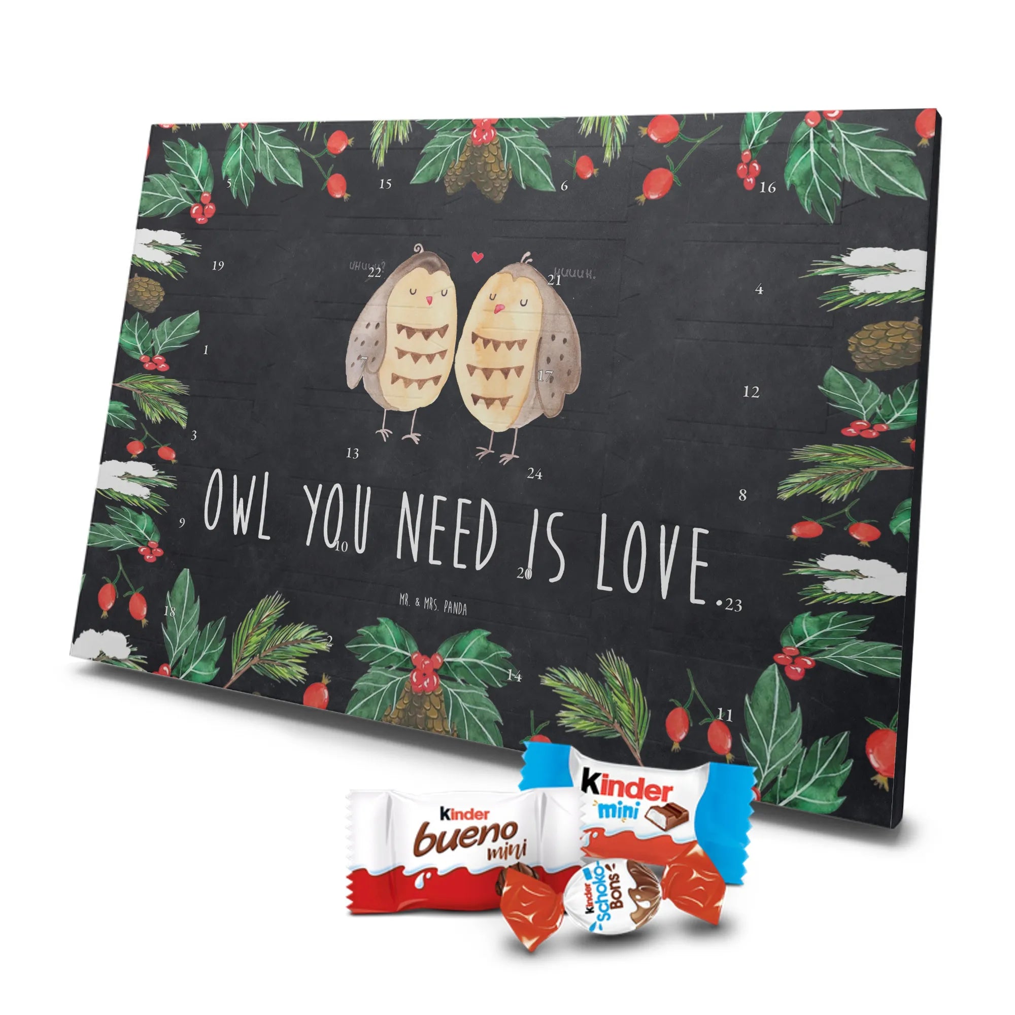 Adventskalender mit Schokolade – liebevoll gestaltet von Mr. & Mrs. Panda. Dieser niedliche Kalender ist bedruckt mit wunderschönen Motiven & Sprüchen von Mr. & Mrs. Panda und trotzdem nicht personalisierbar. Du bekommst brillante Druckqualität mit seidenmatter Oberflächenveredelung sowie bedruckte Seitenflächen, die dem Kalender ein hochwertiges Finish verleihen. Maße: 355 mm x 245 mm x 11 mm. Ein tolles Extra: kann aufgehängt oder aufgestellt werden, sodass du ihn flexibel platzieren kannst. Gefüllt mit Markenname Schokolade: Adventskalender gefüllt mit kinder® Schokolade. Inhalt: kinder® Schoko-Bons, kinder® Bueno mini und kinder® Schokolade mini. Die 24 Türchen sind liebevoll befüllt und sorgen jeden Tag für ein Lächeln – ideal für Kinder, Paare oder als kleines Geschenk für Freunde. Robust und dekorativ zugleich, bringt dieser Adventskalender süße Vorfreude in dein Zuhause. Verschenke oder genieße eine adventliche Zeit voller kleiner, schokoladiger Überraschungen!