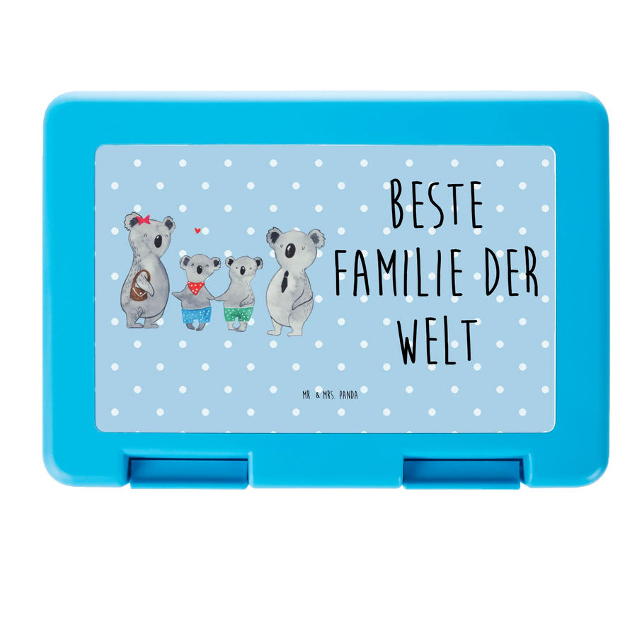 Die größte Koala-Dame mit ihrem roten Sternchen im Haar repräsentiert jede liebevolle Mama, während der zärtliche Papa mit Anzug und Krawatte für väterliche Hinwendung steht. Die beiden kleinen Koalas in bunten Shorts symbolisieren die unbeschwerte Kindheit und das Familienleben. "Beste Familie der Welt" steht als schöner Slogan auf der Brotdose, der perfekt für Geschenke an die eigene Familie geeignet ist.