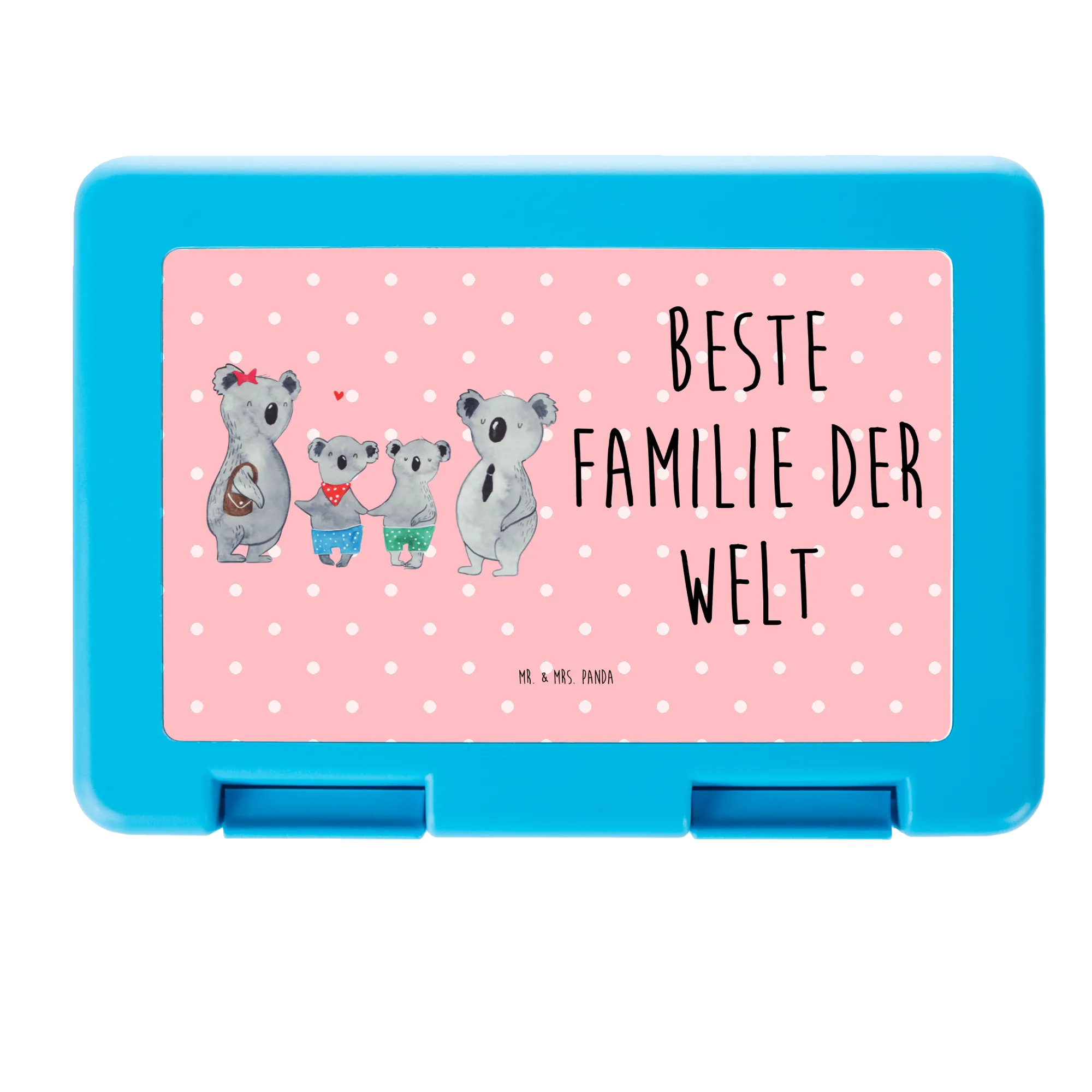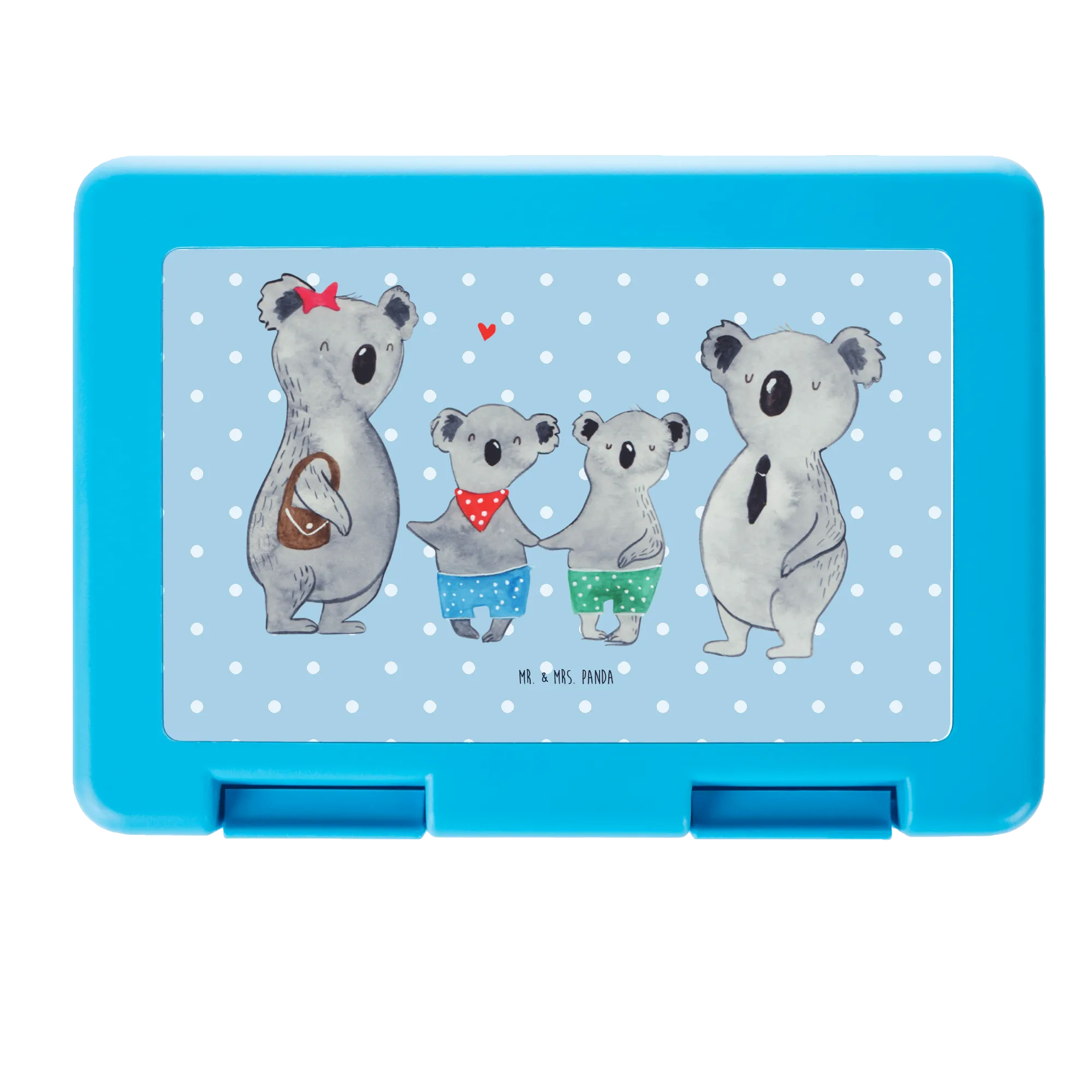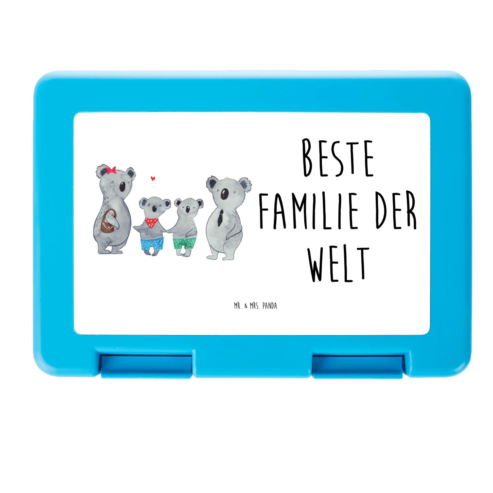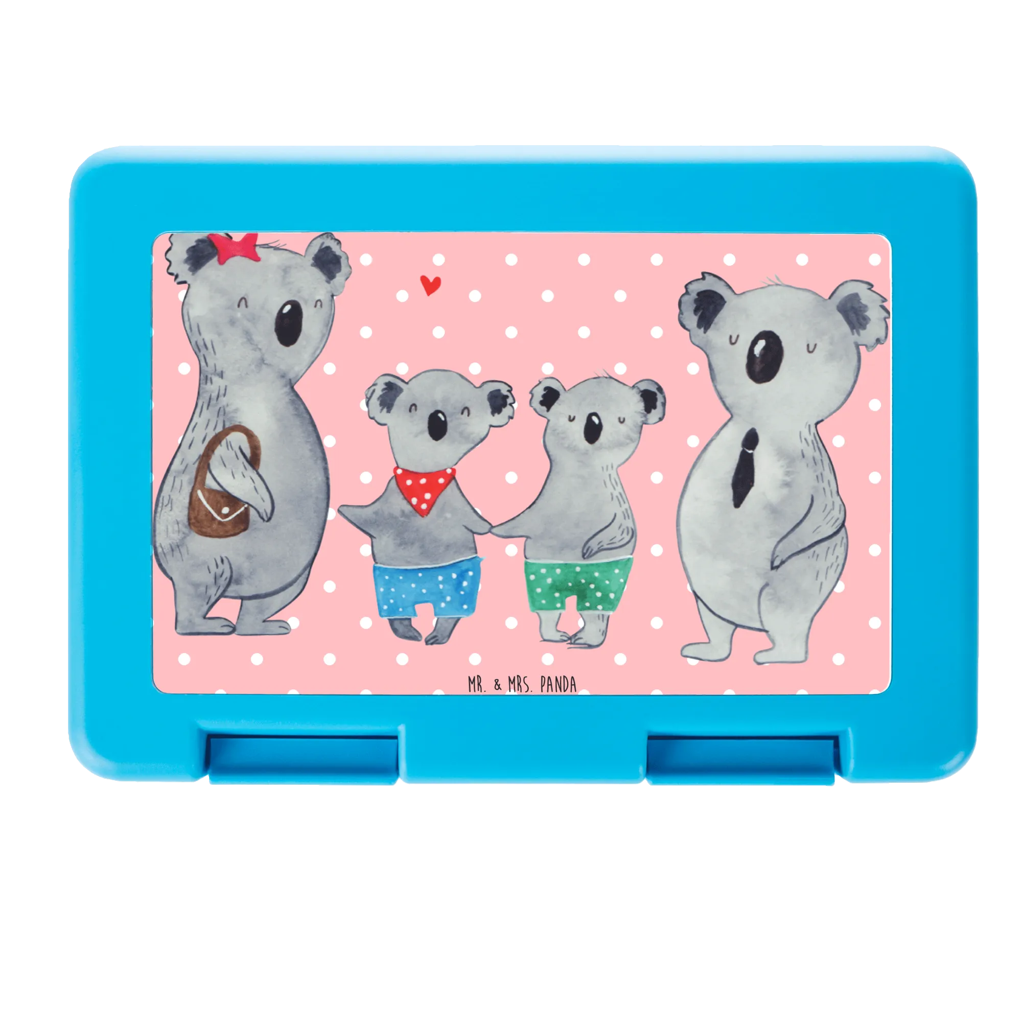 Der größte Koala, mit rotem Sternchen im Haar, verkörpert die Mama, während der Papa im Anzug mit Krawatte eine charmante Ausstrahlung hat. In der Mitte stehen zwei fröhliche Kinderkoalas, die die Verbundenheit und den Spaß innerhalb der Familie repräsentieren. Diese Brotdose ist ideal für die Schule oder den Arbeitsalltag.