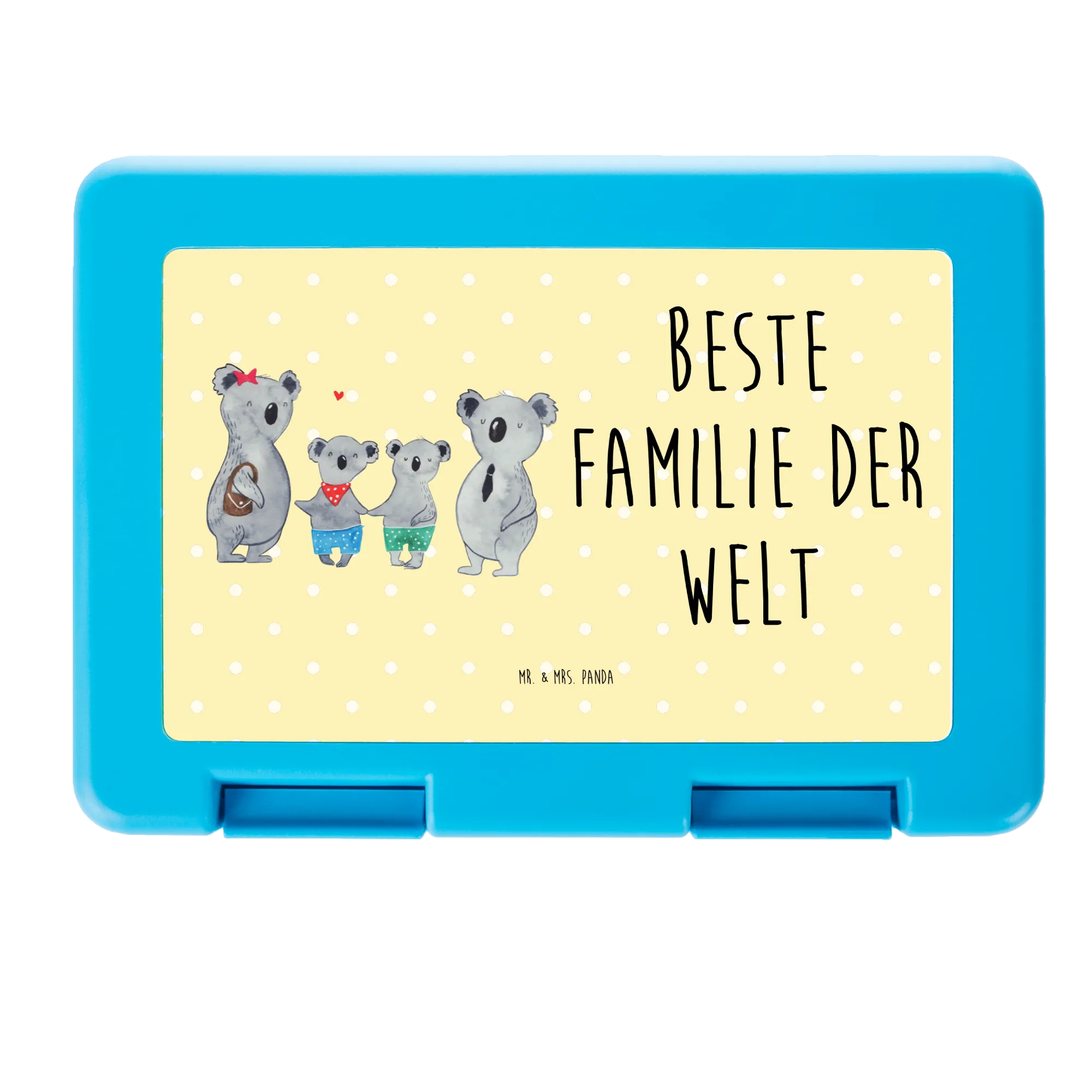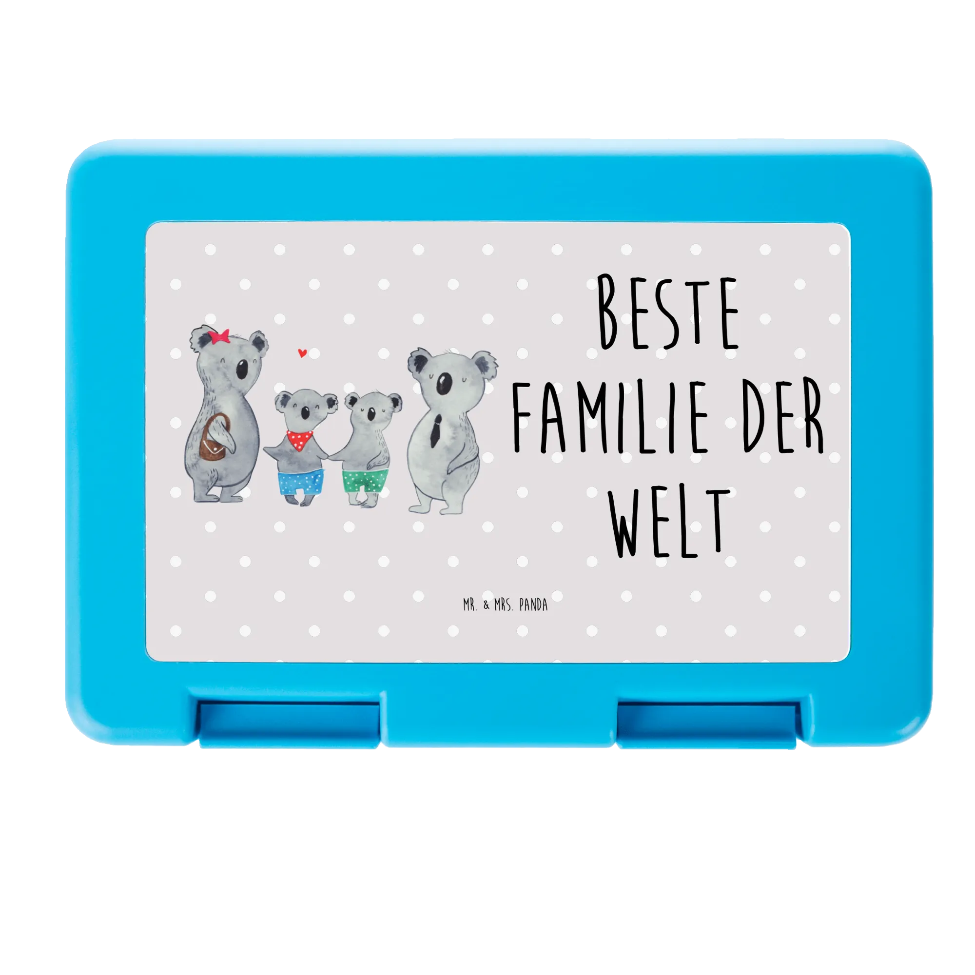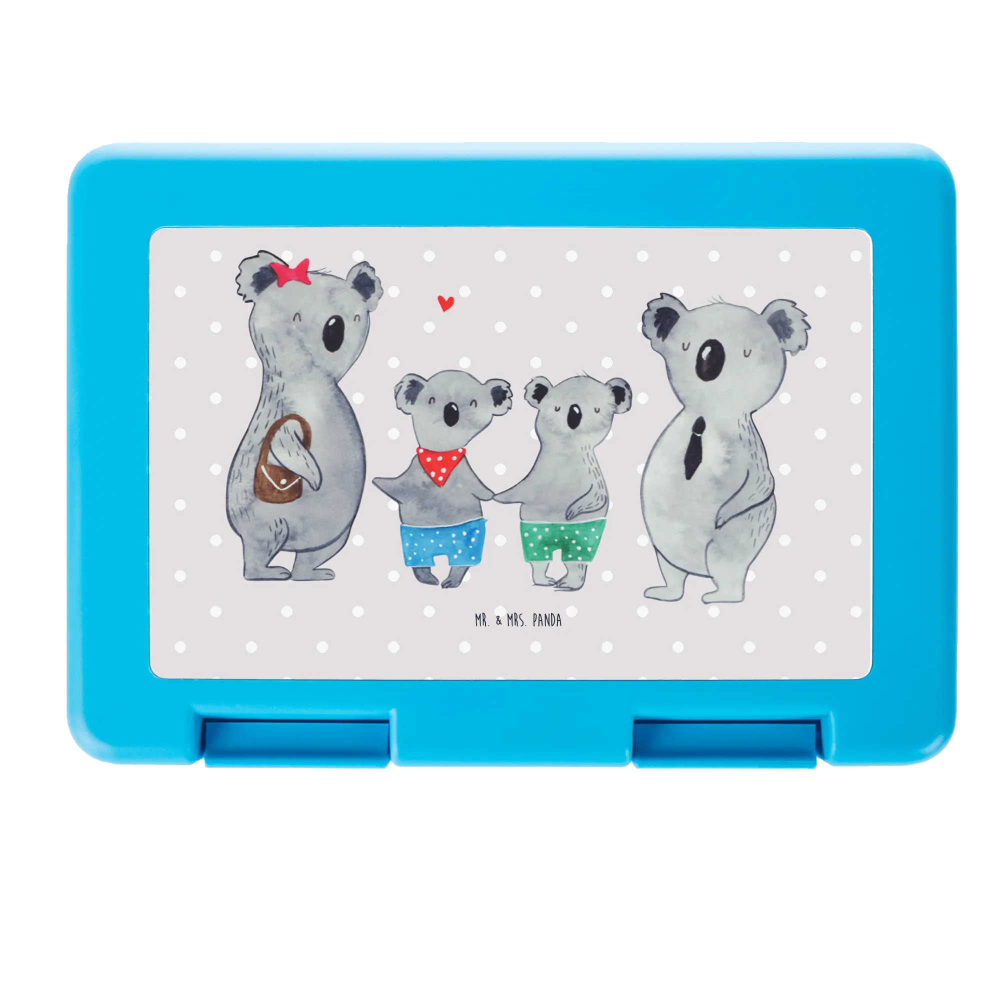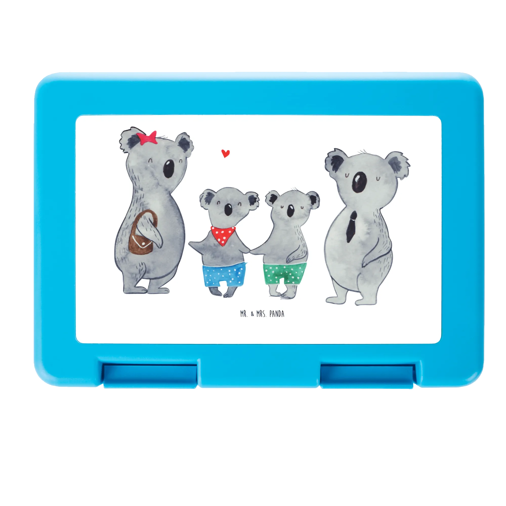 Der größte Koala, mit rotem Sternchen im Haar, verkörpert die Mama, während der Papa im Anzug mit Krawatte eine charmante Ausstrahlung hat. In der Mitte stehen zwei fröhliche Kinderkoalas, die die Verbundenheit und den Spaß innerhalb der Familie repräsentieren. Diese Brotdose ist ideal für die Schule oder den Arbeitsalltag.