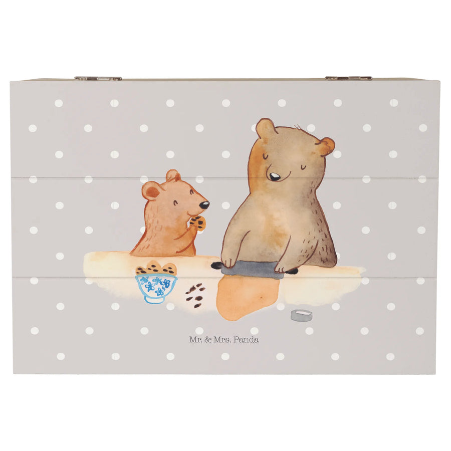 Mit einem herzlichen Motiv, das zwei knuffige Bären zeigt, die zusammen Kekse backen, verbreitet die Kiste ein Gefühl von Wärme und Geborgenheit. Der größere Bär, der liebevoll als Oma interpretiert werden kann, lächelt während der kleinere Bär genüsslich einen Keks kostet. Diese Szenerie ist eine perfekte Darstellung des familiären Miteinanders beim Backen, das viele von uns in der Kindheit erlebt haben.