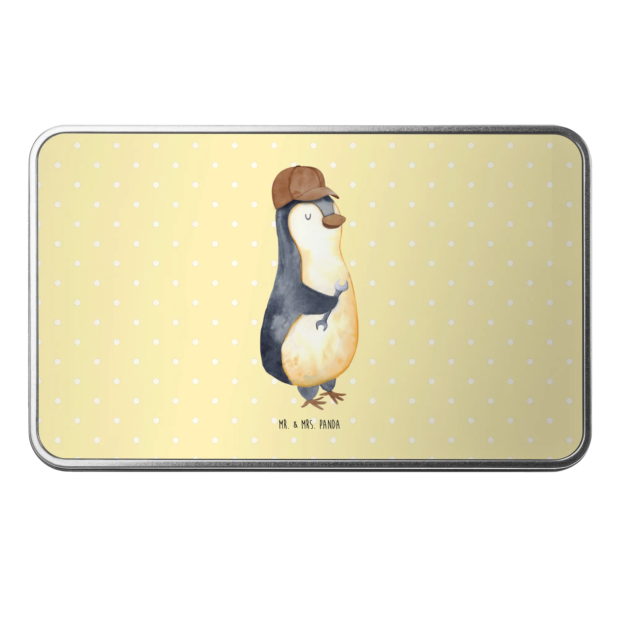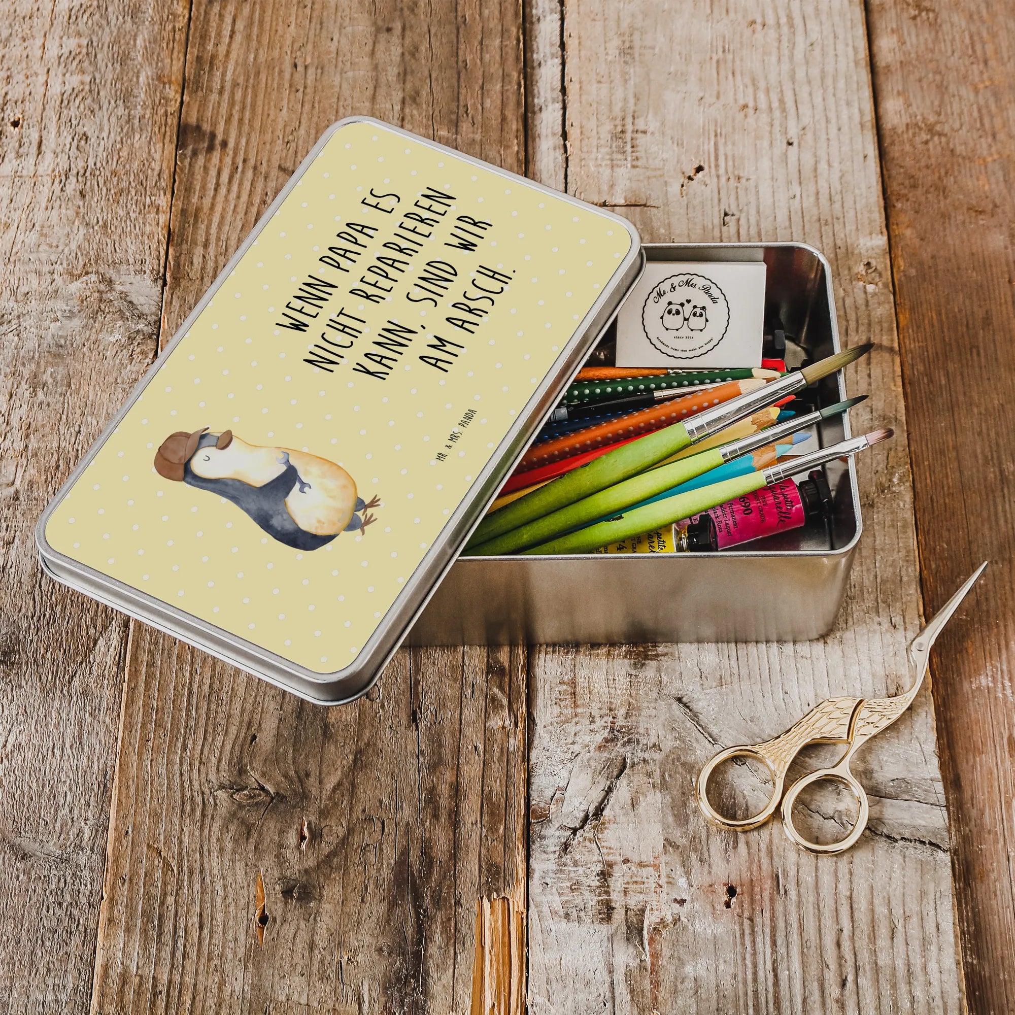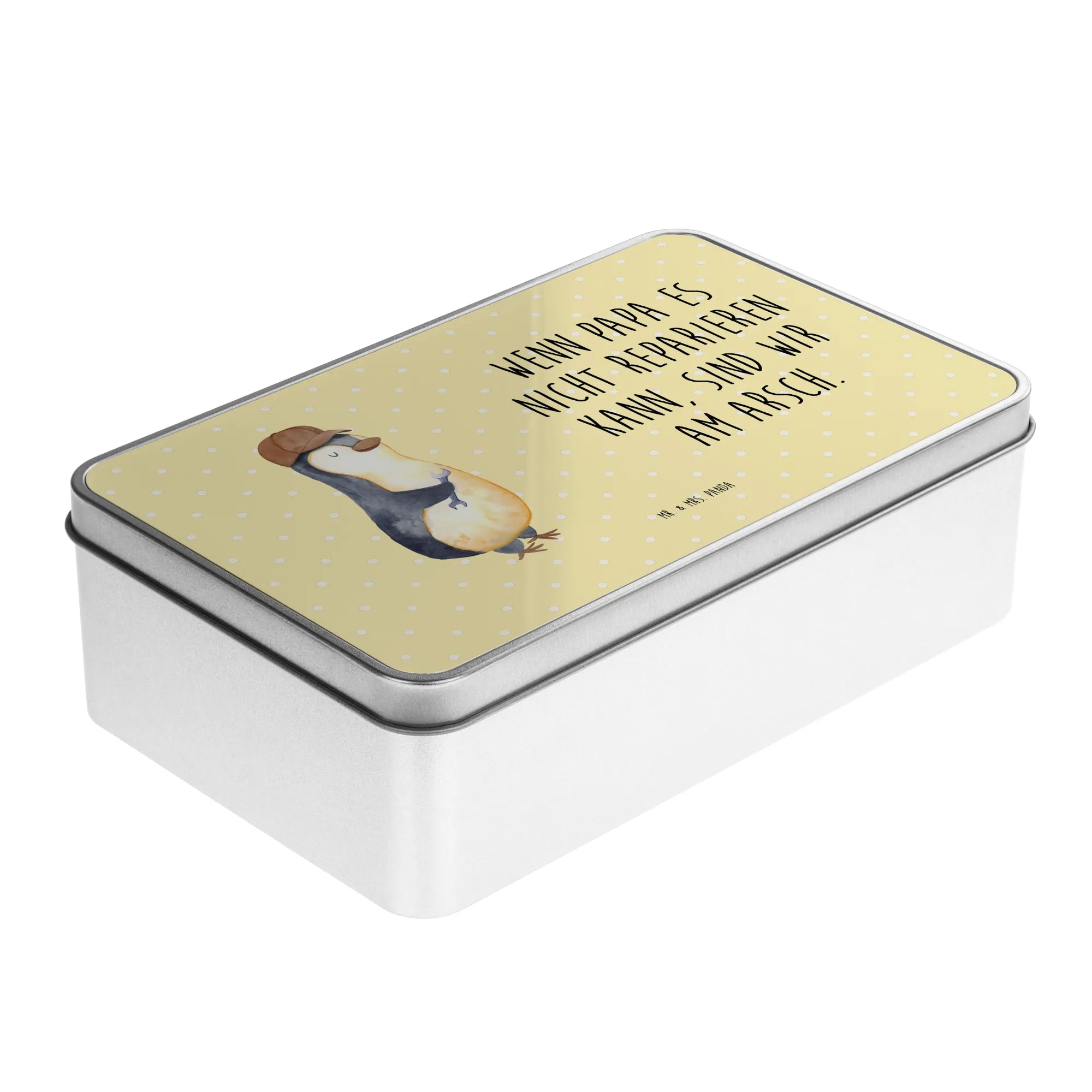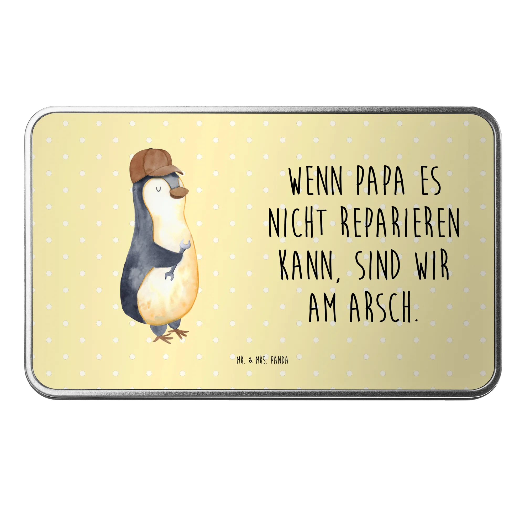 Eine wunderschöne Metalldose von Mr. & Mrs. Panda – bedruckt mit dem frechen Spruch „Wenn Papa es nicht reparieren kann, sind wir am Arsch.“ und einem charmanten Pinguin mit Schraubenschlüssel. Die pastellgelbe Dose bringt Humor und Herz in dein Zuhause und ist das perfekte Geschenk für Papas, die handwerklich begabt sind und für ihren trockenen Humor bekannt werden wollen. 🎁