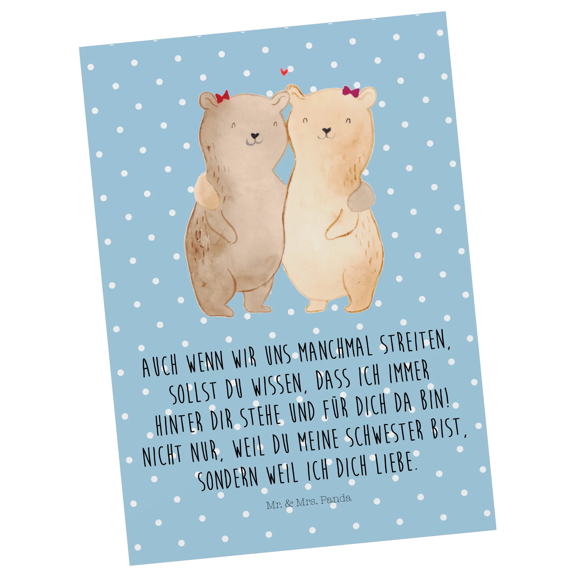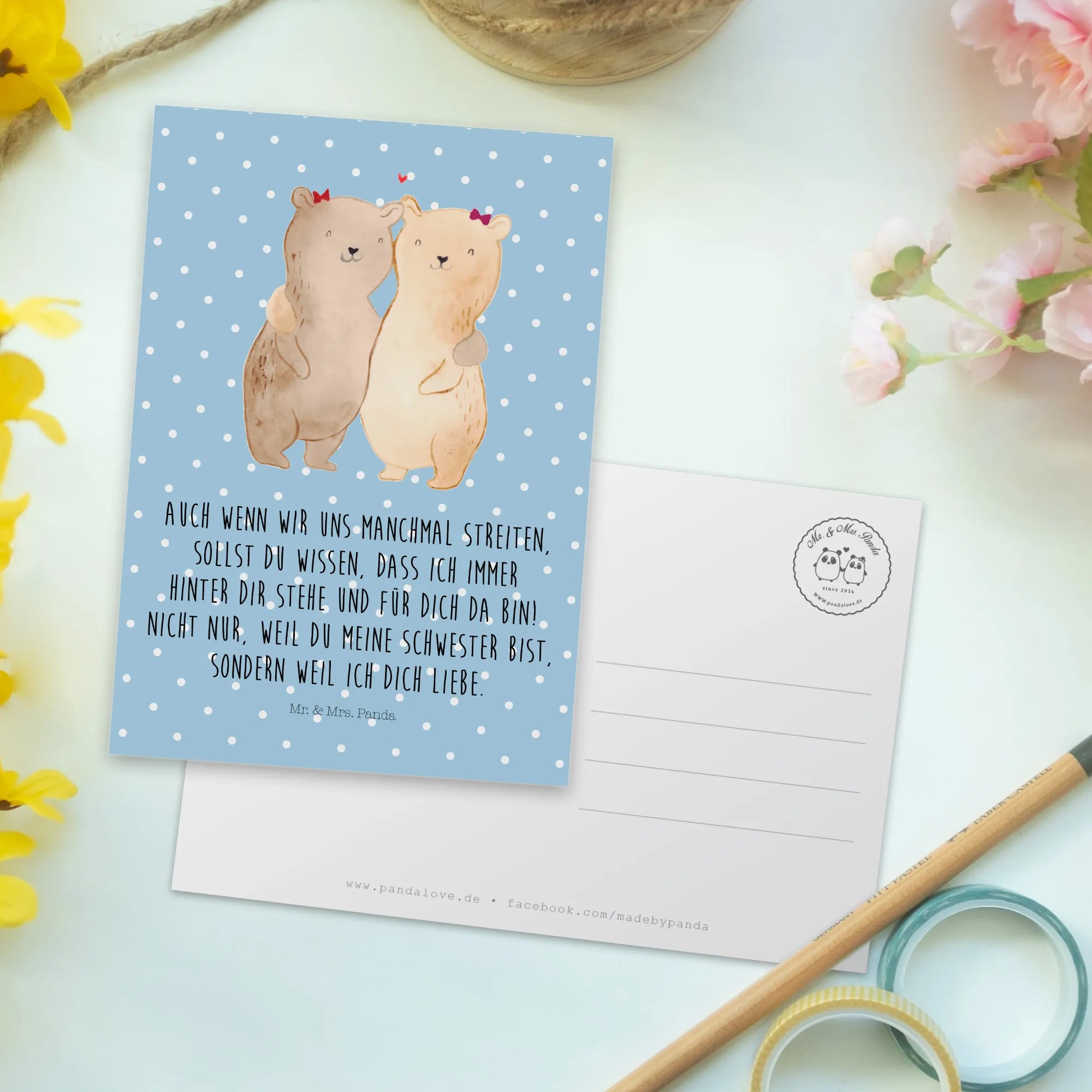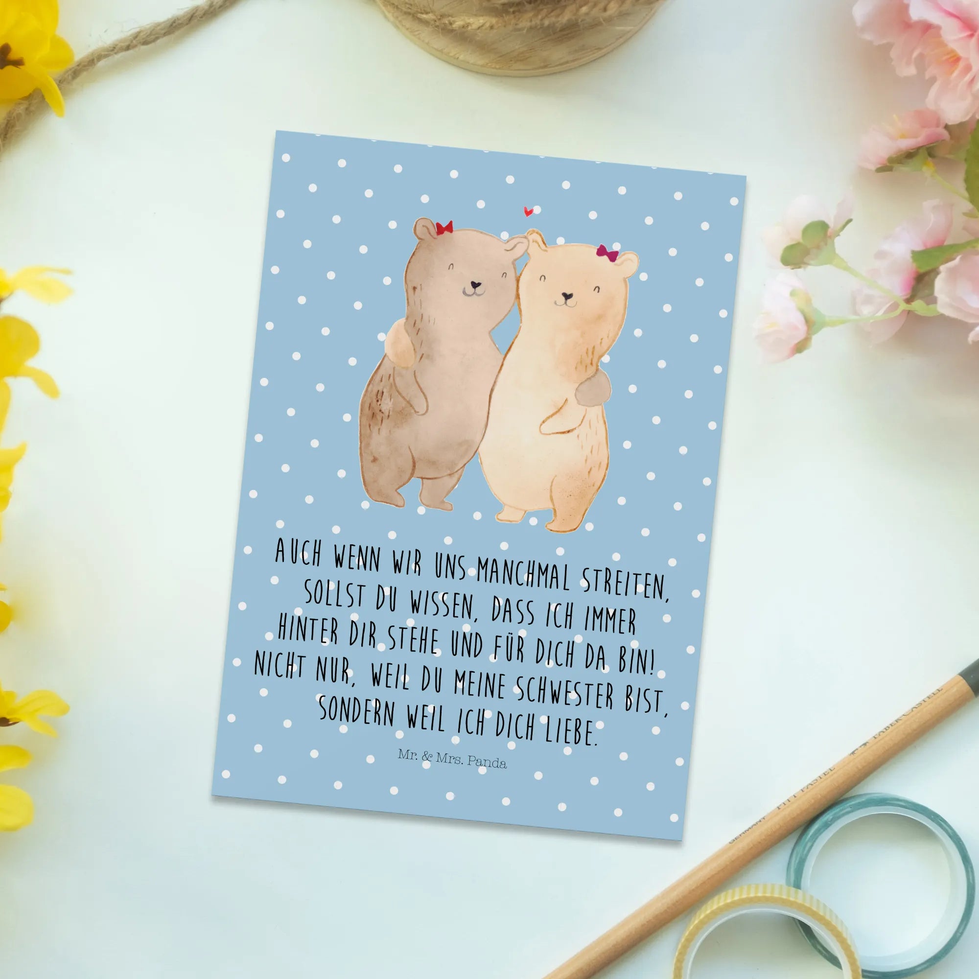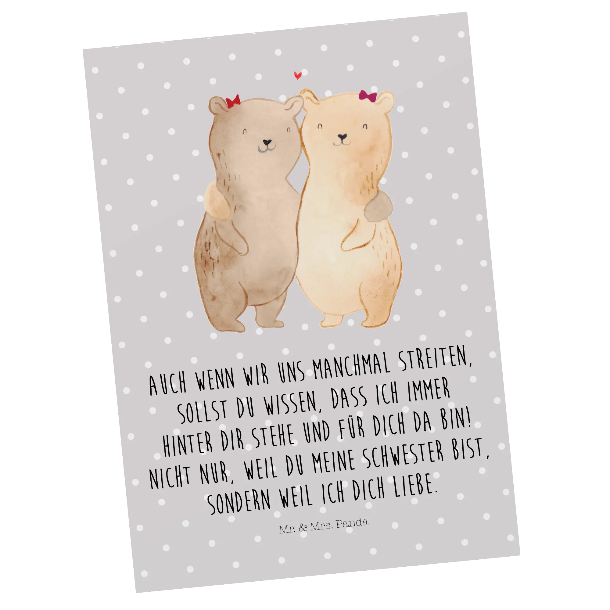 Die hochwertige Postkarte "Bären Schwestern" von Mr. & Mrs. Panda ist das perfekte Geschenk für deine Schwester oder für jeden Anlass, an dem du deiner Schwester mal wieder zeigen möchtest, wie lieb du sie hast. Die Karte besteht aus edlem, 300 Gramm schwerem Karton, der nicht nur robust ist, sondern auch einen hochglänzend veredelten Druck besitzt, der die süßen Motive zum Strahlen bringt.