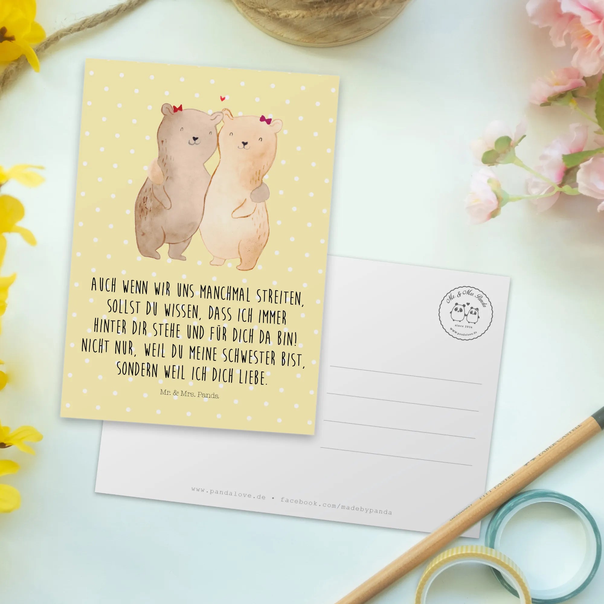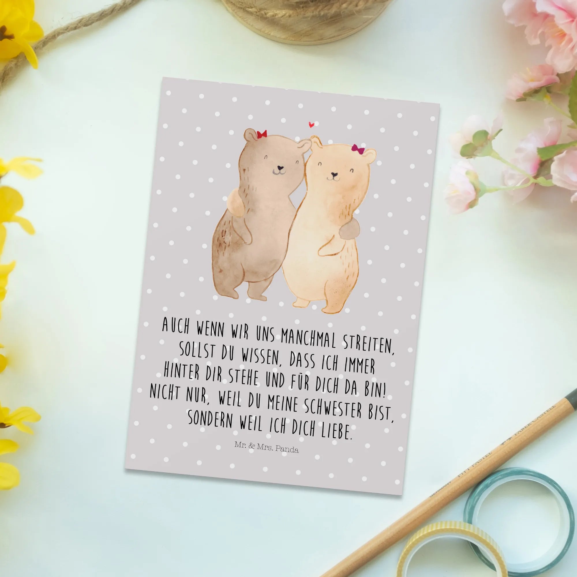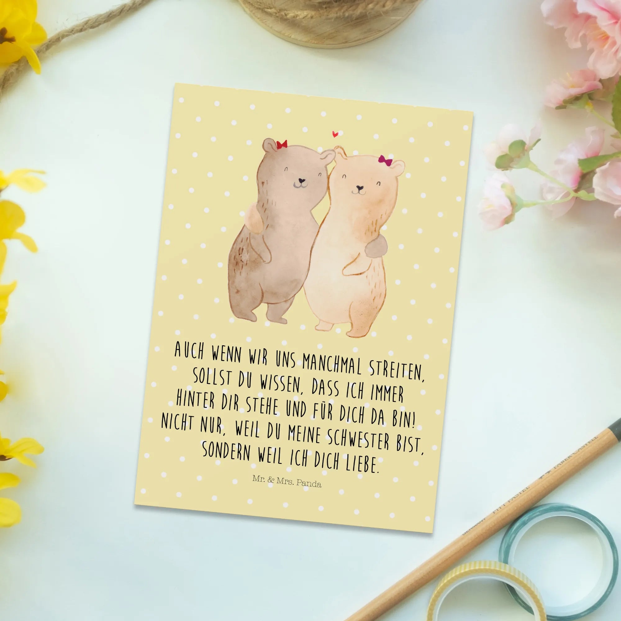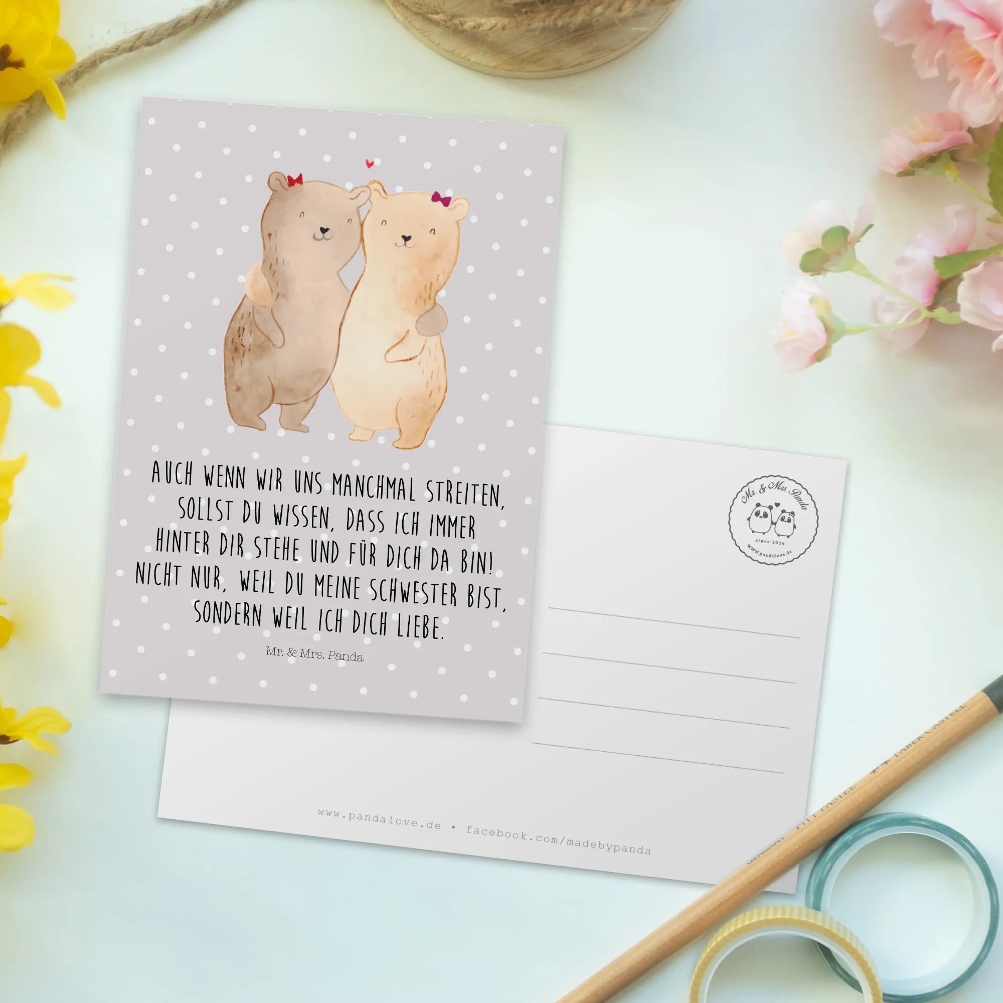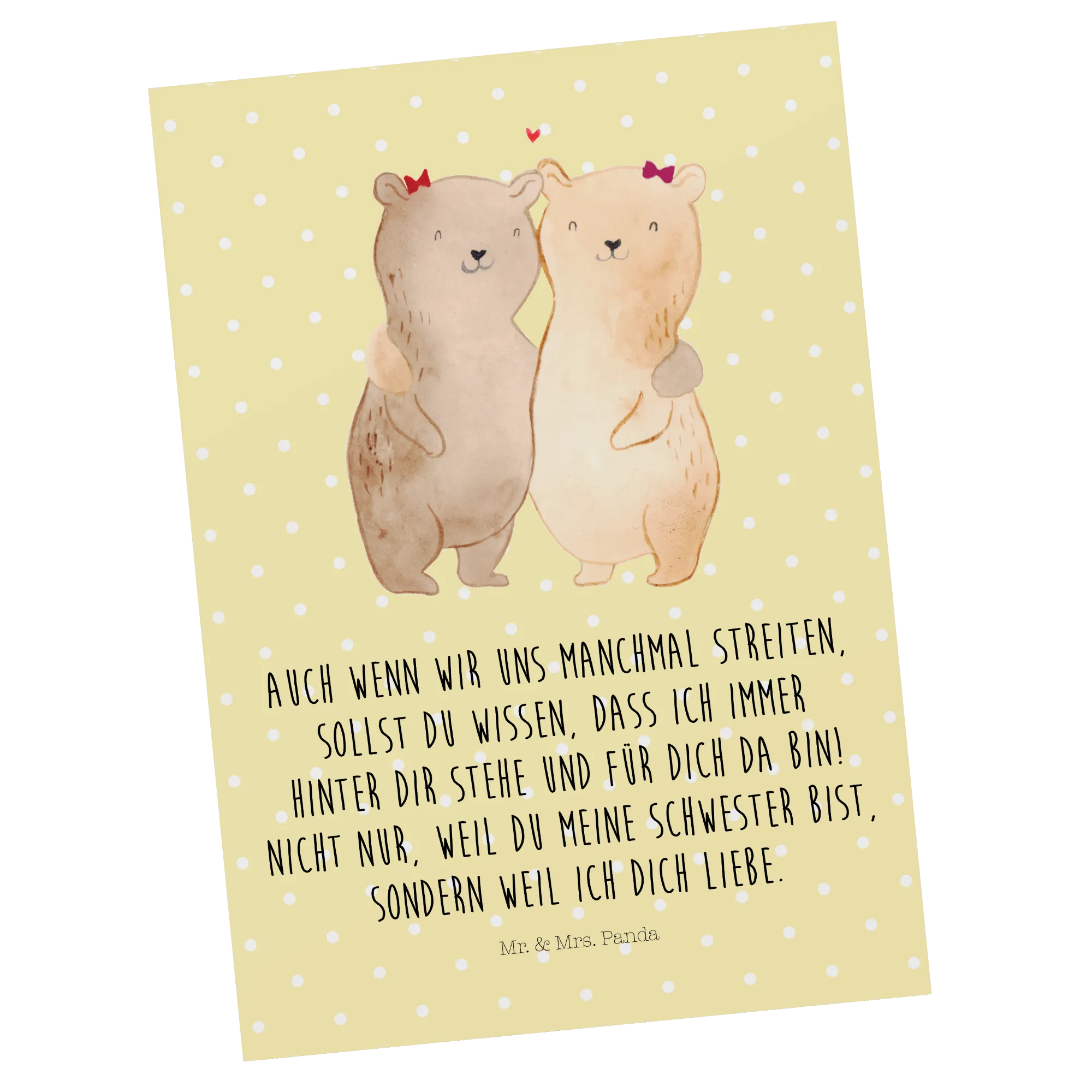 Die hochwertige Postkarte "Bären Schwestern" von Mr. & Mrs. Panda ist das perfekte Geschenk für deine Schwester oder für jeden Anlass, an dem du deiner Schwester mal wieder zeigen möchtest, wie lieb du sie hast. Die Karte besteht aus edlem, 300 Gramm schwerem Karton, der nicht nur robust ist, sondern auch einen hochglänzend veredelten Druck besitzt, der die süßen Motive zum Strahlen bringt.