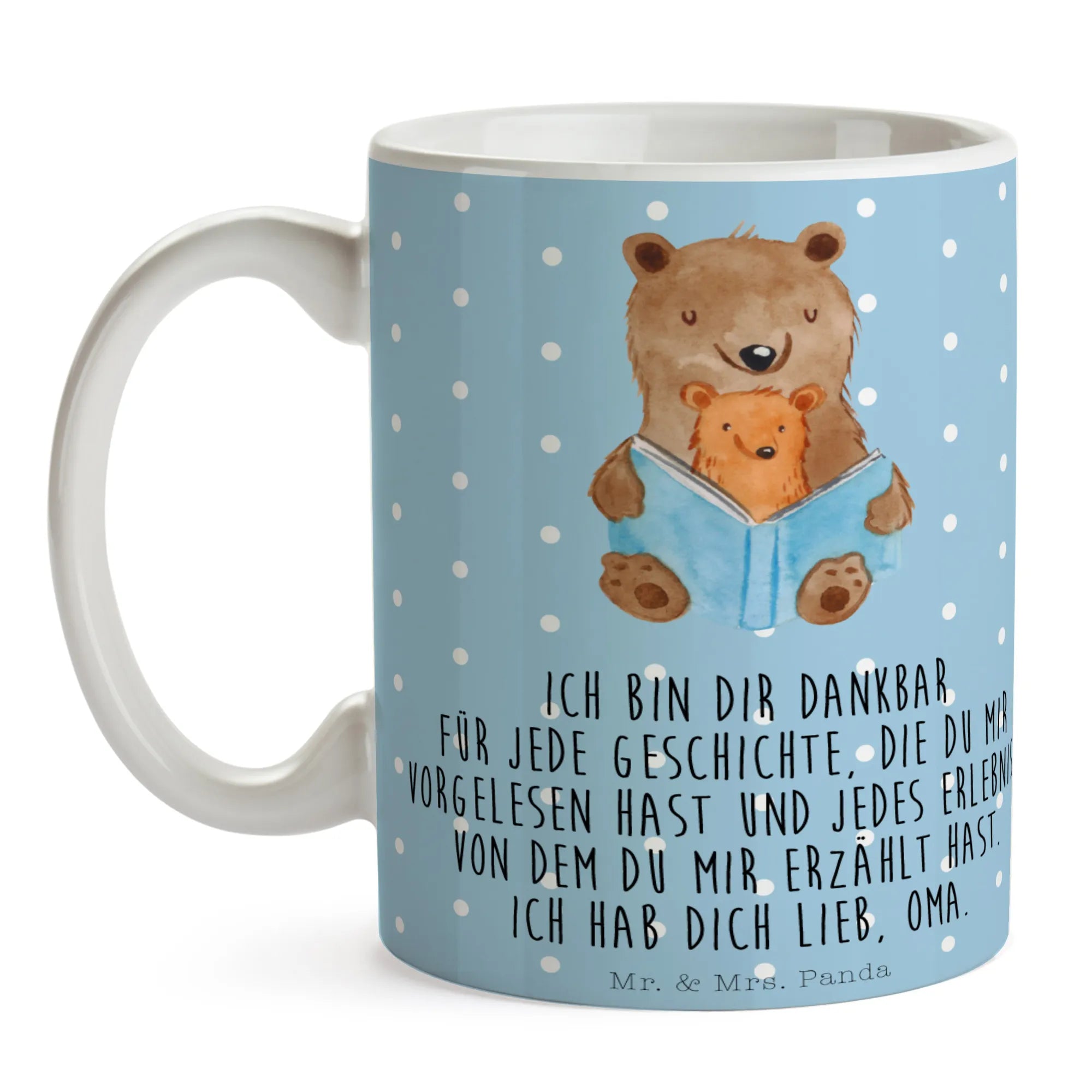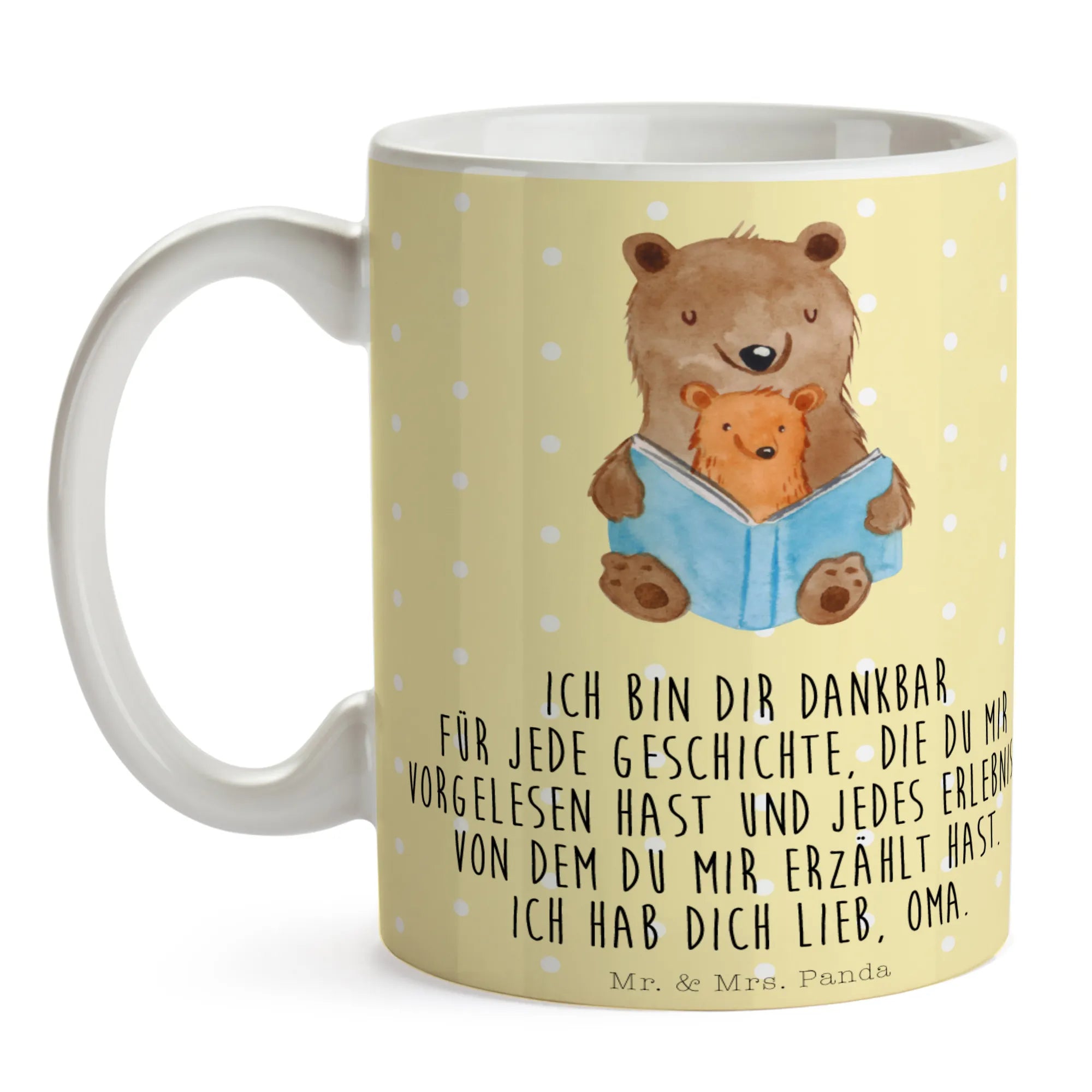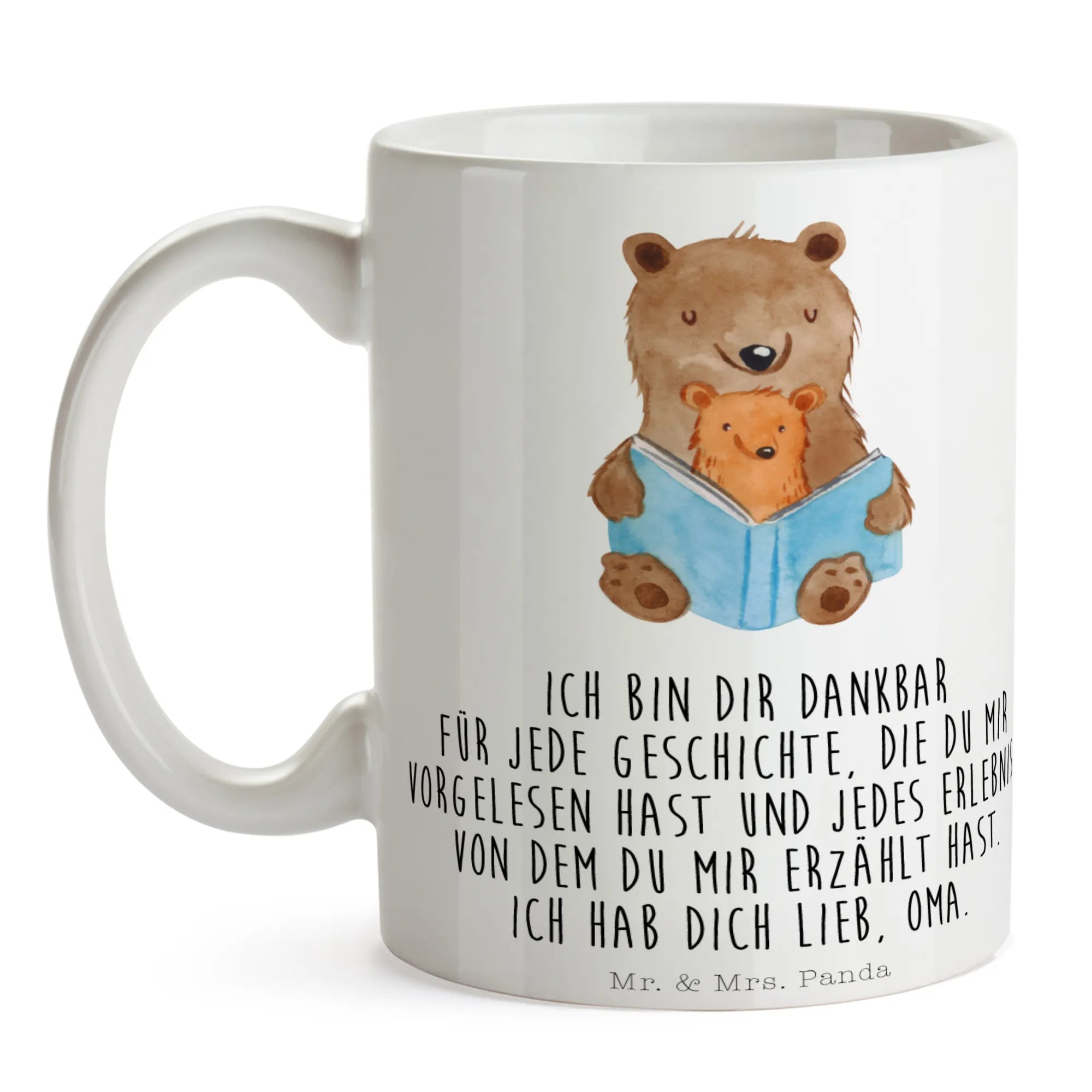 Die wunderschöne Tasse "Bären Buch" aus der Familien Kollektion von Mr. & Mrs. Panda ist das perfekte Geschenk für alle, die die herzlichen Geschichten und besonderen Momente mit ihrer Oma oder ihrem Opa schätzen. Diese Keramiktasse ist nicht nur ein tolles Alltagsobjekt, sondern auch ein liebevolles Erinnerungsstück, das beim Trinken von Kaffee oder Tee eine warme Botschaft übermittelt: "Ich bin dir dankbar für jede Geschichte, die du mir vorgelesen hast und jedes Erlebnis, von dem du mir erzählt hast. Ich hab dich lieb, Oma."
