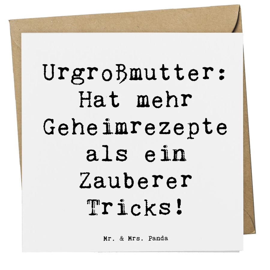 Mit dem charmanten Spruch "Urgroßmutter: Hat mehr Geheimrezepte als ein Zauberer Tricks!" wird die Karte zu einem wahren Schatz für jeden, der das Glück hat, eine Urgroßmutter zu haben. Die Karte hat ein luxuriöses Design mit hochglänzender Vorderseite und einer matte Innenseite, perfekt zum individuellen Beschriften.