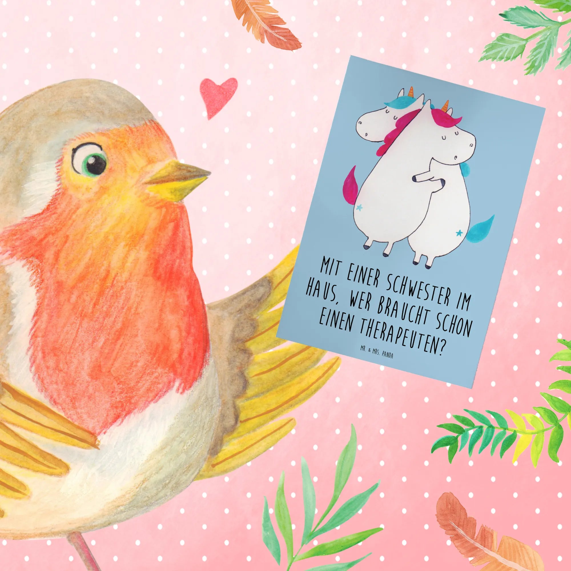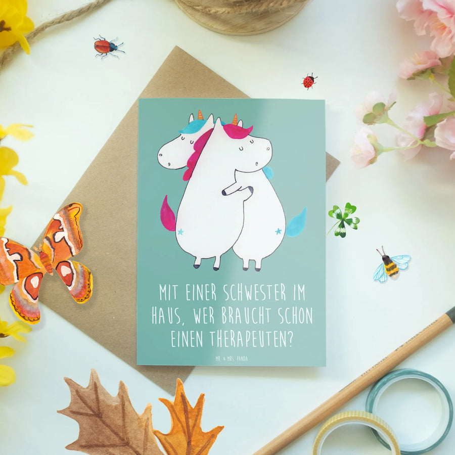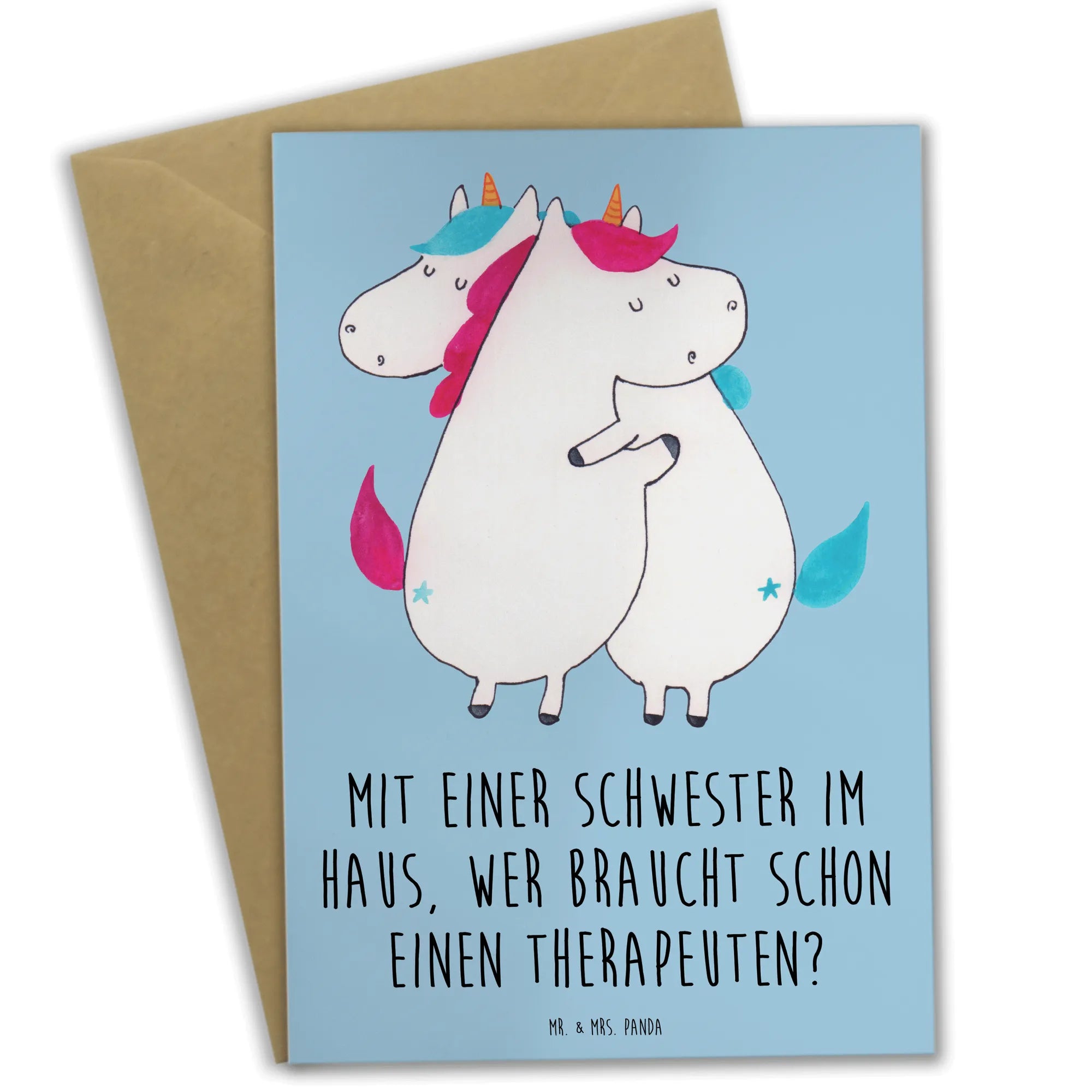 Die Grußkarte "Mit einer Schwester im Haus, wer braucht schon einen Therapeuten?" von Mr. & Mrs. Panda ist das perfekte Geschenk für jede Schwester. Ob zum Geburtstag, zur Hochzeit oder einfach nur so - mit dieser liebevoll gestalteten Karte drückst Du Deine Gefühle aus und zeigst Deiner Schwester, wie wichtig sie für Dich ist.