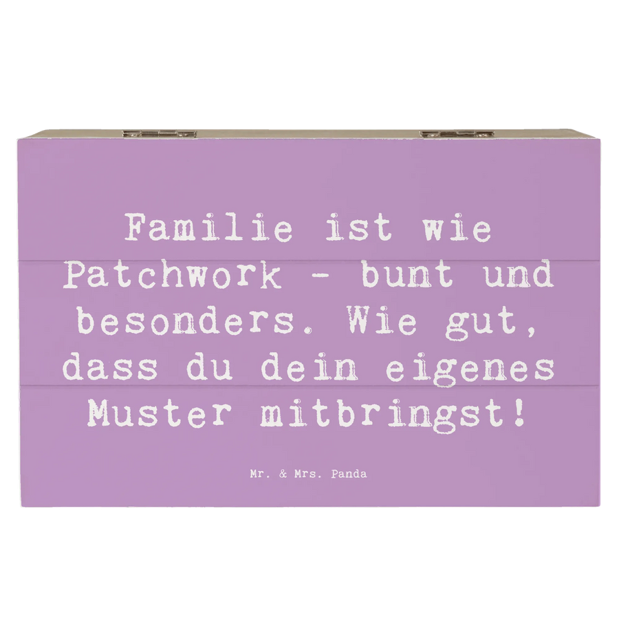 Der wunderbare Spruch "Familie ist wie Patchwork - bunt und besonders. Wie gut, dass du dein eigenes Muster mitbringst!" ziert den Deckel dieser Kiste und erinnert an die einzigartigen Familienbande, die durch Adoption entstehen. Dieses Motto ist nicht nur ein schöner Gedanke, sondern unterstreicht auch die Liebe und den Zusammenhalt, die in einer Patchworkfamilie bestehen.