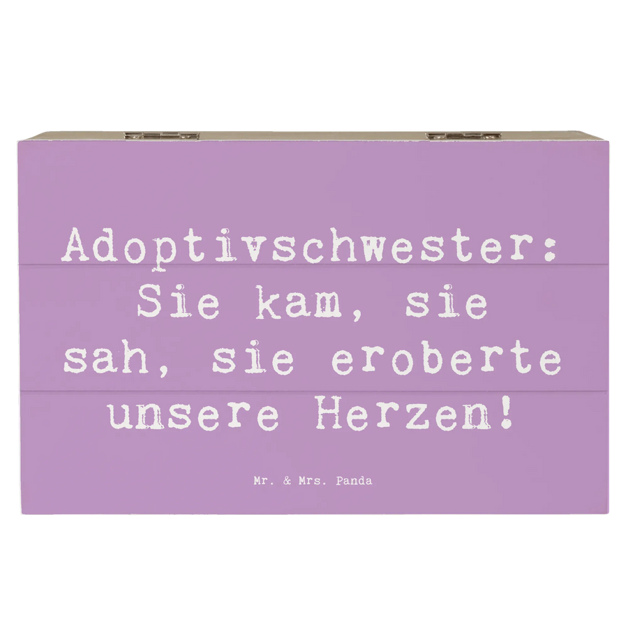 Die wunderschöne Holzkiste von Mr. & Mrs. Panda ist das perfekte Geschenk für Deine Adoptivschwester. Mit dem liebevollen Spruch "Adoptivschwester: Sie kam, sie sah, sie eroberte unsere Herzen!" feierst Du die besondere Verbindung, die über genetische Bindungen hinausgeht.