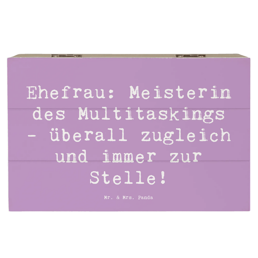 Entdecke die perfekte Holzkiste von Mr. & Mrs. Panda, ideal für die wundervolle Ehefrau in deinem Leben! Diese liebevoll gestaltete Holzkiste mit dem originellen Spruch „Ehefrau: Meisterin des Multitaskings - überall zugleich und immer zur Stelle!“ ist nicht nur ein praktischer Aufbewahrungsort für all die kleinen Schätze des Lebens, sondern auch ein wunderschönes Erinnerungsstück.