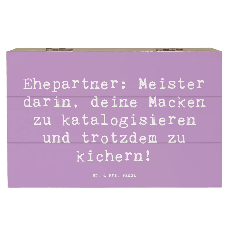 Mit dem Spruch "Ehepartner: Meister darin, deine Macken zu katalogisieren und trotzdem zu kichern!" spricht sie die besondere Verbindung an, die Partner miteinander teilen. Ob für den Jahrestag, den Valentinstag oder einfach nur als kleine, liebevolle Geste zwischendurch – diese Erinnerungskiste ist ein absolutes Must-Have!