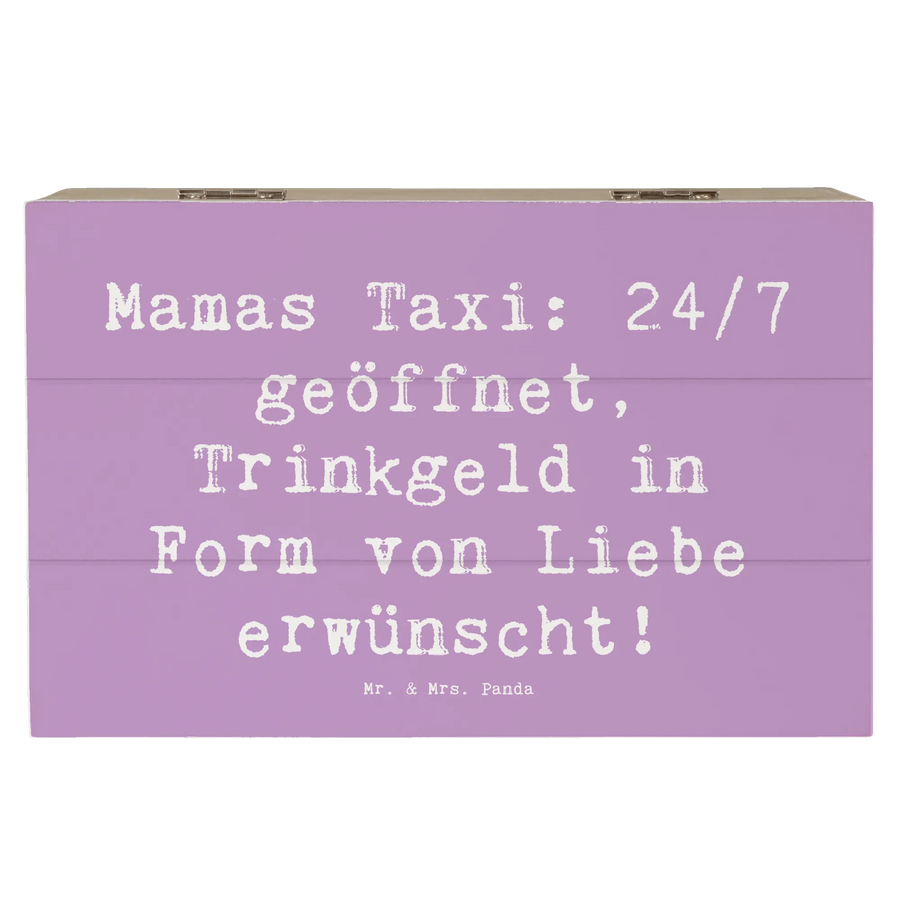 Die wunderschöne Holzkiste von Mr. & Mrs. Panda ist das perfekte Geschenk für Mamas und all jene, die die liebevolle Rolle der Mama in ihrem Leben schätzen. Mit dem Slogan „Mamas Taxi: 24/7 geöffnet, Trinkgeld in Form von Liebe erwünscht!“ weckst Du die warmen Erinnerungen an Geborgenheit und Fürsorge. Diese Erinnerungskiste ist ideal als Aufbewahrungsort für all die kleinen Schätze, die mit besonderen Momenten verbunden sind, sei es die erste Zeichnung des Kindes, Fotos von festlichen Anlässen oder Geschenke von herzlichen Verwandten.
