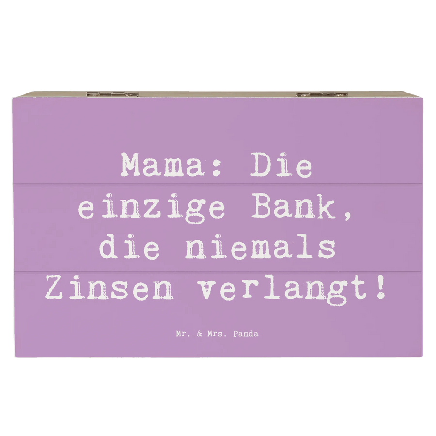Die wunderschöne Holzkiste von Mr. & Mrs. Panda ist das perfekte Geschenk für jede Mutter und bringt ein Lächeln in ihr Gesicht. Diese Erinnerungskiste ist mehr als nur ein einfacher Aufbewahrungsort – sie ist eine Schatzkiste voller schöner Momente. Egal ob zum Muttertag, zum Geburtstag oder einfach als Dankeschön, diese Holzkiste eignet sich hervorragend, um die wertvollen Schätze Deines Lebens zu bewahren: von den ersten Babysachen über liebenswerte Zeichnungen bis hin zu Fotos von unvergesslichen Familienmomenten. Mit dem liebevollen Motto 'Mama: Die einzige Bank, die niemals Zinsen verlangt!' wird jedes Herz berührt.