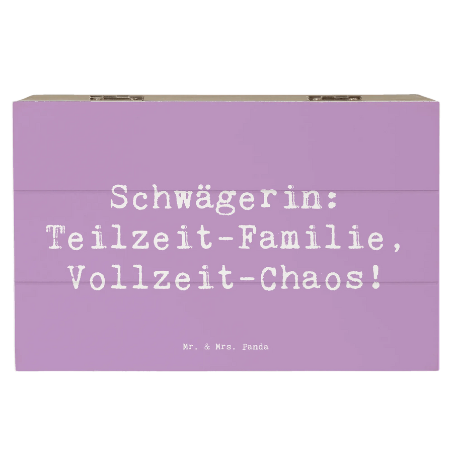 Die Holzkiste für Schwägerinnen von Mr. & Mrs. Panda ist das perfekte Geschenk, um die wertvollen Erinnerungen und besonderen Momente mit einer geliebten Verwandten zu bewahren. Mit dem liebevollen Spruch "Schwägerin: Teilzeit-Familie, Vollzeit-Chaos!" wird jeder Anlass zu etwas Einzigartigem.