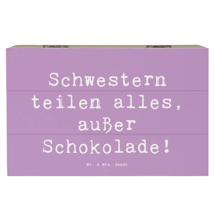 Die Holzkiste von Mr. & Mrs. Panda ist das perfekte Geschenk für Deine Schwester – egal ob für den Geburtstag, den Muttertag oder einfach nur so! Mit ihrem zauberhaften Motiv "Schwestern teilen alles, außer Schokolade!" bringt diese Schatzkiste ein Lächeln auf jedes Gesicht.