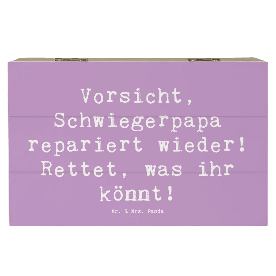 Die wunderschöne Holzkiste "Vorsicht, Schwiegerpapa repariert wieder! Rettet, was ihr könnt!" von Mr. & Mrs. Panda ist das perfekte Geschenk für all die großartigen Schwiegerpapas da draußen!