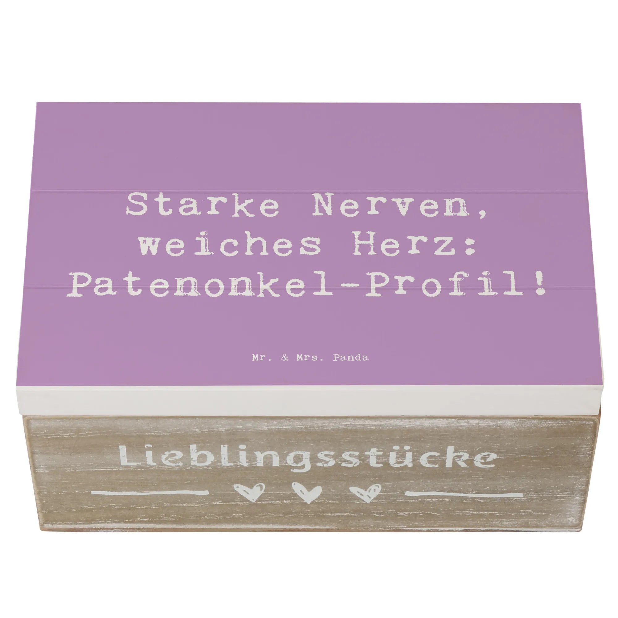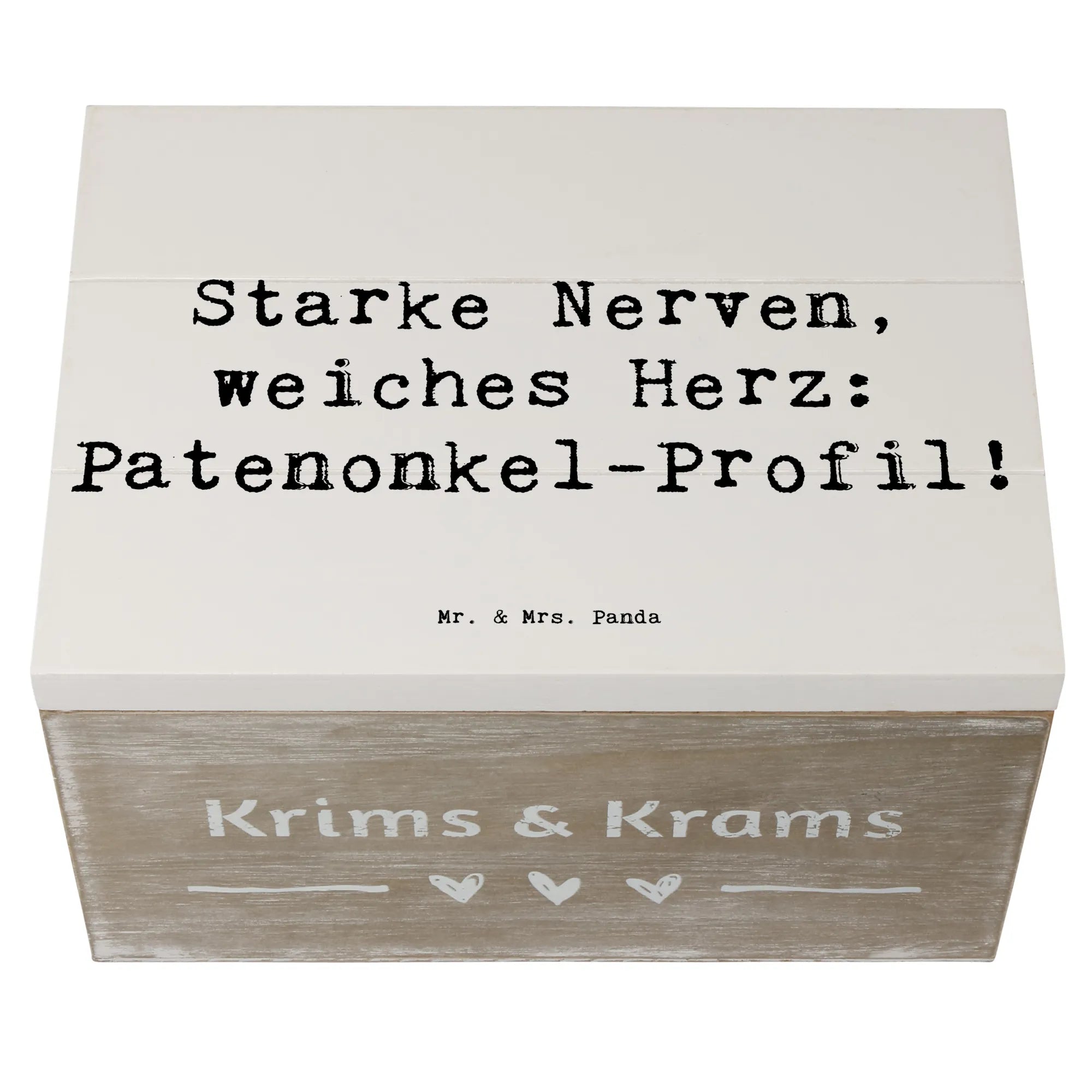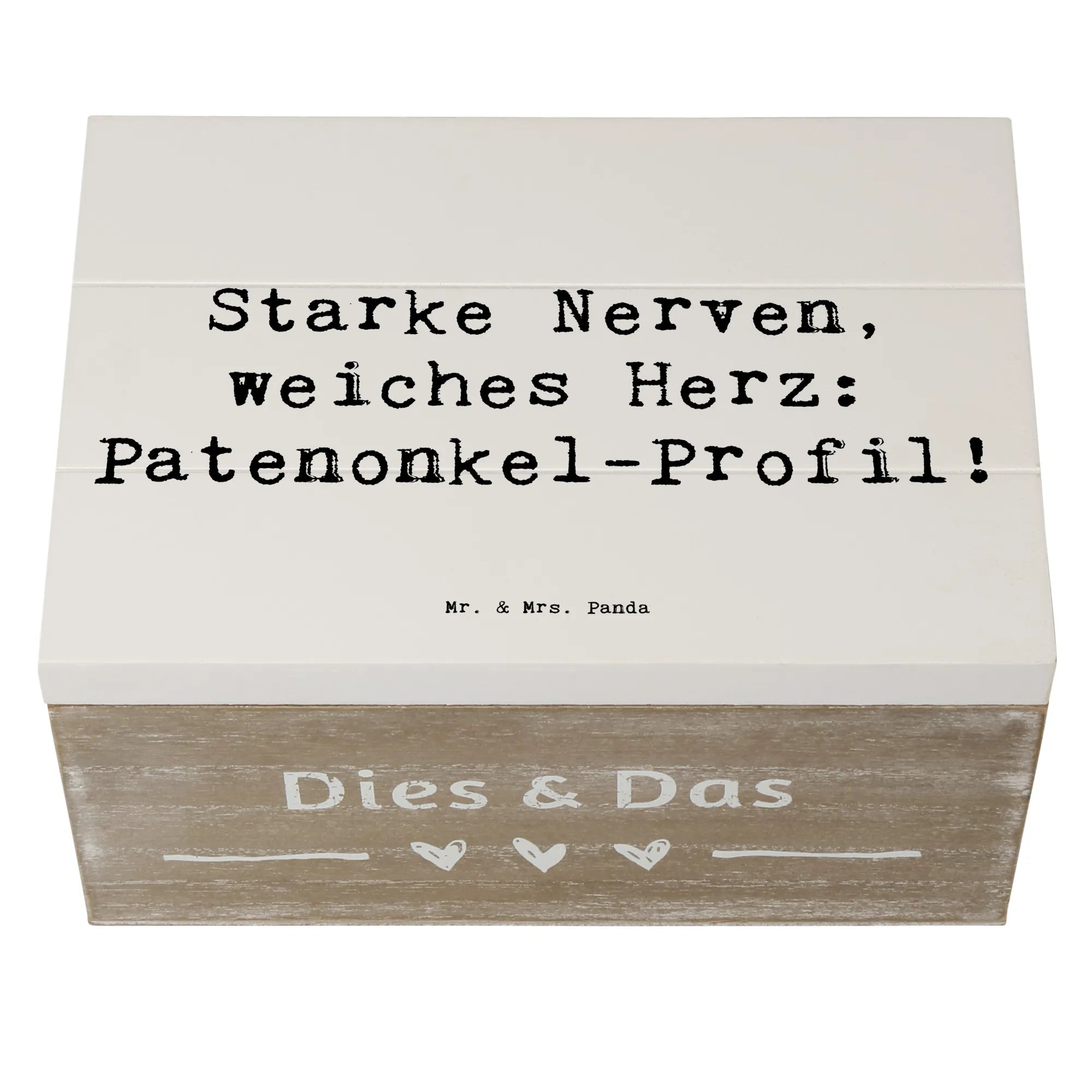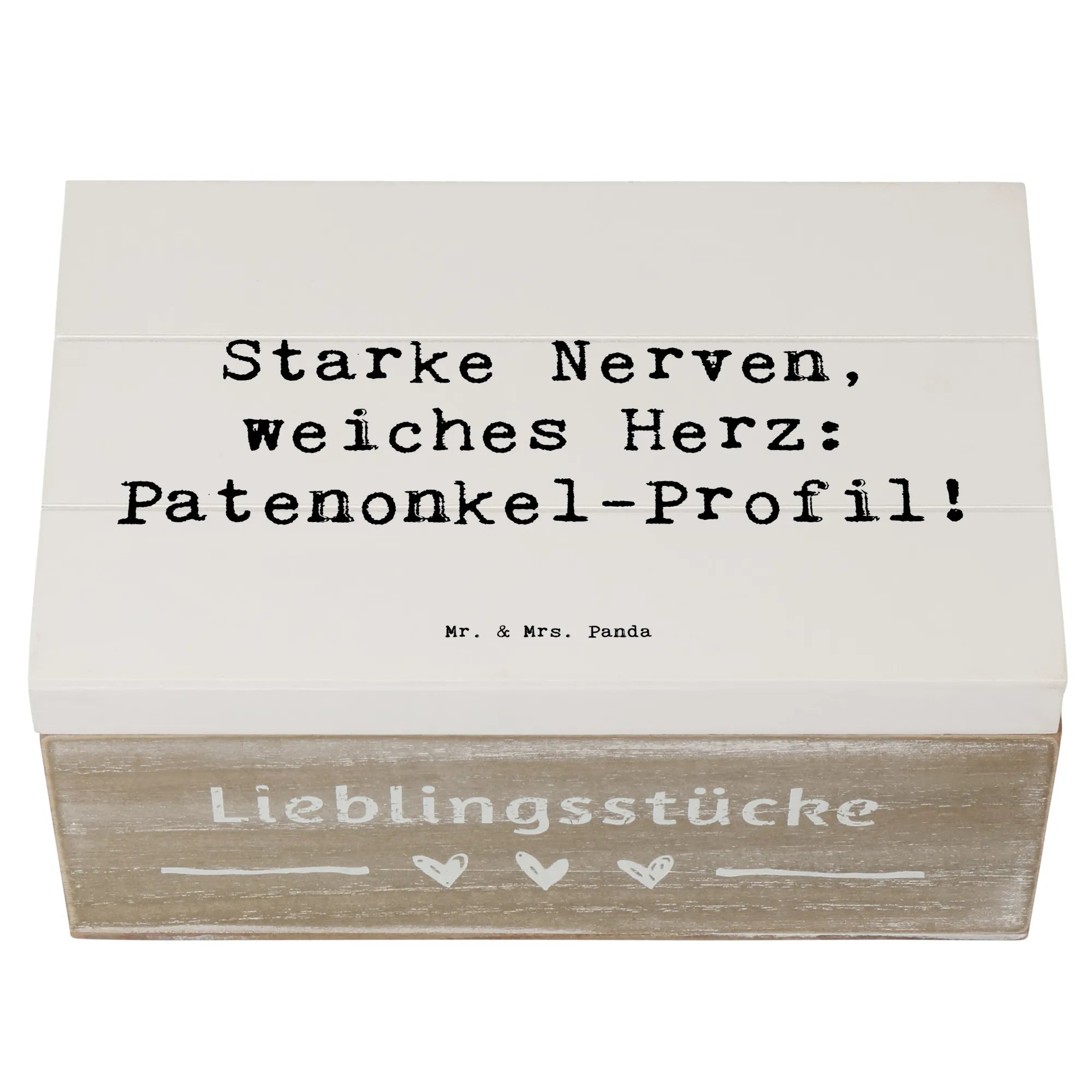 Die Holzkiste von Mr. & Mrs. Panda ist das perfekte Geschenk für Patenonkel, denn sie verkörpert die besondere Rolle, die sie im Leben ihrer Patenkinder spielen. Mit dem liebevollen Motto "Starke Nerven, weiches Herz: Patenonkel-Profil!" ist diese Kiste nicht nur eine wunderschöne Aufbewahrung für die kleinen Schätze des Lebens, sondern auch ein Ausdruck von Wertschätzung und Verbundenheit.