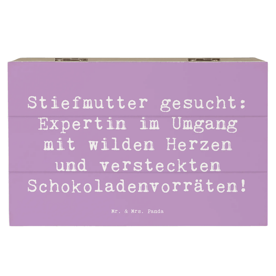 Die wunderschöne Holzkiste von Mr. & Mrs. Panda ist das perfekte Geschenk für alle, die eine Stiefmutter in ihrem Leben haben oder als Stiefmutter agieren. Mit dem charmanten Spruch "Stiefmutter gesucht: Expertin im Umgang mit wilden Herzen und versteckten Schokoladenvorräten!" ist diese Kiste nicht nur ein praktischer Aufbewahrungsort, sondern auch ein liebevolles Zeichen der Wertschätzung.
