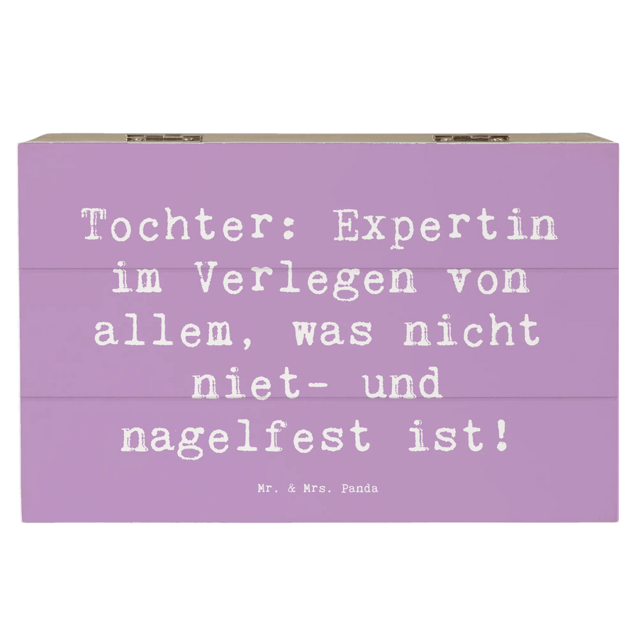 Die wunderschöne Holzkiste von Mr. & Mrs. Panda ist das ideale Geschenk für all jene, die ihre liebenswerten Erinnerungen stets bei sich tragen möchten. Mit dem liebevollen Motiv 'Tochter: Expertin im Verlegen von allem, was nicht niet- und nagelfest ist!' ist diese Kiste nicht nur praktisch, sondern strahlt auch eine besondere Wärme aus.