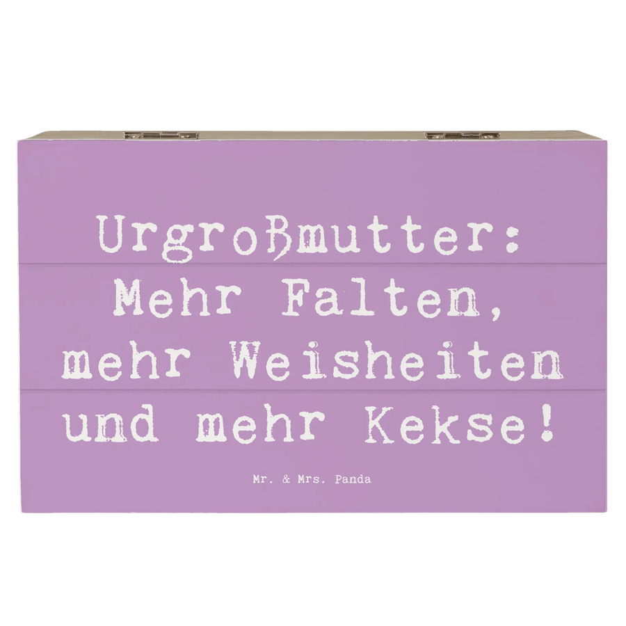 Die Holzkiste "Urgroßmutter: Mehr Falten, mehr Weisheiten und mehr Kekse!" von Mr. & Mrs. Panda ist das perfekte Geschenk für alle, die ihre Wurzeln ehren und die kostbaren Erinnerungen an die Urgroßmutter lebendig halten möchten. Diese wunderschöne Holzkiste ist nicht nur ein Blickfang, sondern auch ein idealer Aufbewahrungsort für Schätze, Erinnerungen und Traditionen, die von Generation zu Generation weitergegeben werden. Mit einem charmanten Design und einem liebevollen Spruch, der das Herz erwärmt, ist sie ein wunderbares Familienerbstück.