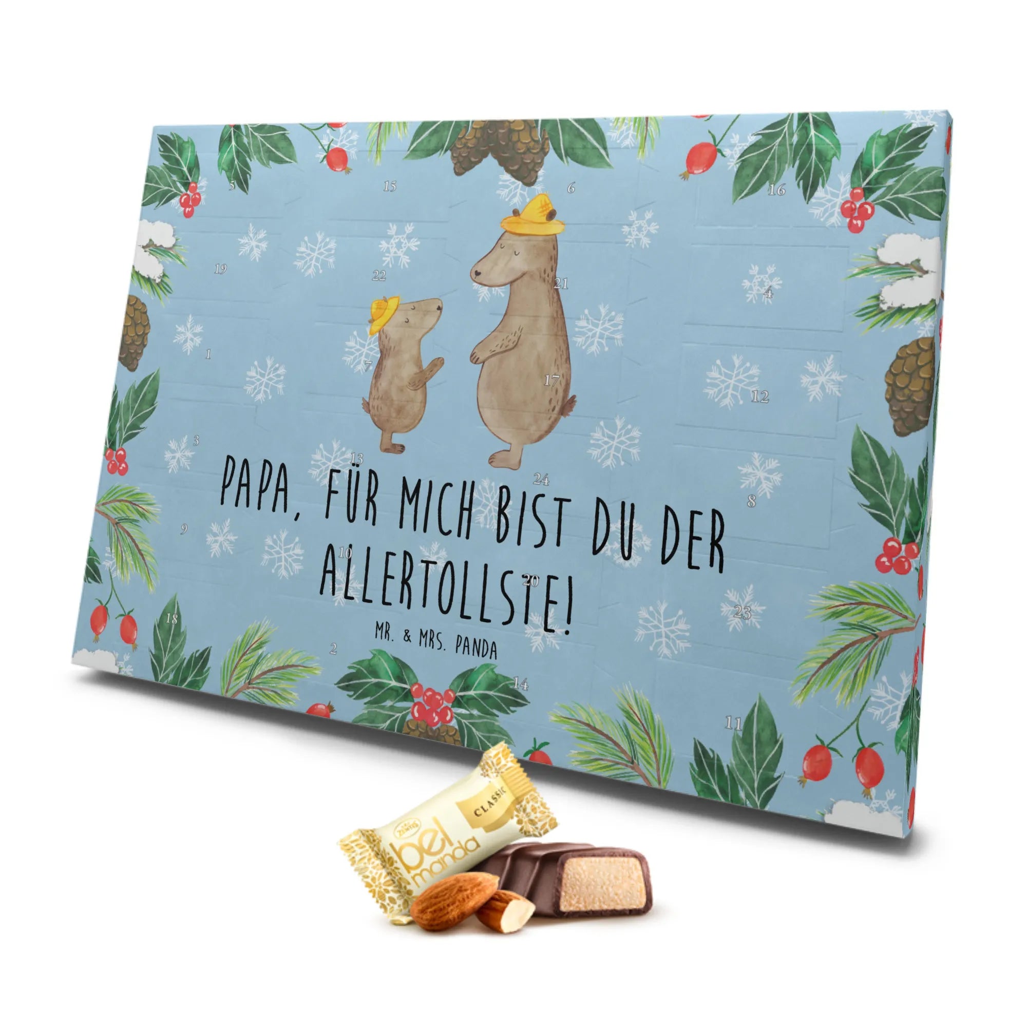 Schneide die hektischen Vorweihnachtstage auf und mache jedem „Papi“, „Papa“ oder „Vater“ eine Freude, die sie so schnell nicht vergessen werden. Die Familie bedeutet alles, und dieser Adventskalender von Mr. & Mrs. Panda feiert genau das mit Liebe, Freude und köstlichem Marzipan. Der perfekte Adventskalender für die Familie und alle, die ihr am Herzen liegen!